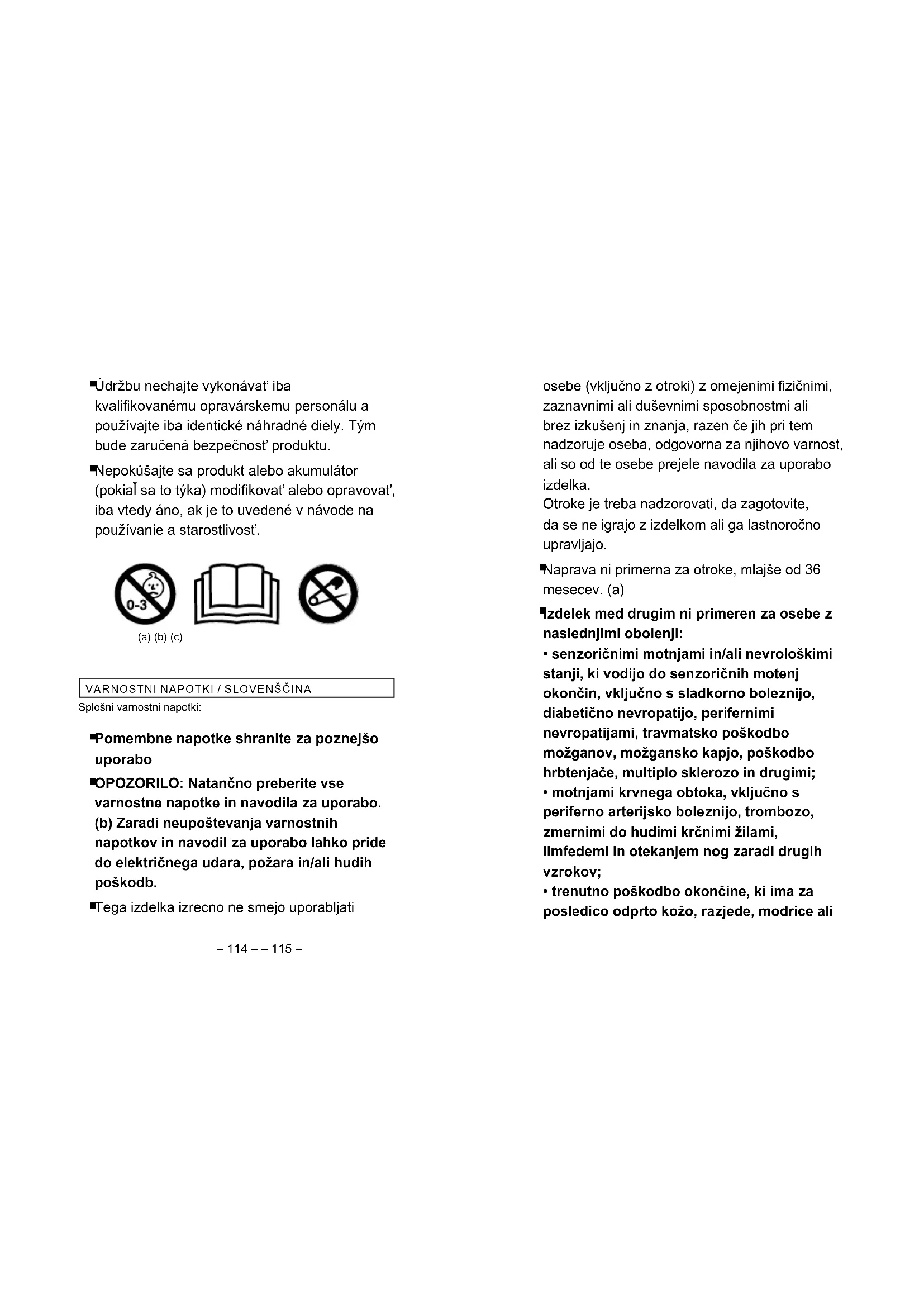 Nezapichujte do vnútra žiadne ihly alebo– 114 – – 115 – osebe (vključno z otroki) z omejenimi zičnimi, zaznavnimi ali duševnimi sposobnostmi ali brez izkušenj in znanja, razen če jih pri tem nadzoruje oseba, odgovorna za njihovo varnost, ali so od te osebe prejele navodila za uporabo izdelka. Otroke je treba nadzorovati, da zagotovite, da se ne igrajo z izdelkom ali ga lastnoročno upravljajo.