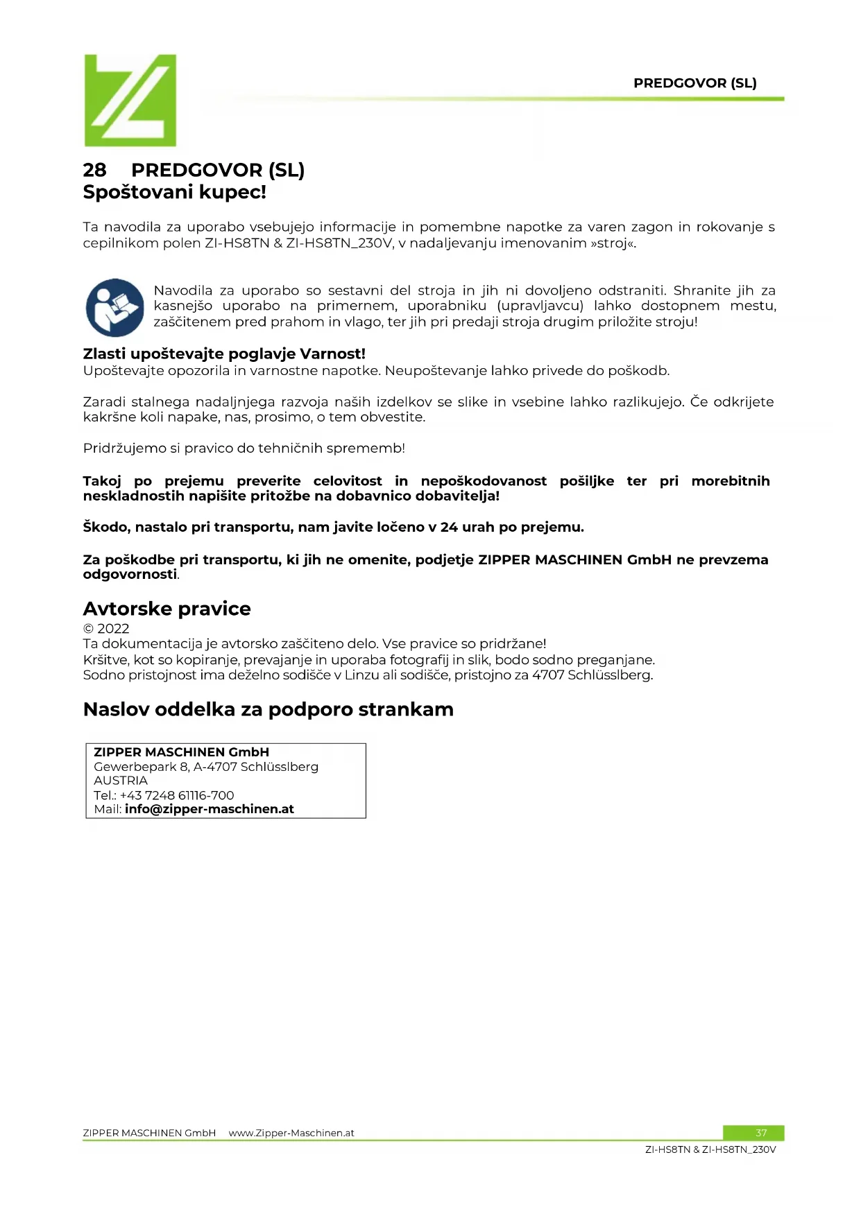Navodila za uporabo so sestavni del stroja in jih ni dovoljeno odstraniti. Shranite jih za kasnejšo uporabo na primernem, uporabniku (upravljavcu) lahko dostopnem mestu, zaščitenem pred prahom in vlago, ter jih pri predaji stroja drugim priložite stroju! Zlasti upoštevajte poglavje Varnost! Upoštevajte opozorila in varnostne napotke. Neupoštevanje lahko privede do poškodb. Zaradi stalnega nadaljnjega razvoja naših izdelkov se slike in vsebine lahko razlikujejo. Če odkrijete kakršne koli napake, nas, prosimo, o tem obvestite. Pridržujemo si pravico do tehničnih sprememb! Takoj po prejemu preverite celovitost in nepoškodovanost pošiljke ter pri morebitnih neskladnostih napišite pritožbe na dobavnico dobavitelja! Škodo, nastalo pri transportu, nam javite ločeno v 24 urah po prejemu. Za poškodbe pri transportu, ki jih ne omenite, podjetje ZIPPER MASCHINEN GmbH ne prevzema odgovornosti. Avtorske pravice © 2022 Ta dokumentacija je avtorsko zaščiteno delo. Vse pravice so pridržane! Kršitve, kot so kopiranje, prevajanje in uporaba fotografij in slik, bodo sodno preganjane. Sodno pristojnost ima deželno sodišče v Linzu ali sodišče, pristojno za 4707 Schlüsslberg. Naslov oddelka za podporo strankam