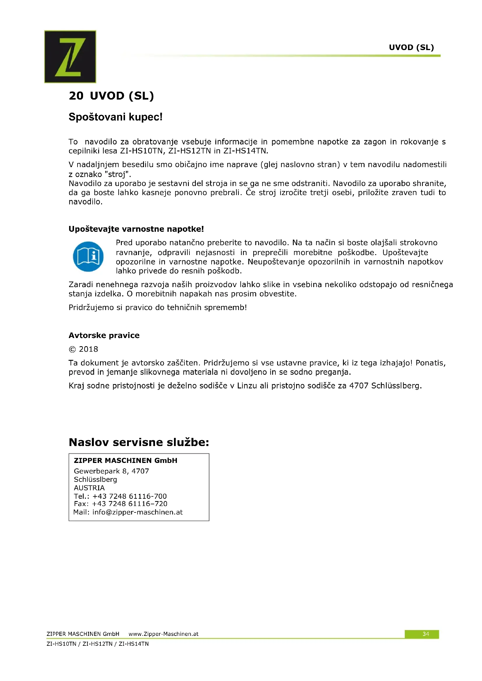All repairs on this machine must be carried out by a specialist for this product!UVOD (SL) ZIPPER MASCHINEN GmbH www.Zipper-Maschinen.at 34 ZI-HS10TN / ZI-HS12TN / ZI-HS14TN 20 UVOD (SL) Spoštovani kupec! To navodilo za obratovanje vsebuje informacije in pomembne napotke za zagon in rokovanje s cepilniki lesa ZI-HS10TN, ZI-HS12TN in ZI-HS14TN. V nadaljnjem besedilu smo običajno ime naprave (glej naslovno stran) v tem navodilu nadomestili z oznako "stroj". Navodilo za uporabo je sestavni del stroja in se ga ne sme odstraniti. Navodilo za uporabo shranite, da ga boste lahko kasneje ponovno prebrali. Če stroj izročite tretji osebi, priložite zraven tudi to navodilo. Upoštevajte varnostne napotke! Pred uporabo natančno preberite to navodilo. Na ta način si boste olajšali strokovno ravnanje, odpravili nejasnosti in preprečili morebitne poškodbe. Upoštevajte opozorilne in varnostne napotke. Neupoštevanje opozorilnih in varnostnih napotkov lahko privede do resnih poškodb. Zaradi nenehnega razvoja naših proizvodov lahko slike in vsebina nekoliko odstopajo od resničnega stanja izdelka. O morebitnih napakah nas prosim obvestite. Pridržujemo si pravico do tehničnih sprememb! Avtorske pravice © 2018 Ta dokument je avtorsko zaščiten. Pridržujemo si vse ustavne pravice, ki iz tega izhajajo! Ponatis, prevod in jemanje slikovnega materiala ni dovoljeno in se sodno preganja. Kraj sodne pristojnosti je deželno sodišče v Linzu ali pristojno sodišče za 4707 Schlüsslberg.