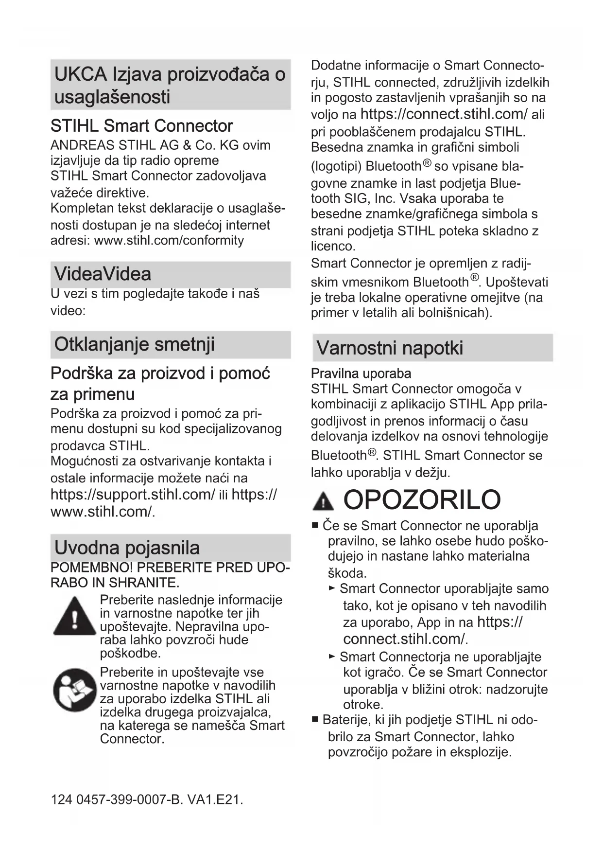 RABO IN SHRANITE. Preberite naslednje informacije in varnostne napotke ter jih upoštevajte. Nepravilna upo‐ raba lahko povzroči hude poškodbe. Preberite in upoštevajte vse varnostne napotke v navodilih za uporabo izdelka STIHL ali izdelka drugega proizvajalca, na katerega se namešča Smart Connector. Dodatne informacije o Smart Connecto‐ rju, STIHL connected, združljivih izdelkih in pogosto zastavljenih vprašanjih so na voljo na https://connect.stihl.com/ ali pri pooblaščenem prodajalcu STIHL. Besedna znamka in grafični simboli (logotipi) Bluetooth