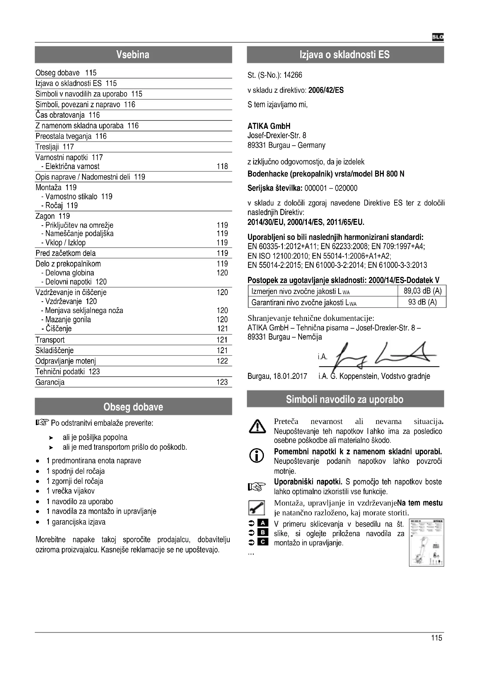 Izjava o skladnosti ES St. (S-No.): 14266 v skladu z direktivo: 2006/42/ES S tem izjavljamo mi, ATIKA GmbH Josef-Drexler-Str. 8 89331 Burgau – Germany z izključno odgovornostjo, da je izdelek Bodenhacke (prekopalnik) vrsta/model BH 800 N Serijska številka: 000001 – 020000 v skladu z določili zgoraj navedene Direktive ES ter z določili naslednjih Direktiv: 2014/30/EU, 2000/14/ES, 2011/65/EU. Uporabljeni so bili naslednjih harmonizirani standardi: EN 60335-1:2012+A11; EN 62233:2008; EN 709:1997+A4; EN ISO 12100:2010; EN 55014-1:2006+A1+A2; EN 55014-2:2015; EN 61000-3-2:2014; EN 61000-3-3:2013 Postopek za ugotavljanje skladnosti: 2000/14/ES-Dodatek V Izmerjen nivo zvočne jakosti L