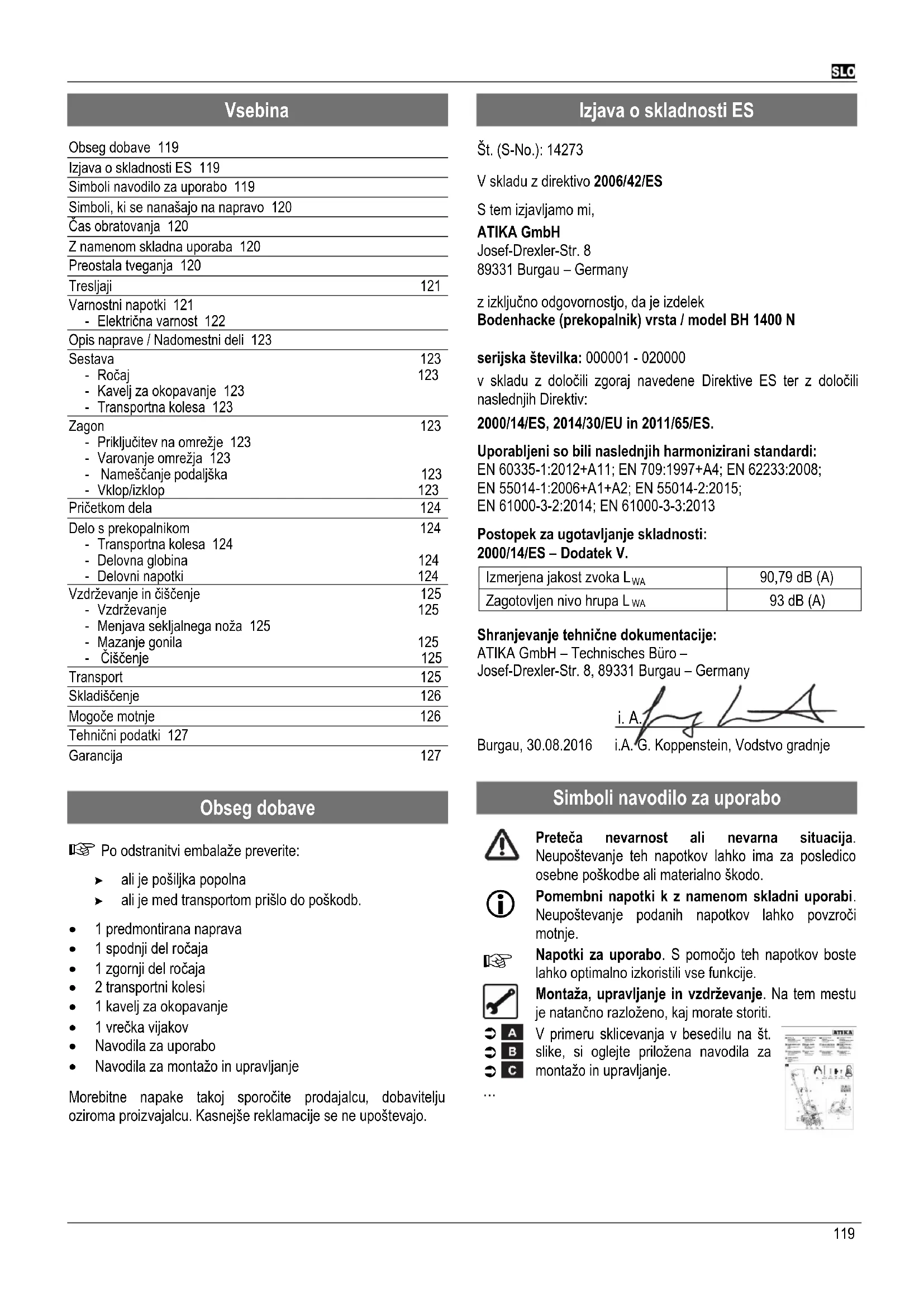 Záruka Prosíme, prečítajte a rešpektujte priložené záručné prehlásenie a jeho podmienky.119 Vsebina Obseg dobave 119 Izjava o skladnosti ES 119 Simboli navodilo za uporabo 119 Simboli, ki se nanašajo na napravo 120 Čas obratovanja 120 Z namenom skladna uporaba 120 Preostala tveganja 120 Tresljaji 121 Varnostni napotki 121 - Električna varnost 122 Opis naprave / Nadomestni deli 123 Sestava 123 - Ročaj 123 - Kavelj za okopavanje 123 - Transportna kolesa 123 Zagon 123 - Priključitev na omrežje 123 - Varovanje omrežja 123 - Nameščanje podaljška 123 - Vklop/izklop 123 Pričetkom dela 124 Delo s prekopalnikom 124 - Transportna kolesa 124 - Delovna globina 124 - Delovni napotki 124 Vzdrževanje in čiščenje 125 - Vzdrževanje 125 - Menjava sekljalnega noža 125 - Mazanje gonila 125 - Čiščenje 125 Transport 125 Skladiščenje 126 Mogoče motnje 126 Tehnični podatki 127 Garancija 127