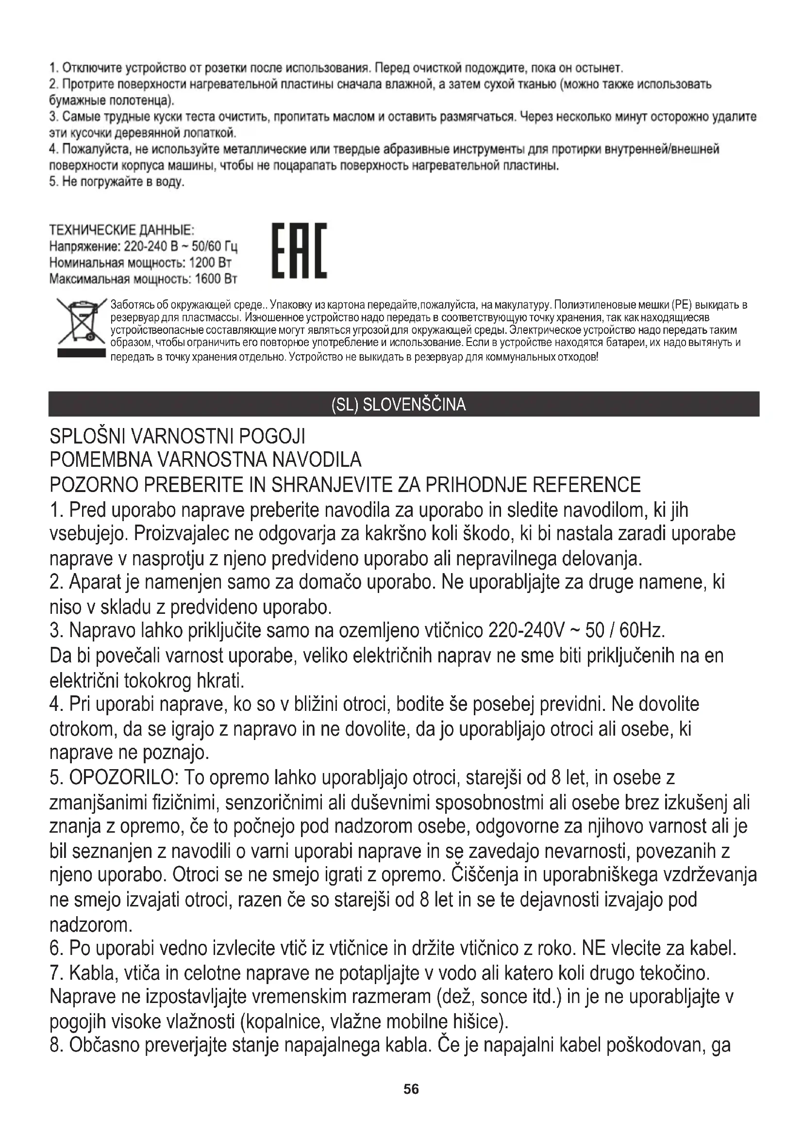 Skrbimo za okolje. Kartonska embalaža, prosim darovati na odpadni papir. Polietilenske vreče (PE) mečite v posoda za plastiko. Dotrajane naprave je treba vrniti na ustrezno zbirno mesto, ker vsebovane v napravo nevarne elemente lahko predstavljajo nevarnost za okolje. Električna naprava je treba vrniti kakor, da se omeji njegovo ponovno uporabo in izkoriščenost. Če naprava vsebuje baterio, je treba odstraniti in ločeno dati nazaj na mesta skladiščenja.59