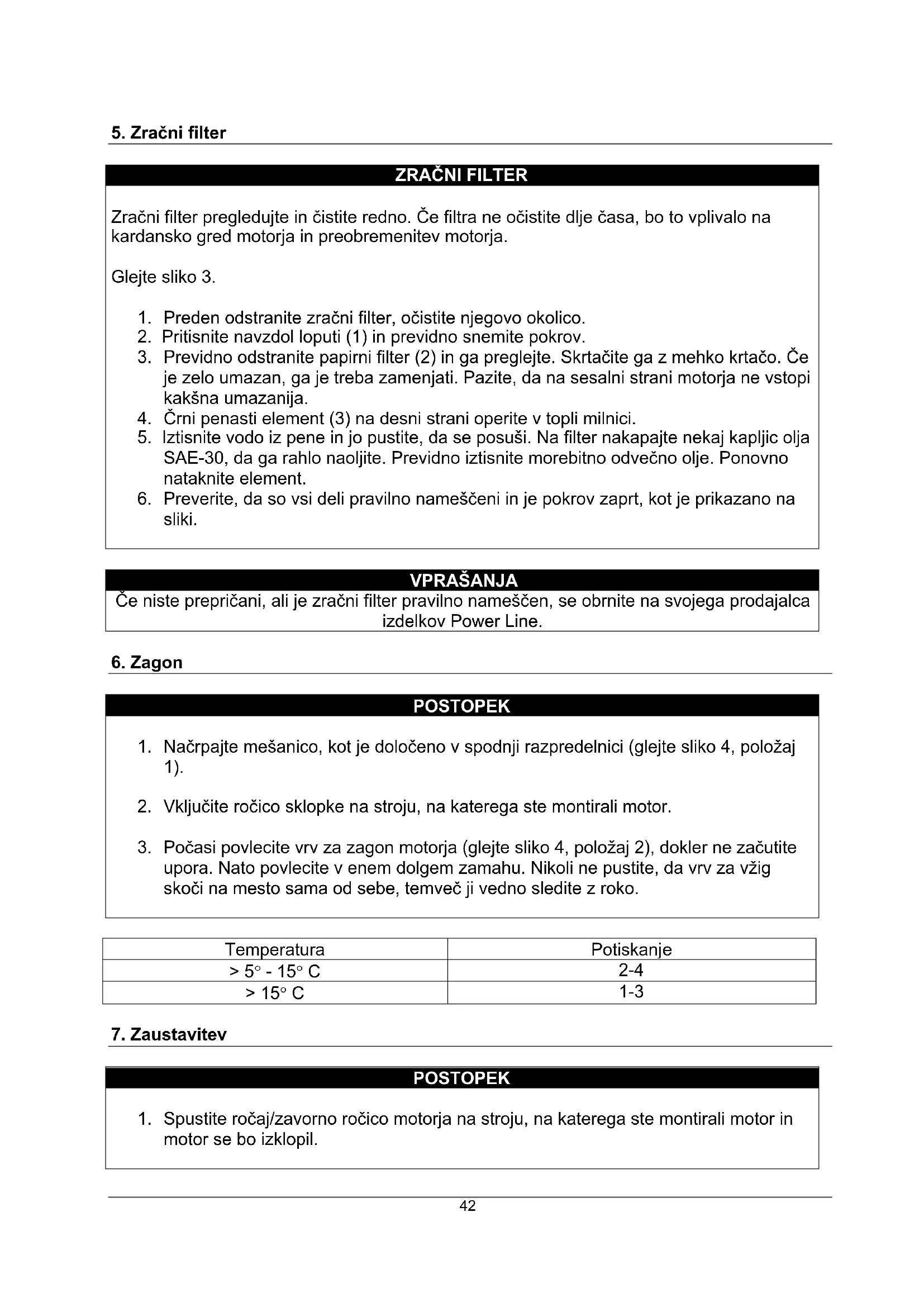 OPOMBA - Med delovanjem bodite pozorni na naslednje: - Izpušni plin ne sme biti črn. Če se to zgodi, je motor preveč obremenjen ali pa ga niste pravilno nastavili. - Ni nepravilnih zvokov in vibracij. - Če opazite kar koli od zgoraj naštetega, ugasnite motor in ga nastavite ali pa se obrnite na svojega prodajalca izdelkov Power Line.
