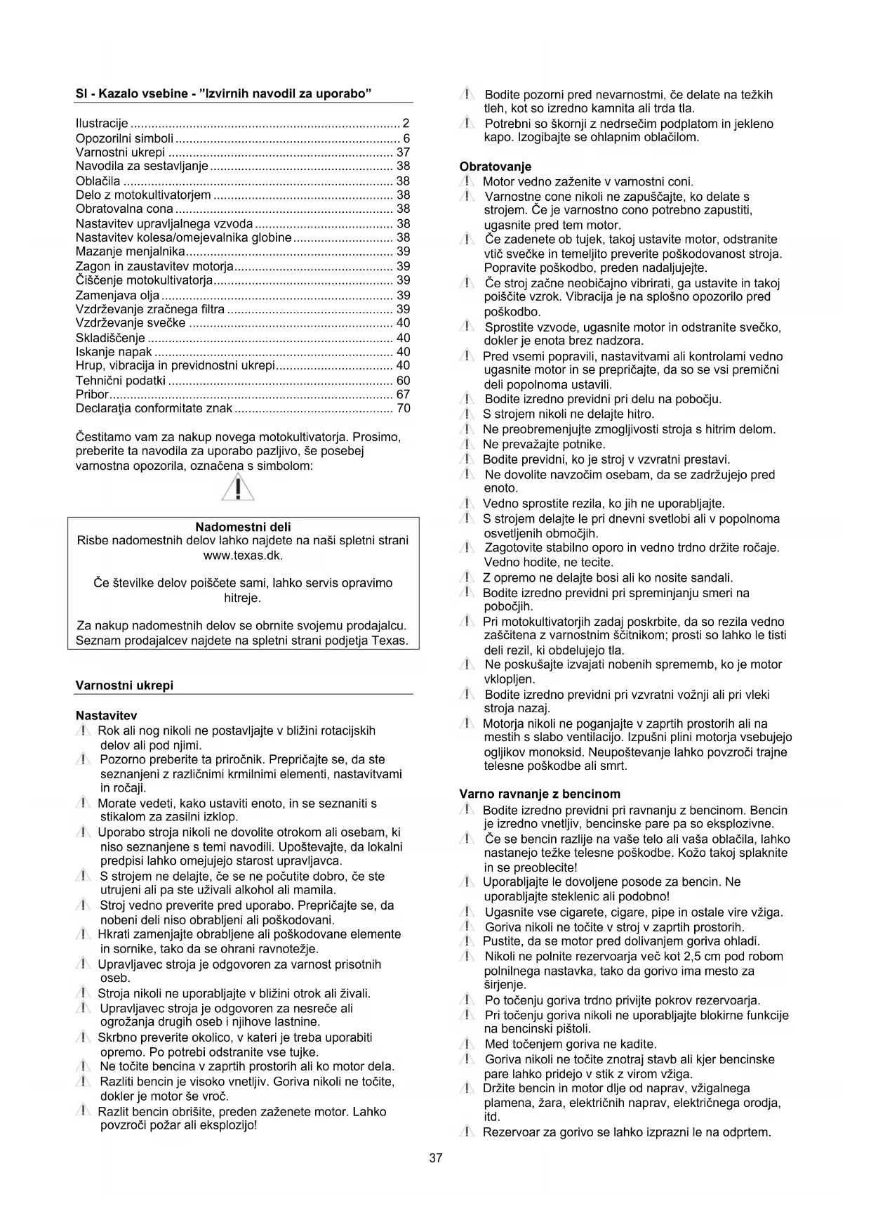 Nadomestni deli Risbe nadomestnih delov lahko najdete na naši spletni strani www.texas.dk. Če številke delov poiščete sami, lahko servis opravimo hitreje. Za nakup nadomestnih delov se obrnite svojemu prodajalcu. Seznam prodajalcev najdete na spletni strani podjetja Texas.