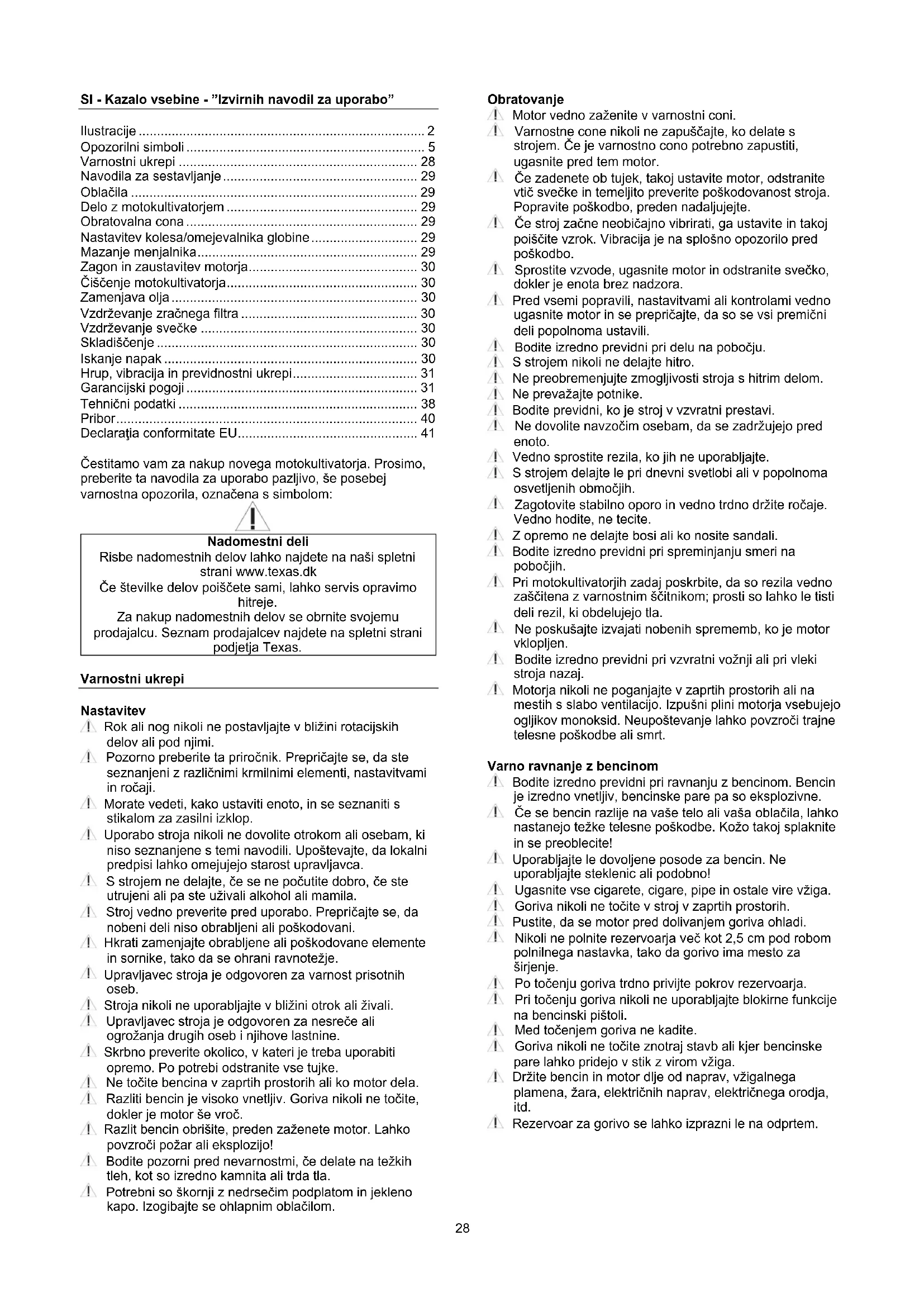 - Declaraţia conformitate EU Čestitamo vam za nakup novega motokultivatorja. Prosimo, preberite ta navodila za uporabo pazljivo, še posebej varnostna opozorila, označena s simbolom: Nadomestni deli Risbe nadomestnih delov lahko najdete na naši spletni strani www.texas.dk Če številke delov poiščete sami, lahko servis opravimo hitreje. Za nakup nadomestnih delov se obrnite svojemu prodajalcu. Seznam prodajalcev najdete na spletni strani podjetja Texas. Varnostni ukrepi Nastavitev Rok ali nog nikoli ne postavljajte v bližini rotacijskih delov ali pod njimi. Pozorno preberite ta priročnik. Prepričajte se, da ste seznanjeni z različnimi krmilnimi elementi, nastavitvami in ročaji. Morate vedeti, kako ustaviti enoto, in se seznaniti s stikalom za zasilni izklop. Uporabo stroja nikoli ne dovolite otrokom ali osebam, ki niso seznanjene s temi navodili. Upoštevajte, da lokalni predpisi lahko omejujejo starost upravljavca. S strojem ne delajte, če se ne počutite dobro, če ste utrujeni ali pa ste uživali alkohol ali mamila. Stroj vedno preverite pred uporabo. Prepričajte se, da nobeni deli niso obrabljeni ali poškodovani. Hkrati zamenjajte obrabljene ali poškodovane elemente in sornike, tako da se ohrani ravnotežje. Upravljavec stroja je odgovoren za varnost prisotnih oseb. Stroja nikoli ne uporabljajte v bližini otrok ali živali. Upravljavec stroja je odgovoren za nesreče ali ogrožanja drugih oseb i njihove lastnine. Skrbno preverite okolico, v kateri je treba uporabiti opremo. Po potrebi odstranite vse tujke. Ne točite bencina v zaprtih prostorih ali ko motor dela. Razliti bencin je visoko vnetljiv. Goriva nikoli ne točite, dokler je motor še vroč. Razlit bencin obrišite, preden zaženete motor. Lahko povzroči požar ali eksplozijo! Bodite pozorni pred nevarnostmi, če delate na težkih tleh, kot so izredno kamnita ali trda tla. Potrebni so škornji z nedrsečim podplatom in jekleno kapo. Izogibajte se ohlapnim oblačilom. Obratovanje Motor vedno zaženite v varnostni coni. Varnostne cone nikoli ne zapuščajte, ko delate s strojem. Če je varnostno cono potrebno zapustiti, ugasnite pred tem motor. Če zadenete ob tujek, takoj ustavite motor, odstranite vtič svečke in temeljito preverite poškodovanost stroja. Popravite poškodbo, preden nadaljujejte. Če stroj začne neobičajno vibrirati, ga ustavite in takoj poiščite vzrok. Vibracija je na splošno opozorilo pred poškodbo. Sprostite vzvode, ugasnite motor in odstranite svečko, dokler je enota brez nadzora. Pred vsemi popravili, nastavitvami ali kontrolami vedno ugasnite motor in se prepričajte, da so se vsi premični deli popolnoma ustavili. Bodite izredno previdni pri delu na pobočju. S strojem nikoli ne delajte hitro. Ne preobremenjujte zmogljivosti stroja s hitrim delom. Ne prevažajte potnike. Bodite previdni, ko je stroj v vzvratni prestavi. Ne dovolite navzočim osebam, da se zadržujejo pred enoto. Vedno sprostite rezila, ko jih ne uporabljajte. S strojem delajte le pri dnevni svetlobi ali v popolnoma osvetljenih območjih. Zagotovite stabilno oporo in vedno trdno držite ročaje. Vedno hodite, ne tecite. Z opremo ne delajte bosi ali ko nosite sandali. Bodite izredno previdni pri spreminjanju smeri na pobočjih. Pri motokultivatorjih zadaj poskrbite, da so rezila vedno zaščitena z varnostnim ščitnikom; prosti so lahko le tisti deli rezil, ki obdelujejo tla. Ne poskušajte izvajati nobenih sprememb, ko je motor vklopljen. Bodite izredno previdni pri vzvratni vožnji ali pri vleki stroja nazaj. Motorja nikoli ne poganjajte v zaprtih prostorih ali na mestih s slabo ventilacijo. Izpušni plini motorja vsebujejo ogljikov monoksid. Neupoštevanje lahko povzroči trajne telesne poškodbe ali smrt. Varno ravnanje z bencinom Bodite izredno previdni pri ravnanju z bencinom. Bencin je izredno vnetljiv, bencinske pare pa so eksplozivne. Če se bencin razlije na vaše telo ali vaša oblačila, lahko nastanejo težke telesne poškodbe. Kožo takoj splaknite in se preoblecite! Uporabljajte le dovoljene posode za bencin. Ne uporabljajte steklenic ali podobno! Ugasnite vse cigarete, cigare, pipe in ostale vire vžiga. Goriva nikoli ne točite v stroj v zaprtih prostorih. Pustite, da se motor pred dolivanjem goriva ohladi. Nikoli ne polnite rezervoarja več kot 2,5 cm pod robom polnilnega nastavka, tako da gorivo ima mesto za širjenje. Po točenju goriva trdno privijte pokrov rezervoarja. Pri točenju goriva nikoli ne uporabljajte blokirne funkcije na bencinski pištoli. Med točenjem goriva ne kadite. Goriva nikoli ne točite znotraj stavb ali kjer bencinske pare lahko pridejo v stik z virom vžiga. Držite bencin in motor dlje od naprav, vžigalnega plamena, žara, električnih naprav, električnega orodja, itd. Rezervoar za gorivo se lahko izprazni le na odprtem.29 p. 41