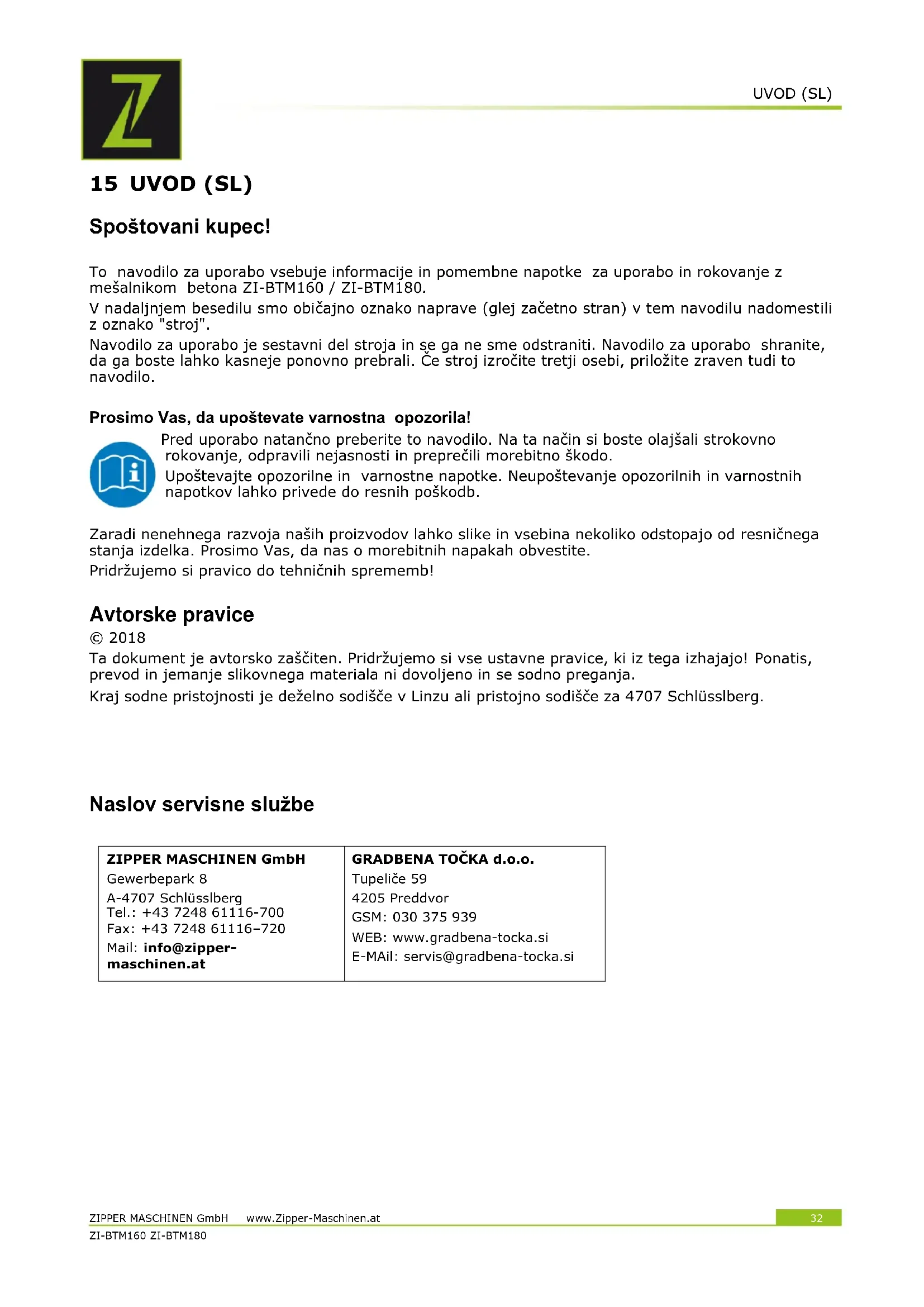 Should you in necessary repairs not able to properly to perform or you have not the prescribed training for it always attract a workshop to fix the problem.UVOD (SL) ZIPPER MASCHINEN GmbH www.Zipper-Maschinen.at 32 ZI-BTM160 ZI-BTM180 15 UVOD (SL) Spoštovani kupec! To navodilo za uporabo vsebuje informacije in pomembne napotke za uporabo in rokovanje z mešalnikom betona ZI-BTM160 / ZI-BTM180. V nadaljnjem besedilu smo običajno oznako naprave (glej začetno stran) v tem navodilu nadomestili z oznako "stroj". Navodilo za uporabo je sestavni del stroja in se ga ne sme odstraniti. Navodilo za uporabo shranite, da ga boste lahko kasneje ponovno prebrali. Če stroj izročite tretji osebi, priložite zraven tudi to navodilo. Prosimo Vas, da upoštevate varnostna opozorila! Pred uporabo natančno preberite to navodilo. Na ta način si boste olajšali strokovno rokovanje, odpravili nejasnosti in preprečili morebitno škodo. Upoštevajte opozorilne in varnostne napotke. Neupoštevanje opozorilnih in varnostnih napotkov lahko privede do resnih poškodb. Zaradi nenehnega razvoja naših proizvodov lahko slike in vsebina nekoliko odstopajo od resničnega stanja izdelka. Prosimo Vas, da nas o morebitnih napakah obvestite. Pridržujemo si pravico do tehničnih sprememb! Avtorske pravice © 2018 Ta dokument je avtorsko zaščiten. Pridržujemo si vse ustavne pravice, ki iz tega izhajajo! Ponatis, prevod in jemanje slikovnega materiala ni dovoljeno in se sodno preganja. Kraj sodne pristojnosti je deželno sodišče v Linzu ali pristojno sodišče za 4707 Schlüsslberg.