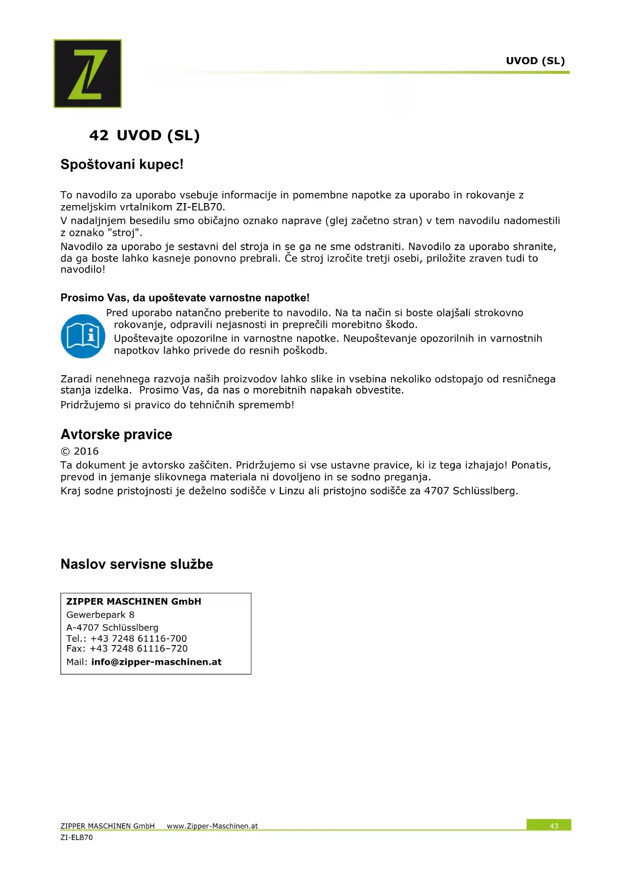POKYN Pokud nejste schopni nutnou opravu provést nebo k tomu nemáte dostatečné vzdělání, obraťte se na odborný servis.UVOD (SL) ZIPPER MASCHINEN GmbH www.Zipper-Maschinen.at 43 ZI-ELB70 43 42 UVOD (SL) Spoštovani kupec! To navodilo za uporabo vsebuje informacije in pomembne napotke za uporabo in rokovanje z zemeljskim vrtalnikom ZI-ELB70. V nadaljnjem besedilu smo običajno oznako naprave (glej začetno stran) v tem navodilu nadomestili z oznako "stroj". Navodilo za uporabo je sestavni del stroja in se ga ne sme odstraniti. Navodilo za uporabo shranite, da ga boste lahko kasneje ponovno prebrali. Če stroj izročite tretji osebi, priložite zraven tudi to navodilo! Prosimo Vas, da upoštevate varnostne napotke! Pred uporabo natančno preberite to navodilo. Na ta način si boste olajšali strokovno rokovanje, odpravili nejasnosti in preprečili morebitno škodo. Upoštevajte opozorilne in varnostne napotke. Neupoštevanje opozorilnih in varnostnih napotkov lahko privede do resnih poškodb. Zaradi nenehnega razvoja naših proizvodov lahko slike in vsebina nekoliko odstopajo od resničnega stanja izdelka. Prosimo Vas, da nas o morebitnih napakah obvestite. Pridržujemo si pravico do tehničnih sprememb! Avtorske pravice © 2016 Ta dokument je avtorsko zaščiten. Pridržujemo si vse ustavne pravice, ki iz tega izhajajo! Ponatis, prevod in jemanje slikovnega materiala ni dovoljeno in se sodno preganja. Kraj sodne pristojnosti je deželno sodišče v Linzu ali pristojno sodišče za 4707 Schlüsslberg.