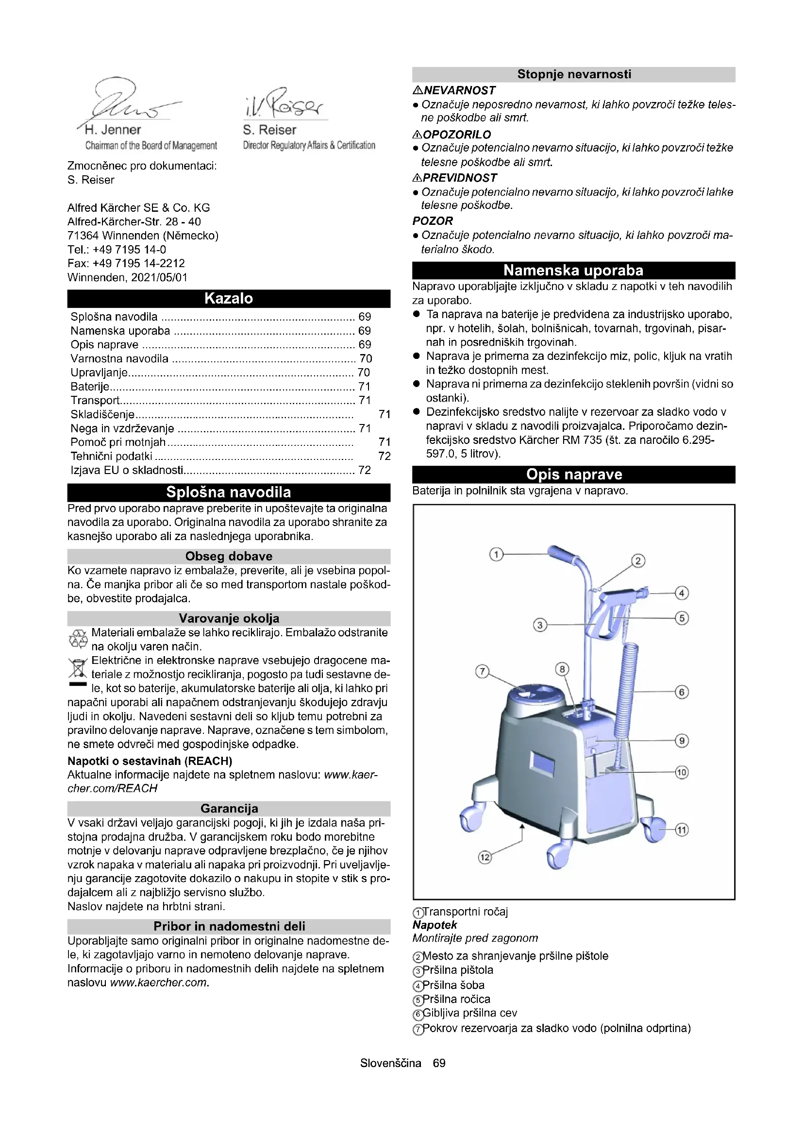 Varnostna navodila Splošna varnostna navodila NEVARNOST ● Nevarnost zadušitve. Otrokom preprečite stik z embalažno folijo. 몇 OPOZORILO ● Napravo uporabljajte samo v skladu z name- nom uporabe. Upoštevajte krajevne danosti in pri delu z napravo pazite na tretje osebe, zlasti na otroke. ● Osebe z zmanjšanimi telesnimi, čutnimi ali duševnimi sposobnostmi oziroma s pomanj- kljivimi izkušnjami in znanjem smejo uporabljati napravo samo pod ustreznim nadzorom ali če so jih osebe, pristojne za njihovo varnost, poučile o varni uporabi naprave in če razumejo potenci- alne nevarnosti. ● Napravo smejo uporabljati samo osebe, pou- čene o ravnanju z napravo, ali osebe, ki so dokazale svoje sposobnosti za upravljanje in so izrecno pooblaščene za uporabo naprave. ● Otroci ne smejo uporabljati naprave. ● Otrokom pre- prečite igro z napravo. 몇 PREVIDNOST ● Varnostna navodila so namenjena vaši var- nosti. Varnostnih navodil nikoli ne spreminjajte in jih vedno upo- števajte. Nevarnost električnega udara NEVARNOST ● Naprave s stopnjo zaščite I priključite samo na pravilno ozemljeni vir električnega toka. ● Navedena napetost na tipski ploščici mora biti skladna z napetostjo vira električnega toka. ● Omrežnega vtiča in vtičnice nikoli ne prijemajte z vlažnimi rokami. 몇 OPOZORILO ● Pri netesnostih takoj izklopite napravo. ● Pred vsako uporabo preverite, ali je električni priključni kabel z električnim vtičem poškodovan. Naprave s poškodovanim elek- tričnim priključnim kablom ne zaženite. Poškodovan električni priključni kabel mora takoj zamenjati pooblaščena servisna služ- ba ali strokovnjak za elektriko. ● Uporabljajte samo omrežni priključni kabel, ki ga predpiše proizvajalec. Obratovanje NEVARNOST ● Pri uporabi naprave v nevarnih območjih (npr. na bencinskih postajah) upoštevajte ustrezne varnostne predpise. ● Delovanje naprave v potencialno eksplozivnih atmos- ferah je prepovedano. ● Nikoli ne pršite eksplozivnih tekočin, kot so bencin, razredčilo za barve ali kurilno olje, ki lahko z zrakom tvorijo eksplozivne hlape ali zmesi. Ne pršite acetona, nerazred- čenih kislin, razredčil ali močno jedkih snovi, kot je aktivni klor, saj napadajo materiale, uporabljene na napravi. ● Naprave ne upo- rabljajte za dezinfekcijo električnih naprav, npr. pečic, nap, mikro- valovnih pečic, televizorjev, svetilk, sušilnikov, električnih grelnikov itd. 몇 PREVIDNOST ● Pred vsako uporabo preverite brezhibnost in obratovalno varnost naprave ter pribora, zlasti električnega priključnega kabla in kabelskega podaljška. V primeru poškodbe izvlecite električni vtič in ne uporabljajte naprave. POZOR ● Naprave ne uporabljajte pri temperaturi pod 0 °C. ● Upoštevajte varnostni pregled za prenosno industrijsko opremo v skladu z lokalno veljavnimi predpisi. Obratovanje z dezinfekcijskim sredstvom 몇 PREVIDNOST ● Dezinfekcijska sredstva hranite izven dose- ga otrok. ● Priporočenih dezinfekcijskih sredstev ne uporabljajte nerazredčenih. Vedno upoštevajte vse podatke na etiketi izdelka. Če dezinfekcijsko sredstvo zaužijete ali če dezinfekcijsko sredstvo pride v stik z očmi, ga takoj temeljito sperite z vodo in nemudoma obiščite zdravnika. ● Uporabljajte samo dezinfekcij- ska sredstva, ki jih priporoča proizvajalec, in upoštevajte navodila za uporabo in odstranjevanje ter opozorila proizvajalcev dezin- fekcijskih sredstev. ● Poskrbite za ustrezno prezračevanje delov- nega območja, da se izognete vdihavanju aerosolov. V slabo prezračevanih prostorih nosite primerno zaščito dihal. Nega in vzdrževanje 몇 OPOZORILO ● Napravo morate pred čiščenjem, vzdrževa- njem in zamenjavo njenih delov izklopiti. Pri napravah, ki se na- pajajo iz električnega omrežja, izvlecite omrežni vtič. Pri napravah, ki delujejo na baterije, odstranite baterijo. 몇 PREVIDNOST ● Popravila naj izvajajo pooblaščeni servisi ali strokovnjaki za to področje, ki poznajo vse ustrezne varnostne predpise. POZOR ● Kratek stik ali druga škoda. Naprave ne čistite z vod- nim curkom iz gibke cevi ali z visokotlačnim curkom. Upravljanje Zagon NEVARNOST Neustrezna dezinfekcijska sredstva Nevarnost telesnih poškodb Uporabljajte samo izdelke KÄRCHER. Nikoli ne dolivajte topil, vnetljivih tekočin (npr. bencina, acetona, razredčila) ali dezinfekcijskih sredstev na osnovi alkohola. Pri rokovanju z dezinfekcijskimi čistili uporabljajte zaščitne roka- vice in zaščitna očala. Preprečite stik z očmi in kožo. Upoštevajte varnostna navodila in navodila za rokovanje na eti- ketah izdelkov ali v varnostnih listih dezinfekcijskega sredstva. 몇 OPOZORILO Nevarnost telesnih poškodb Preverite, ali so naprava, pribor, dovodi in priključki v brezhibnem stanju. Naprave ne uporabljajte, če navedeni elementi niso v brezhibnem stanju. 1 Preverite stanje napolnjenosti baterije na prikazu napolnje- nosti baterije na napravi. Zelena kontrolna lučka – polnjenje baterije ni potrebno Rumena kontrolna lučka – polnjenje baterije je priporočljivo Rdeča kontrolna lučka – napolnite baterijo Za navodila o polnjenju baterije glejte poglavje »Baterija«. 2 Napolnite rezervoar za sladko vodo, vendar ne prekomerno. Zaprite pokrov rezervoarja za sladko vodo v smeri puščice (bajonet). Napotek: Če ste napravo že uporabljali, je v rezervoarju priso- ten podtlak in pokrov je težko odpreti. V tem primeru počakaj- te, da se podtlak sprosti.Slovenščina 71 3 Priporočenemu dezinfekcijskemu sredstvu primešajte malo vode (po navodilih proizvajalca) in mešanico vlijte v vodo v re- zervoarju za svežo vodo. 4 Pri nanašanju dezinfekcijskega sredstva se prepričajte, da je vzorec pršenja pršilne šobe brezhiben. Preverite pred vsakim obratovanjem. Po potrebi očistite ali zamenjajte. Obratovanje 몇 OPOZORILO Nevarnost za zdravje V prostorih s slabim prezračevanjem uporabljajte zaščitno ma- sko. POZOR Pri delu se prepričajte, da je vz