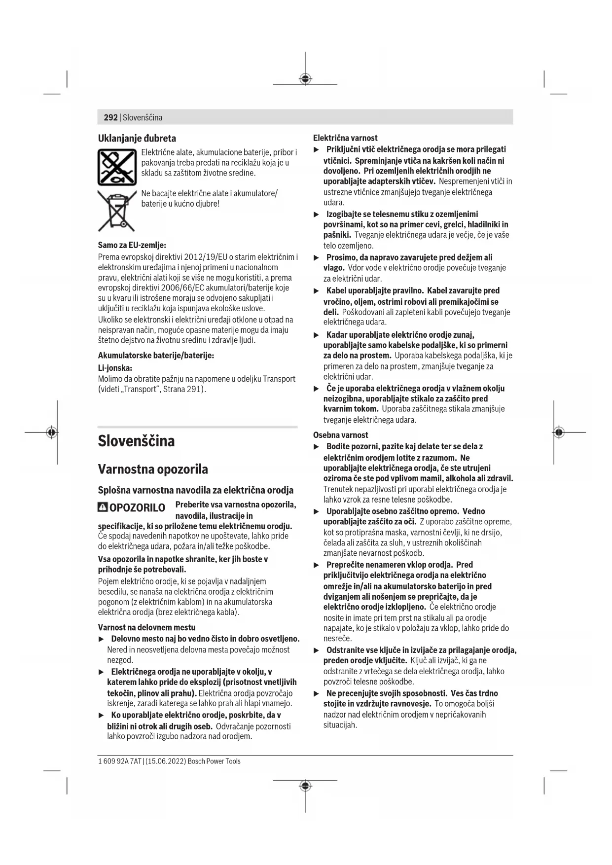 Brušenje tankih pločevin ali drugih rahlo tresočih materialov z veliko površino lahko povzroči povečane vrednosti emisij hrupa do 15dB. S primernimi težjimi blažilnimi blazinami lahko povečano emisijo hrupa znižate. Povečano emisijo hrupa je treba upoštevati tako pri oceni tveganja moči hrupa kot pri izbiri primerne zaščite za sluh. Vrednosti nivoja tresljajev in hrupa, podane v teh navodilih, so bile izmerjene v skladu s standardiziranim merilnim postopkom in se lahko uporabljajo za medsebojno primerjavo električnih orodij. Primerne so tudi za začasno oceno oddajanja tresljajev in hrupa. Naveden nivo tresljajev in hrupa je določen na osnovi glavnih načinov uporabe električnega orodja. Pri uporabi orodja v drugačne namene, z drugačnimi nastavki ali pri nezadostnem vzdrževanju lahko nivo hrupa in tresljajev odstopa. To lahko obremenjenost s hrupom in tresljaji v celotnem obdobju uporabe občutno poveča. Za natančnejšo oceno obremenjenosti s hrupom in tresljaji morate upoštevati tudi čas, ko je orodje izklopljeno, in čas, ko orodje deluje, vendar dejansko ni v uporabi. To lahko občutno zmanjša obremenjenost s hrupom in tresljaji, ki je razporejena na celotno obdobje uporabe. Določite dodatne varnostne ukrepe za zaščito uporabnika pred vplivi tresljajev, npr. vzdrževanje električnega orodja in nastavkov, segrevanje rok, organizacija delovnih postopkov. Izklop pri povratnem udarcu Če pride do nenadnega povratnega udarca električnega orodja (npr. zaradi blokade pri rezanju), elektronika prekine napajanje motorja. Bosch Power Tools 1 609 92A 7AT | (15.06.2022)298 | Slovenščina Za ponovni zagon najprej potisnite stikalo za vklop/izklop (8) v položaj za izklop in šele nato ponovno vklopite električno orodje. Zavora izteka Električno orodje je opremljeno z Boschevim elektronskim zavornim sistemom. Po izklopu se brusilni nastavek v le nekaj sekundah povsem zaustavi. V primerjavi s kotnimi brusilniki brez zavore izteka to pomeni znatno krajše ustavljanje orodja, kar omogoča hitrejšo odložitev električnega orodja. Mehak zagon Elektronski počasen zagon omeji vrtilni moment ob vklopu in omogoči zagon električnega orodja brez tresljajev. Opomba: če električno orodje takoj po vklopu deluje s polnim številom vrtljajev, potem počasen zagon in zaščita pred ponovnim vklopom ne delujeta. Električno orodje je treba nemudoma poslati naši servisni službi, naslove lahko najdete v razdelku „Servisna služba in svetovanje glede uporabe“. Zaščita pred ponovnim zagonom Zaščita pred ponovnim zagonom prepreči nenadzorovan vklop električnega orodja po prekinitvi električnega napajanja. Za ponovni zagon stikalo za vklop/izklop (8) najprej namestite v izklopljeni položaj in nato električno orodje ponovno vklopite. Izklop ob padcu orodja Integrirana funkcija izklopa ob padcu električno orodje izklopi takoj, ko ob padcu prileti na tla. Za ponovni zagon stikalo za vklop/izklop(8) najprej pomaknite v položaj za izklop in nato električno orodje znova vklopite. Akumulatorska baterija PodjetjeBosch prodaja akumulatorska električna orodja tudi brez priložene akumulatorske baterije. Ali je v obseg dobave vključena tudi akumulatorska baterija, je navedeno na embalaži. Polnjenje akumulatorske baterije u Uporabljajte samo polnilnike, ki so navedeni v tehničnih podatkih. Samo ti polnilniki so usklajeni z litij- ionsko akumulatorsko baterijo, ki je nameščena v električnem orodju. Opomba: litij-ionske akumulatorske baterije se zaradi mednarodnih transportnih predpisov dobavljajo delno napolnjene. Da zagotovite polno zmogljivost akumulatorske baterije, jo pred prvo uporabo popolnoma napolnite. Namestitev akumulatorske baterije Napolnjeno akumulatorsko baterijo vstavite v ležišče za akumulatorsko baterijo, da se zaskoči. Odstranitev akumulatorske baterije Akumulatorsko baterijo odstranite tako, da pritisnete tipko za sprostitev akumulatorske baterije in izvlečete akumulatorsko baterijo. Pri tem ne uporabljajte sile. Akumulatorska baterijaima 2 ravni zapore, ki preprečujeta, da bi akumulatorska baterija ob nenamernem pritisku tipke za sprostitev akumulatorske baterijeizpadla. Ko je akumulatorska baterija vstavljena v električno orodje, jo varuje vzmet. Prikaz stanja napolnjenosti akumulatorske baterije Tri zelene LED-lučke prikaza stanja napolnjenosti akumulatorske baterije prikazujejo stanje napolnjenosti akumulatorske baterije. Iz varnostnih razlogov je stanje napolnjenosti mogoče prikazati le, ko je električno orodje izklopljeno. Za prikaz stanja napolnjenosti pritisnite tipko ali na prikazu stanja napolnjenosti. To je mogoče tudi takrat, ko akumulatorska baterija ni vstavljena. Če po pritisku tipke za prikaz stanja napolnjenosti LED-diode ne zasvetijo, je akumulatorska baterija okvarjena in jo je treba zamenjati. Vrsta akumulatorske baterije GBA 18V... LED-dioda Napolnjenost 3zelene LED-diode neprekinjeno svetijo 60–100% 2zeleni LED-diodi neprekinjeno svetita 30–60% 1zelena LED-dioda neprekinjeno sveti 5–30% 1zelena LED-dioda utripa 0–5% Vrsta akumulatorske baterije ProCORE18V... LED-dioda Napolnjenost 5zelenih LED-diod neprekinjeno sveti 80–100% 4zelene LED-diode neprekinjeno svetijo 60–80% 3zelene LED-diode neprekinjeno svetijo 40–60% 2zeleni LED-diodi neprekinjeno svetita 20–40% 1zelena LED-dioda neprekinjeno sveti 5–20% 1zelena LED-dioda utripa 0–5% Navodila za optimalno uporabo akumulatorske baterije Akumulatorsko baterijo zavarujte pred vlago in vodo. Akumulatorsko baterijo skladiščite samo v temperaturnem območju od –20 °C do 50 °C. Poleti ne dovolite, da bi akumulatorska baterija obležala v avtomobilu. Prezračevalne reže akumulatorske baterije občasno očistite z mehkim, čistim in suhim čopičem. 1 609 92A 7AT | (15.06.2022) Bosch Power ToolsSlovenščina | 299 Bistveno krajši čas delovanja po polnjenju pomeni, da je akumulatorska baterija izrabljena in da jo je treba zamenjati. Upoštevajte navod