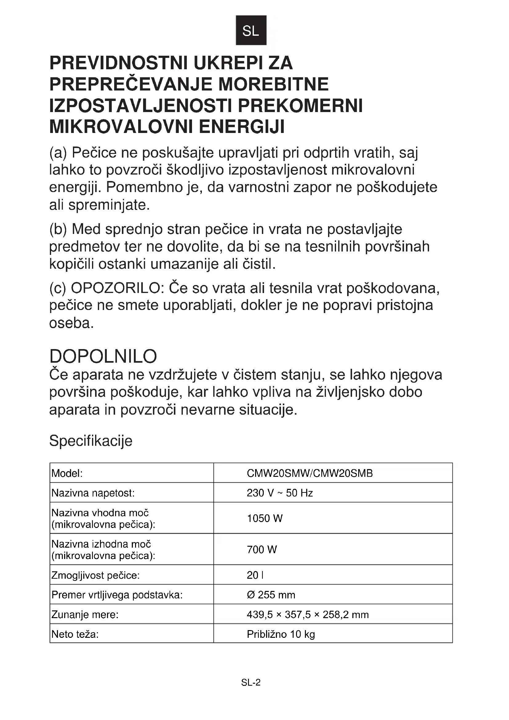 CMW20SMB Pred uporabo mikrovalovne pečice natančno preberite ta navodila in jih skrbno shranite. Če boste upoštevali navodila, vam bo pečica dolga leta dobro služila.