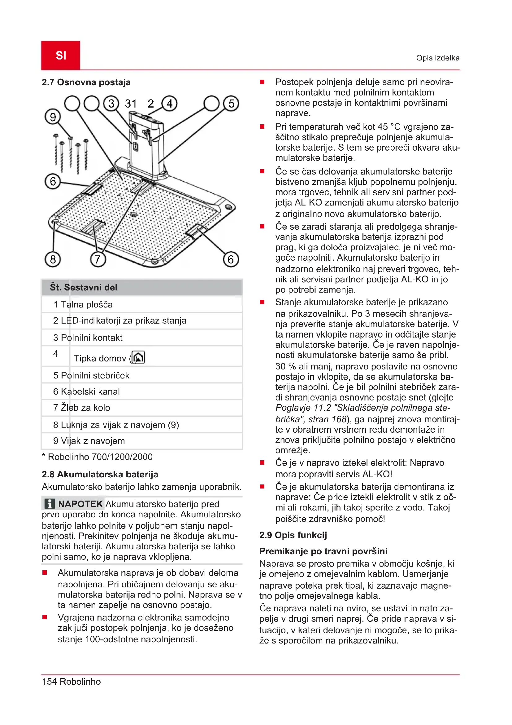 NEVARNOST! Označuje neposredno ne- varno situacijo, ki bo ob neupoštevanju opozorila povzročila smrt ali hude telesne poškodbe. OPOZORILO! Označuje možno nevarno si- tuacijo, ki lahko ob neupoštevanju opozorila povzroči smrt ali hude telesne poškodbe. PREVIDNO! Označuje možno nevarno situ- acijo, ki lahko ob neupoštevanju opozorila povzroči manjše ali zmerne telesne poškodbe. POZOR! Označuje situacijo, ki lahko ob neu- poštevanju opozorila povzroči materialno škodo. NAPOTEK Posebni napotki za boljše razu- mevanje in ravnanje. 2 OPIS IZDELKA Ta dokumentacija opisuje popolnoma samodejno delujočo akumulatorsko robotsko kosilnico, ki se prosto premika po travni površini. Višina reza je nastavljiva.SI 150 Robolinho Opis izdelka