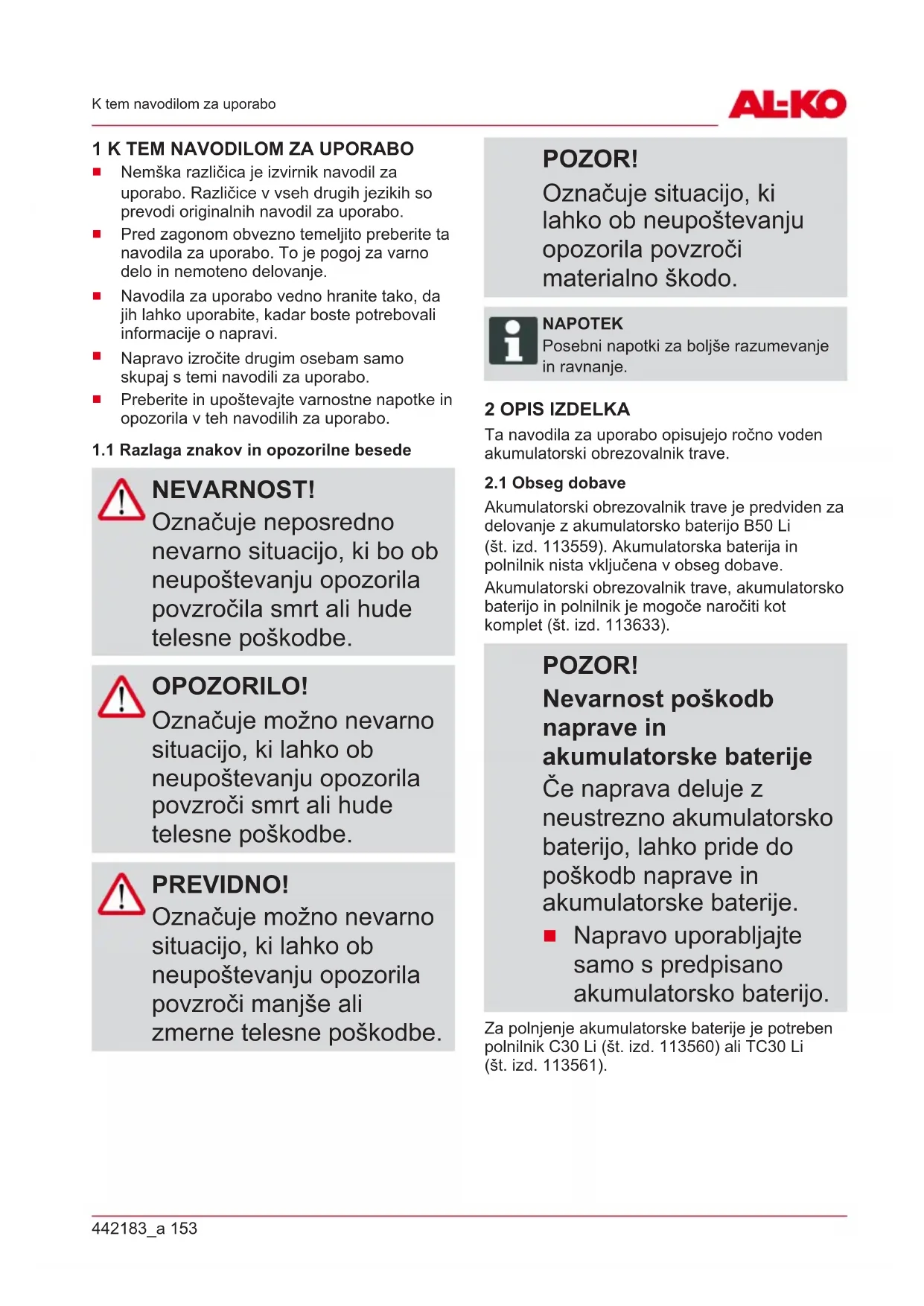 NEVARNOST! Označuje neposredno nevarno situacijo, ki bo ob neupoštevanju opozorila povzročila smrt ali hude telesne poškodbe. OPOZORILO! Označuje možno nevarno situacijo, ki lahko ob neupoštevanju opozorila povzroči smrt ali hude telesne poškodbe. PREVIDNO! Označuje možno nevarno situacijo, ki lahko ob neupoštevanju opozorila povzroči manjše ali zmerne telesne poškodbe. POZOR! Označuje situacijo, ki lahko ob neupoštevanju opozorila povzroči materialno škodo. NAPOTEK Posebni napotki za boljše razumevanje in ravnanje. 2 OPIS IZDELKA Ta navodila za uporabo opisujejo ročno voden akumulatorski obrezovalnik trave.