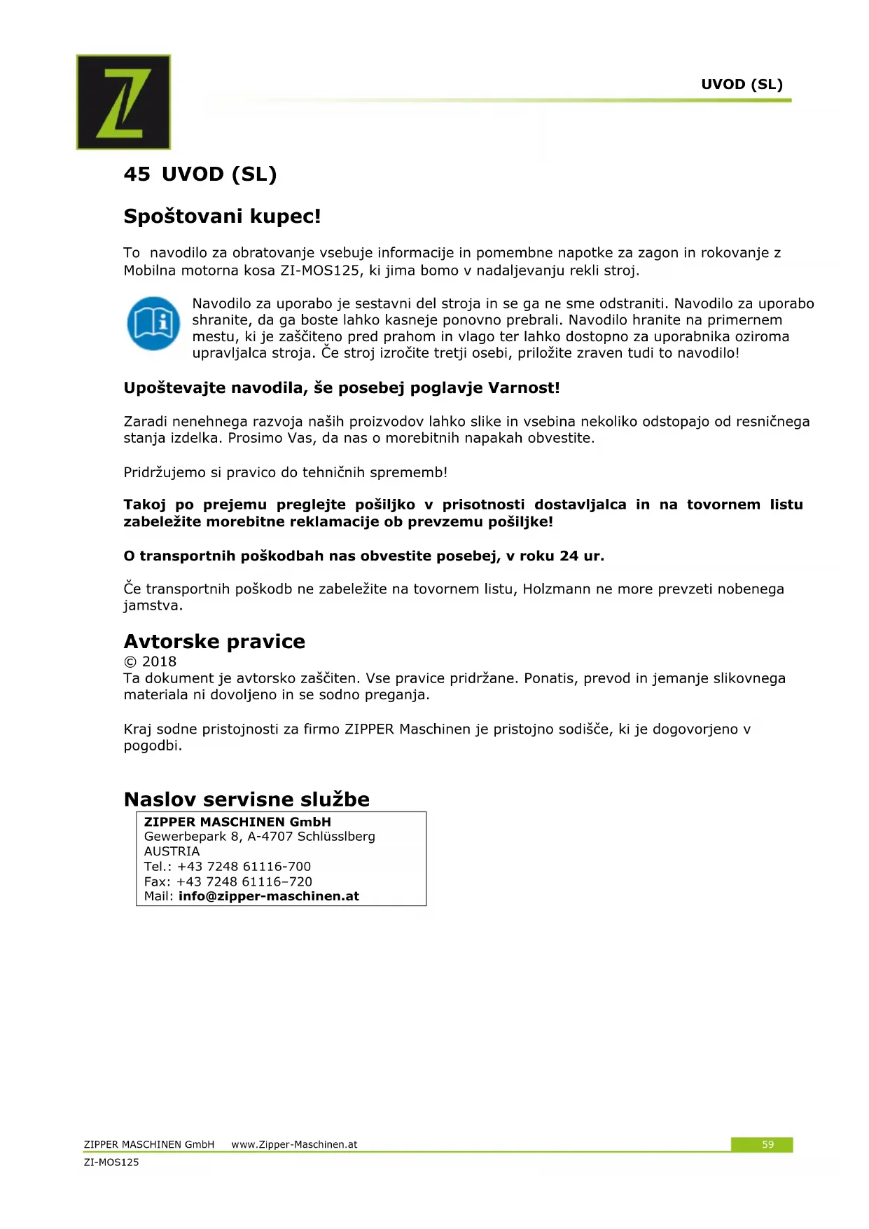 ZIPPER MASCHINEN GmbH Gewerbepark 8, A-4707 Schlüsslberg AUSTRIA Tel.: +43 7248 61116-700 Fax: +43 7248 61116–720 Mail: info@zipper-maschinen.atVARNOST ZIPPER MASCHINEN GmbH www.Zipper-Maschinen.at 60 ZI-MOS125 46 VARNOST To navodilo za uporabo vsebuje informacije in pomembne napotke za uporabo in rokovanje s strojem. Zaradi Vaše varnosti pred uporabo natančno preberite to navodilo. Tako boste lahko varno delali s strojem, se izognili nesporazumom ter preprečili poškodbe ljudi ali materialno škodo. Poleg tega upoštevajte simbole in piktograme na stroju, kot tudi varnostna opozorila ter opozorila za nevarnost! Namenska uporaba Stroj je namenjen izključno za naslednje dejavnosti: Lahko uporablja samo za košnjo oz. rezanje trave, plevela in podrastja. Za materialno škodo ali telesne poškodbe, ki so posledica kakršnega koli drugega načina uporabe, ZIPPER MASCHINEN ne prevzema nikakršne odgovornosti ali garancije.