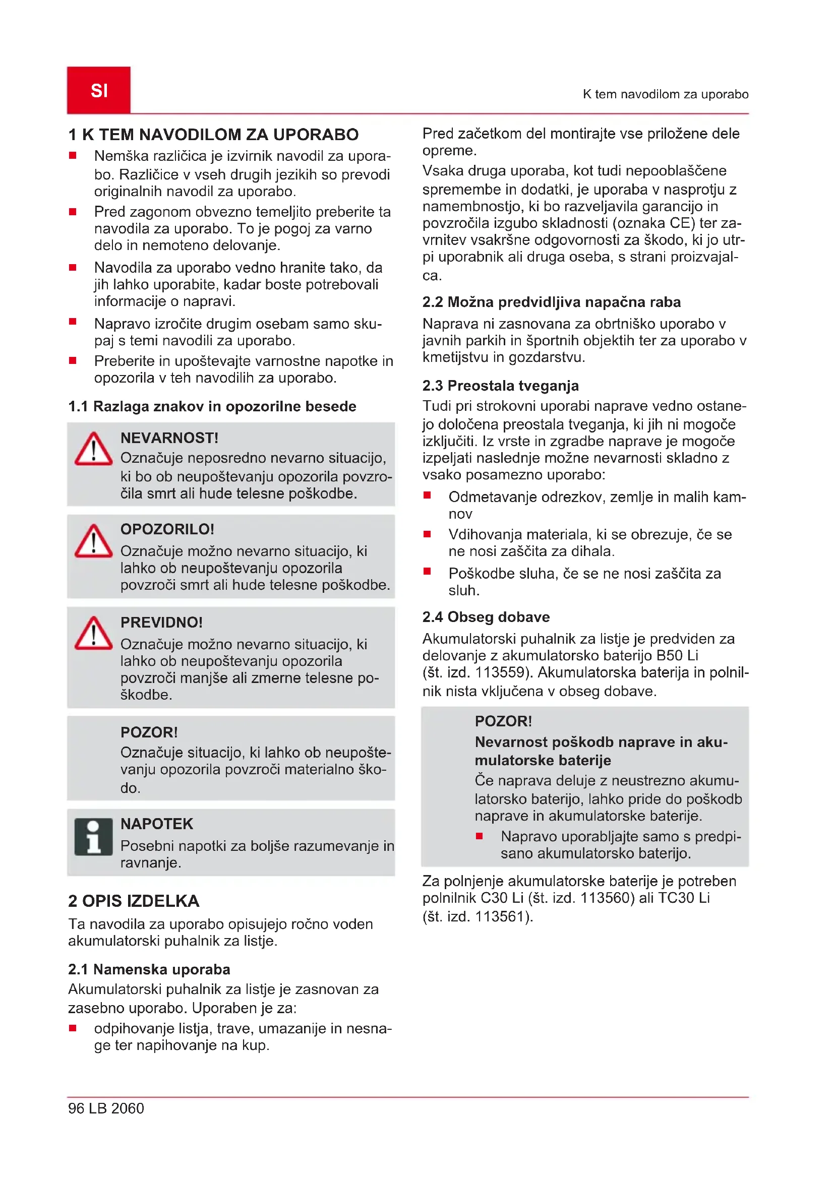 Napravo uporabljajte samo s predpi- sano akumulatorsko baterijo. Za polnjenje akumulatorske baterije je potreben polnilnik C30 Li (št.izd.113560) ali TC30 Li (št.izd.113561).442451_a 97 Varnostni napotki NAPOTEK V naslednjih navodilih za uporabo so na voljo naslednje informacije: