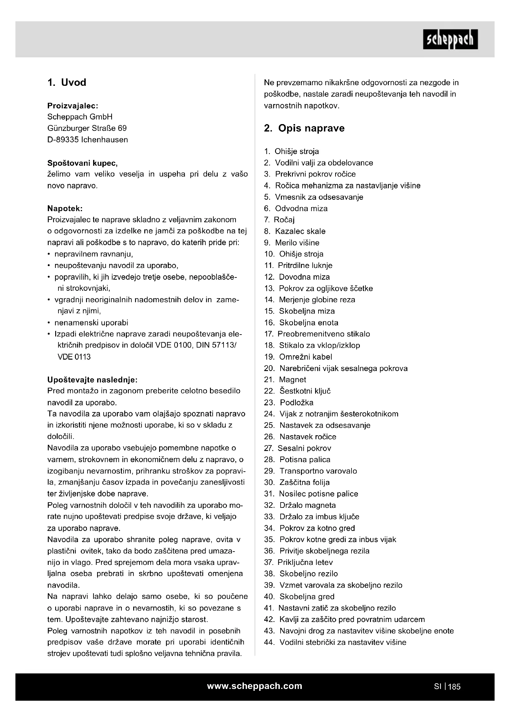 - Izpadi električne naprave zaradi neupoštevanja ele- ktričnih predpisov in določil VDE 0100, DIN 57113/ VDE 0113 Upoštevajte naslednje: Pred montažo in zagonom preberite celotno besedilo navodil za uporabo. Ta navodila za uporabo vam olajšajo spoznati napravo in izkoristiti njene možnosti uporabe, ki so v skladu z določili. Navodila za uporabo vsebujejo pomembne napotke o varnem, strokovnem in ekonomičnem delu z napravo, o izogibanju nevarnostim, prihranku stroškov za popravi- la, zmanjšanju časov izpada in povečanju zanesljivosti ter življenjske dobe naprave. Poleg varnostnih določil v teh navodilih za uporabo mo- rate nujno upoštevati predpise svoje države, ki veljajo za uporabo naprave. Navodila za uporabo shranite poleg naprave, ovita v plastični ovitek, tako da bodo zaščitena pred umaza- nijo in vlago. Pred sprejemom dela mora vsaka uprav- ljalna oseba prebrati in skrbno upoštevati omenjena navodila. Na napravi lahko delajo samo osebe, ki so poučene o uporabi naprave in o nevarnostih, ki so povezane s tem. Upoštevajte zahtevano najnižjo starost. Poleg varnostnih napotkov iz teh navodil in posebnih predpisov vaše države morate pri uporabi identičnih strojev upoštevati tudi splošno veljavna tehnična pravila.www.scheppach.com