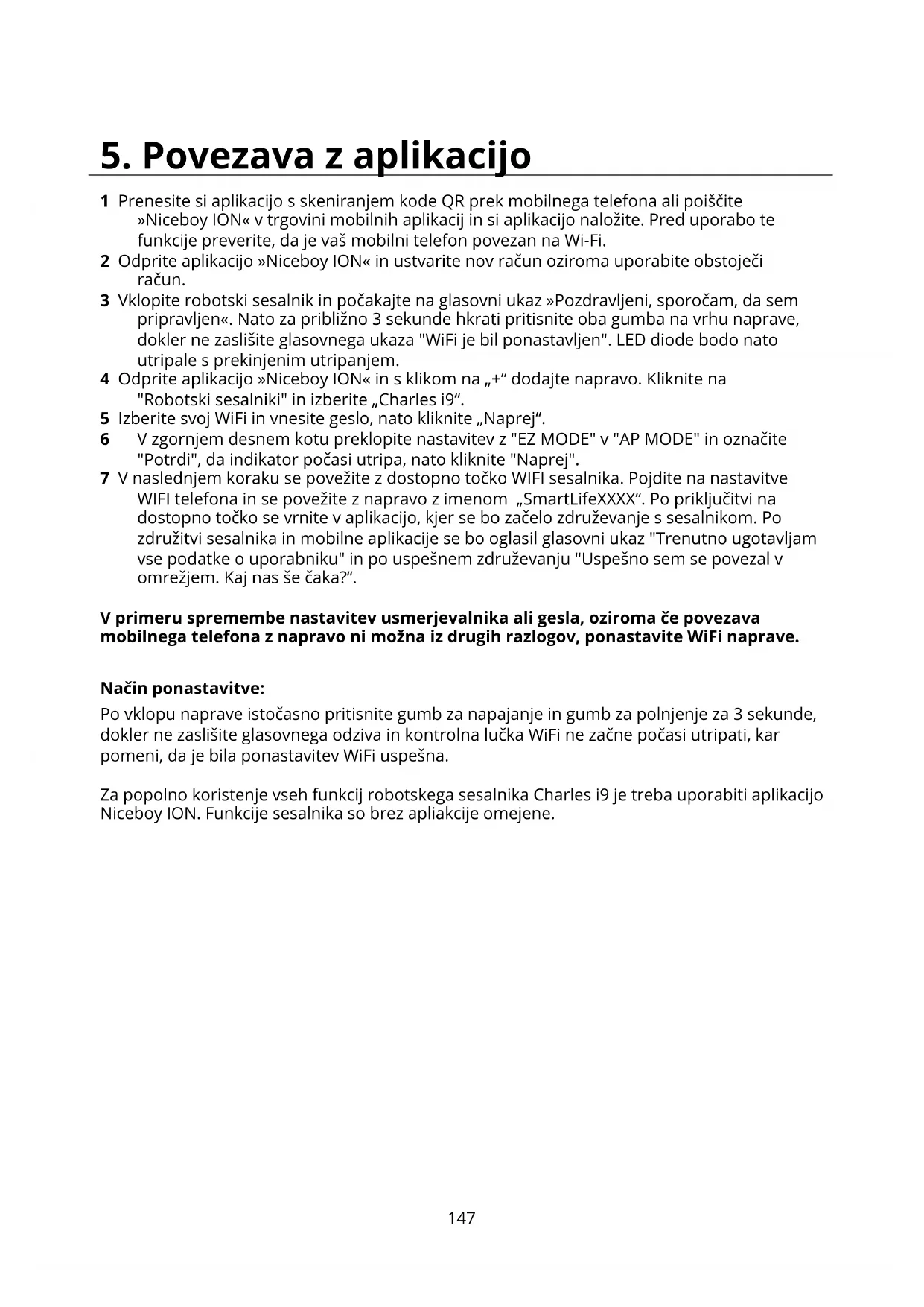 1 Prenesite si aplikacijo s skeniranjem kode QR prek mobilnega telefona ali poiščite »Niceboy ION« v trgovini mobilnih aplikacij in si aplikacijo naložite. Pred uporabo te funkcije preverite, da je vaš mobilni telefon povezan na Wi-Fi. 2 Odprite aplikacijo »Niceboy ION« in ustvarite nov račun oziroma uporabite obstoječi račun. 3 Vklopite robotski sesalnik in počakajte na glasovni ukaz »Pozdravljeni, sporočam, da sem pripravljen«. Nato za približno 3 sekunde hkrati pritisnite oba gumba na vrhu naprave, dokler ne zaslišite glasovnega ukaza "WiFi je bil ponastavljen". LED diode bodo nato utripale s prekinjenim utripanjem. 4 Odprite aplikacijo »Niceboy ION« in s klikom na „+“ dodajte napravo. Kliknite na "Robotski sesalniki" in izberite „Charles i9“. 5 Izberite svoj WiFi in vnesite geslo, nato kliknite „Naprej“. 6 V zgornjem desnem kotu preklopite nastavitev z "EZ MODE" v "AP MODE" in označite "Potrdi", da indikator počasi utripa, nato kliknite "Naprej". 7 V naslednjem koraku se povežite z dostopno točko WIFI sesalnika. Pojdite na nastavitve WIFI telefona in se povežite z napravo z imenom „SmartLifeXXXX“. Po priključitvi na dostopno točko se vrnite v aplikacijo, kjer se bo začelo združevanje s sesalnikom. Po združitvi sesalnika in mobilne aplikacije se bo oglasil glasovni ukaz "Trenutno ugotavljam vse podatke o uporabniku" in po uspešnem združevanju "Uspešno sem se povezal v omrežjem. Kaj nas še čaka?“. V primeru spremembe nastavitev usmerjevalnika ali gesla, oziroma če povezava mobilnega telefona z napravo ni možna iz drugih razlogov, ponastavite WiFi naprave. Način ponastavitve: Po vklopu naprave istočasno pritisnite gumb za napajanje in gumb za polnjenje za 3 sekunde, dokler ne zaslišite glasovnega odziva in kontrolna lučka WiFi ne začne počasi utripati, kar pomeni, da je bila ponastavitev WiFi uspešna. Za popolno koristenje vseh funkcij robotskega sesalnika Charles i9 je treba uporabiti aplikacijo Niceboy ION. Funkcije sesalnika so brez apliakcije omejene.148