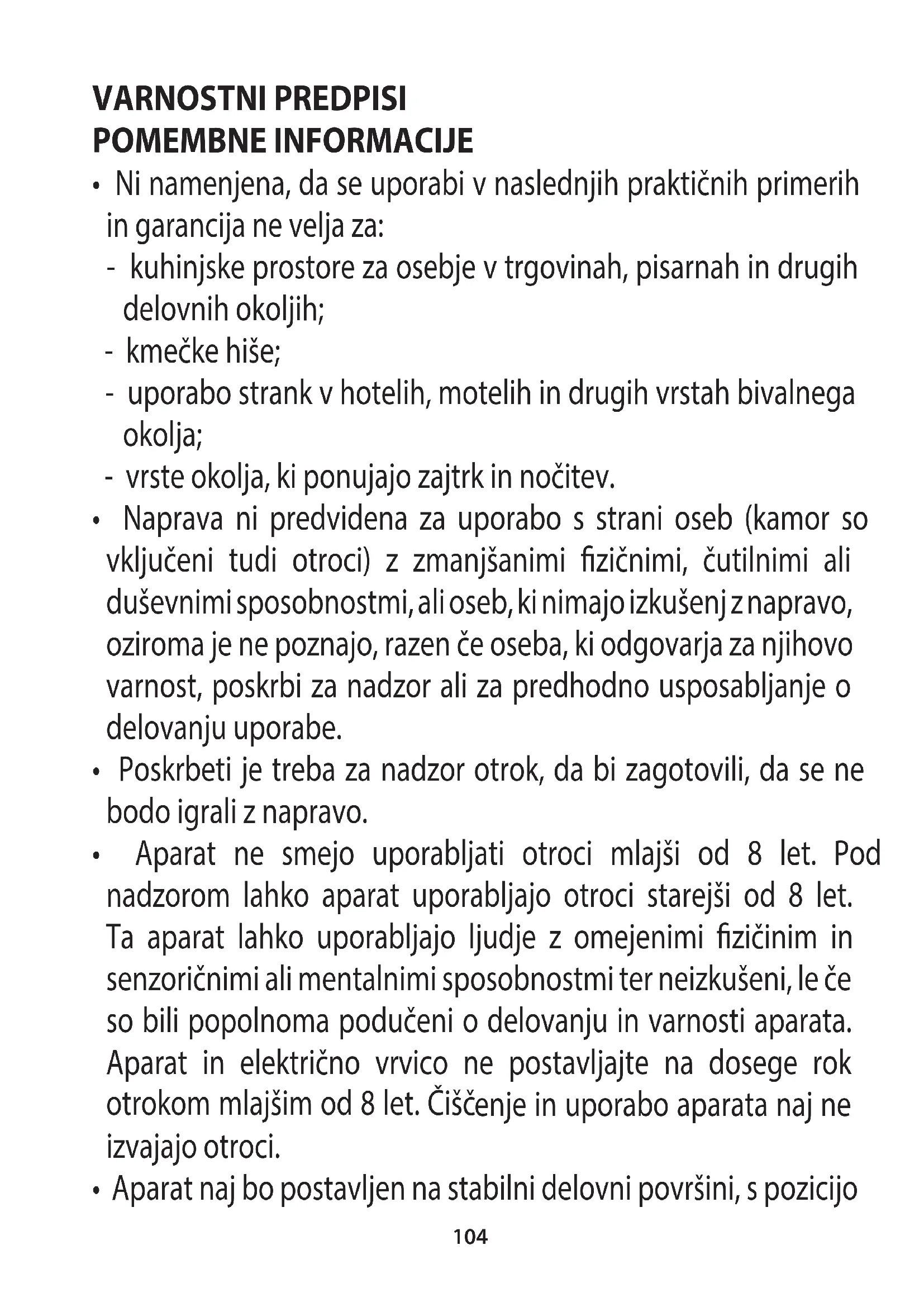 - Aparat ne smejo uporabljati otroci mlajski od 8 let. Pod nadzorom lahko aparat uporabljago otroci starejski od 8 let. Ta aparat lahko uporabljago ljudje z omejenimi fizičinim in senzoričnimi ali mentalnimi sposobnostmi ter neizkušeni, le Če so bili popolnama podučeni o delovanju in varnosti aparata. Aparat in elektricno vrvico ne postavljaje na dosege rok otrokom mlajšim od 8 let. Čišcenje in uporabo aparata nj ne izvajajo otroci.