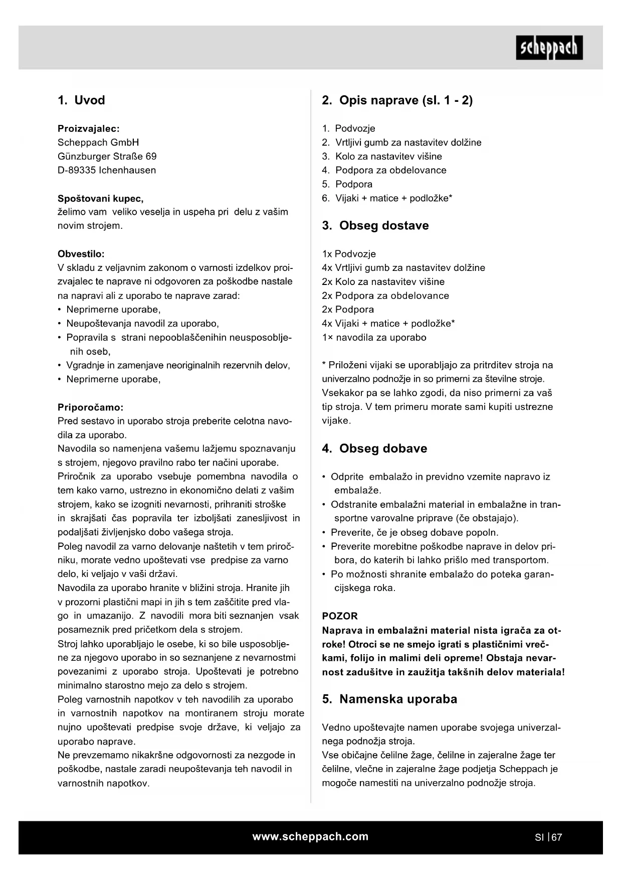 - Neprimerne uporabe, Priporočamo: Pred sestavo in uporabo stroja preberite celotna navo- dila za uporabo. Navodila so namenjena vašemu lažjemu spoznavanju s strojem, njegovo pravilno rabo ter načini uporabe. Priročnik za uporabo vsebuje pomembna navodila o tem kako varno, ustrezno in ekonomično delati z vašim strojem, kako se izogniti nevarnosti, prihraniti stroške in skrajšati čas popravila ter izboljšati zanesljivost in podaljšati življenjsko dobo vašega stroja. Poleg navodil za varno delovanje naštetih v tem priroč- niku, morate vedno upoštevati vse predpise za varno delo, ki veljajo v vaši državi. Navodila za uporabo hranite v bližini stroja. Hranite jih v prozorni plastični mapi in jih s tem zaščitite pred vla- go in umazanijo. Z navodili mora biti seznanjen vsak posameznik pred pričetkom dela s strojem. Stroj lahko uporabljajo le osebe, ki so bile usposoblje- ne za njegovo uporabo in so seznanjene z nevarnostmi povezanimi z uporabo stroja. Upoštevati je potrebno minimalno starostno mejo za delo s strojem. Poleg varnostnih napotkov v teh navodilih za uporabo in varnostnih napotkov na montiranem stroju morate nujno upoštevati predpise svoje države, ki veljajo za uporabo naprave. Ne prevzemamo nikakršne odgovornosti za nezgode in poškodbe, nastale zaradi neupoštevanja teh navodil in varnostnih napotkov.www.scheppach.com