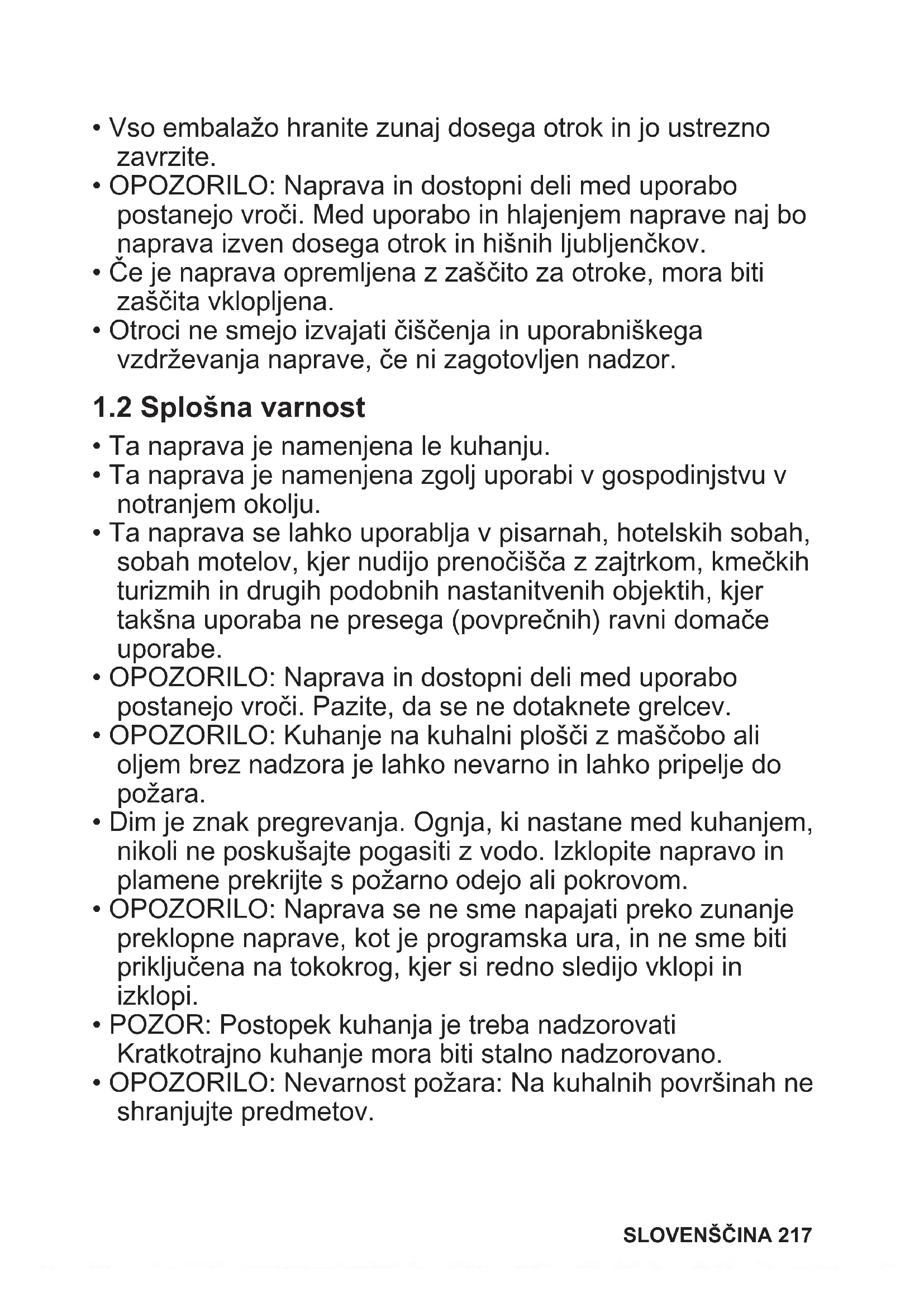- OPOZORILO: Nevarnost požara: Na kuhalnih površinah ne shranjujte predmetov. SLOVENŠČINA 217• Ne postavljajte kovinskih predmetov, kot so noži, vilice, žlice in pokrovke na površino kuhalne plošče, ker se lahko segrejejo.