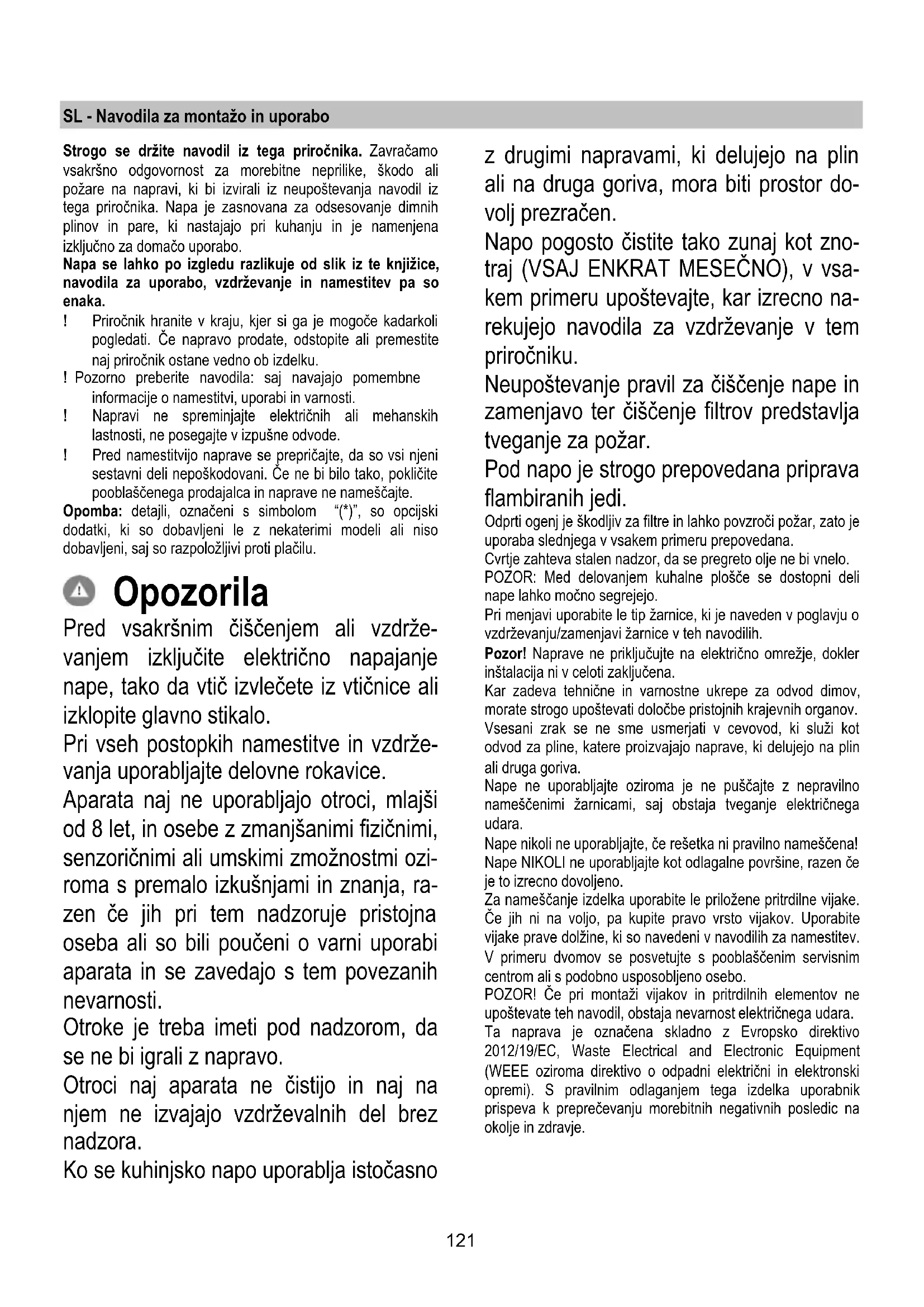 Ukoliko rasveta ne funkcioniše, kontrolišite da li ste pravilno postavili lampe na njihovo mesto pre nego što pozovete servisnu službu radi asistencije.121 SL - Navodila za montažo in uporabo Strogo se držite navodil iz tega priročnika. Zavračamo vsakršno odgovornost za morebitne neprilike, škodo ali požare na napravi, ki bi izvirali iz neupoštevanja navodil iz tega priročnika. Napa je zasnovana za odsesovanje dimnih plinov in pare, ki nastajajo pri kuhanju in je namenjena izključno za domačo uporabo. Napa se lahko po izgledu razlikuje od slik iz te knjižice, navodila za uporabo, vzdrževanje in namestitev pa so enaka. ! Priročnik hranite v kraju, kjer si ga je mogoče kadarkoli pogledati. Če napravo prodate, odstopite ali premestite naj priročnik ostane vedno ob izdelku. ! Pozorno preberite navodila: saj navajajo pomembne informacije o namestitvi, uporabi in varnosti. ! Napravi ne spreminjajte električnih ali mehanskih lastnosti, ne posegajte v izpušne odvode. ! Pred namestitvijo naprave se prepričajte, da so vsi njeni sestavni deli nepoškodovani. Če ne bi bilo tako, pokličite pooblaščenega prodajalca in naprave ne nameščajte. Opomba: detajli, označeni s simbolom “(*)”, so opcijski dodatki, ki so dobavljeni le z nekaterimi modeli ali niso dobavljeni, saj so razpoložljivi proti plačilu. Opozorila Pred vsakršnim čiščenjem ali vzdrže- vanjem izključite električno napajanje nape, tako da vtič izvlečete iz vtičnice ali izklopite glavno stikalo. Pri vseh postopkih namestitve in vzdrže- vanja uporabljajte delovne rokavice. Aparata naj ne uporabljajo otroci, mlajši od 8 let, in osebe z zmanjšanimi fizičnimi, senzoričnimi ali umskimi zmožnostmi ozi- roma s premalo izkušnjami in znanja, ra- zen če jih pri tem nadzoruje pristojna oseba ali so bili poučeni o varni uporabi aparata in se zavedajo s tem povezanih nevarnosti. Otroke je treba imeti pod nadzorom, da se ne bi igrali z napravo. Otroci naj aparata ne čistijo in naj na njem ne izvajajo vzdrževalnih del brez nadzora. Ko se kuhinjsko napo uporablja istočasno z drugimi napravami, ki delujejo na plin ali na druga goriva, mora biti prostor do- volj prezračen. Napo pogosto čistite tako zunaj kot zno- traj (VSAJ ENKRAT MESEČNO), v vsa- kem primeru upoštevajte, kar izrecno na- rekujejo navodila za vzdrževanje v tem priročniku. Neupoštevanje pravil za čiščenje nape in zamenjavo ter čiščenje filtrov predstavlja tveganje za požar. Pod napo je strogo prepovedana priprava flambiranih jedi. Odprti ogenj je škodljiv za filtre in lahko povzroči požar, zato je uporaba slednjega v vsakem primeru prepovedana. Cvrtje zahteva stalen nadzor, da se pregreto olje ne bi vnelo. POZOR: Med delovanjem kuhalne plošče se dostopni deli nape lahko močno segrejejo. Pri menjavi uporabite le tip žarnice, ki je naveden v poglavju o vzdrževanju/zamenjavi žarnice v teh navodilih. Pozor! Naprave ne priključujte na električno omrežje, dokler inštalacija ni v celoti zaključena. Kar zadeva tehnične in varnostne ukrepe za odvod dimov, morate strogo upoštevati določbe pristojnih krajevnih organov. Vsesani zrak se ne sme usmerjati v cevovod, ki služi kot odvod za pline, katere proizvajajo naprave, ki delujejo na plin ali druga goriva. Nape ne uporabljajte oziroma je ne puščajte z nepravilno nameščenimi žarnicami, saj obstaja tveganje električnega udara. Nape nikoli ne uporabljajte, če rešetka ni pravilno nameščena! Nape NIKOLI ne uporabljajte kot odlagalne površine, razen če je to izrecno dovoljeno. Za nameščanje izdelka uporabite le priložene pritrdilne vijake. Če jih ni na voljo, pa kupite pravo vrsto vijakov. Uporabite vijake prave dolžine, ki so navedeni v navodilih za namestitev. V primeru dvomov se posvetujte s pooblaščenim servisnim centrom ali s podobno usposobljeno osebo. POZOR! Če pri montaži vijakov in pritrdilnih elementov ne upoštevate teh navodil, obstaja nevarnost električnega udara. Ta naprava je označena skladno z Evropsko direktivo 2012/19/EC, Waste Electrical and Electronic Equipment (WEEE oziroma direktivo o odpadni električni in elektronski opremi). S pravilnim odlaganjem tega izdelka uporabnik prispeva k preprečevanju morebitnih negativnih posledic na okolje in zdravje.122 Znak na izdelku ali na priloženi dokumentaciji označuje, da se ga ne sme zavreči med komunalne odpadke, temveč odnesti na ustrezno zbirno mesto za recikliranje odpadne električne in elektronske opreme. Napravo zavrzite skladno z lokalnimi predpisi, ki veljajo na področju odlaganja odpadkov. Za dodatne informacije o ravnanju, ponovni uporabi in recikliranju tega izdelka se obrnite na ustrezno lokalno službo, zbirni center komunalnih odpadkov ali trgovino, kjer ste izdelek kupili. Aparat je bil zasnovan, testiran in izdelan v skladu z: