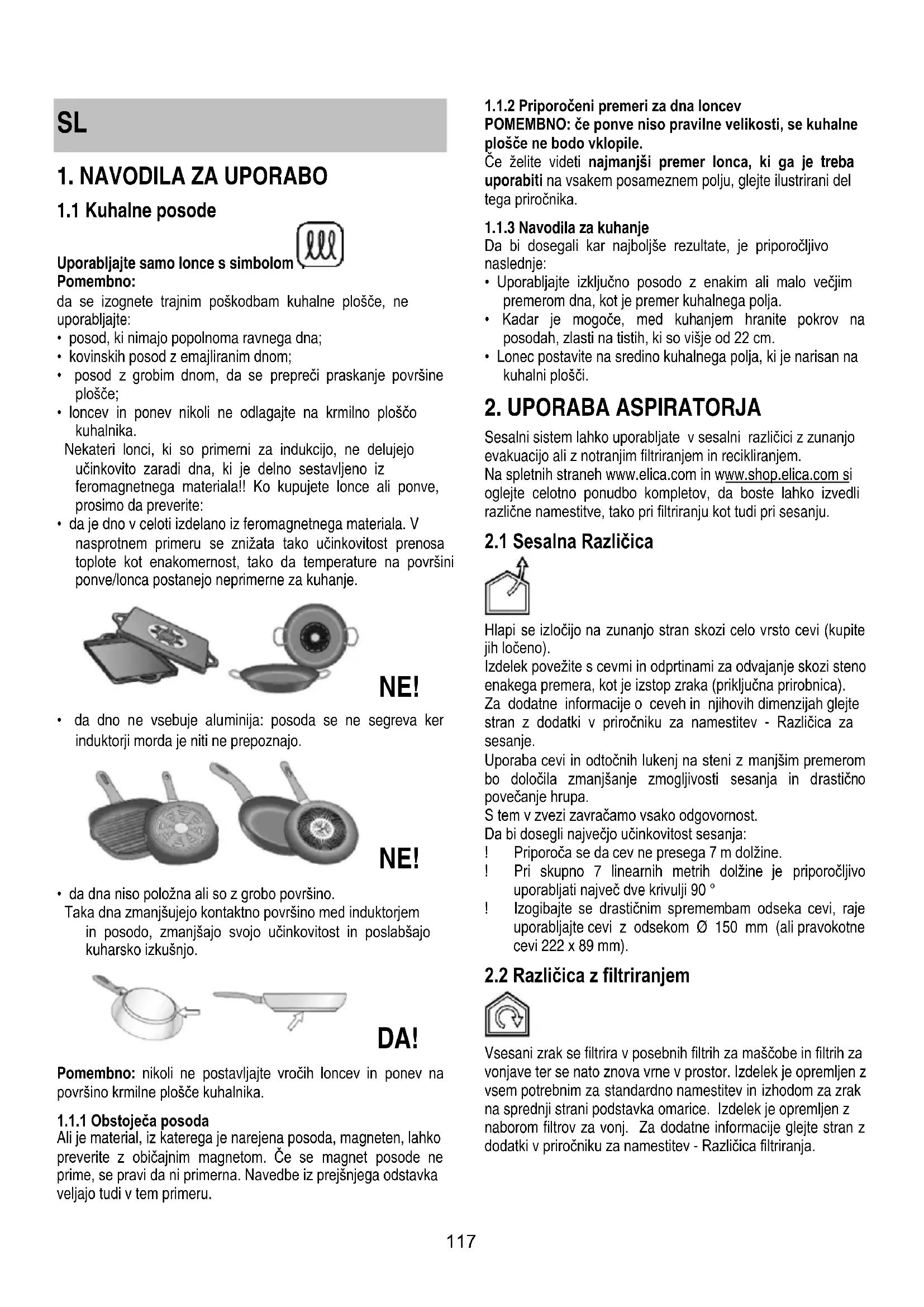 Sesalni system lahko uporabljate v sesalni razlicici z zunanjo evakuaciono ali z notranjin filtriranjem in reciklaranjem. Na spltetnih straneh www.elica.com in www.shop.elica.com si oglejte celotno ponudbo kompletov, da boste lahko izvedli razlicne namestitve, tak pri filtriranju kot tudi pri sesanju.