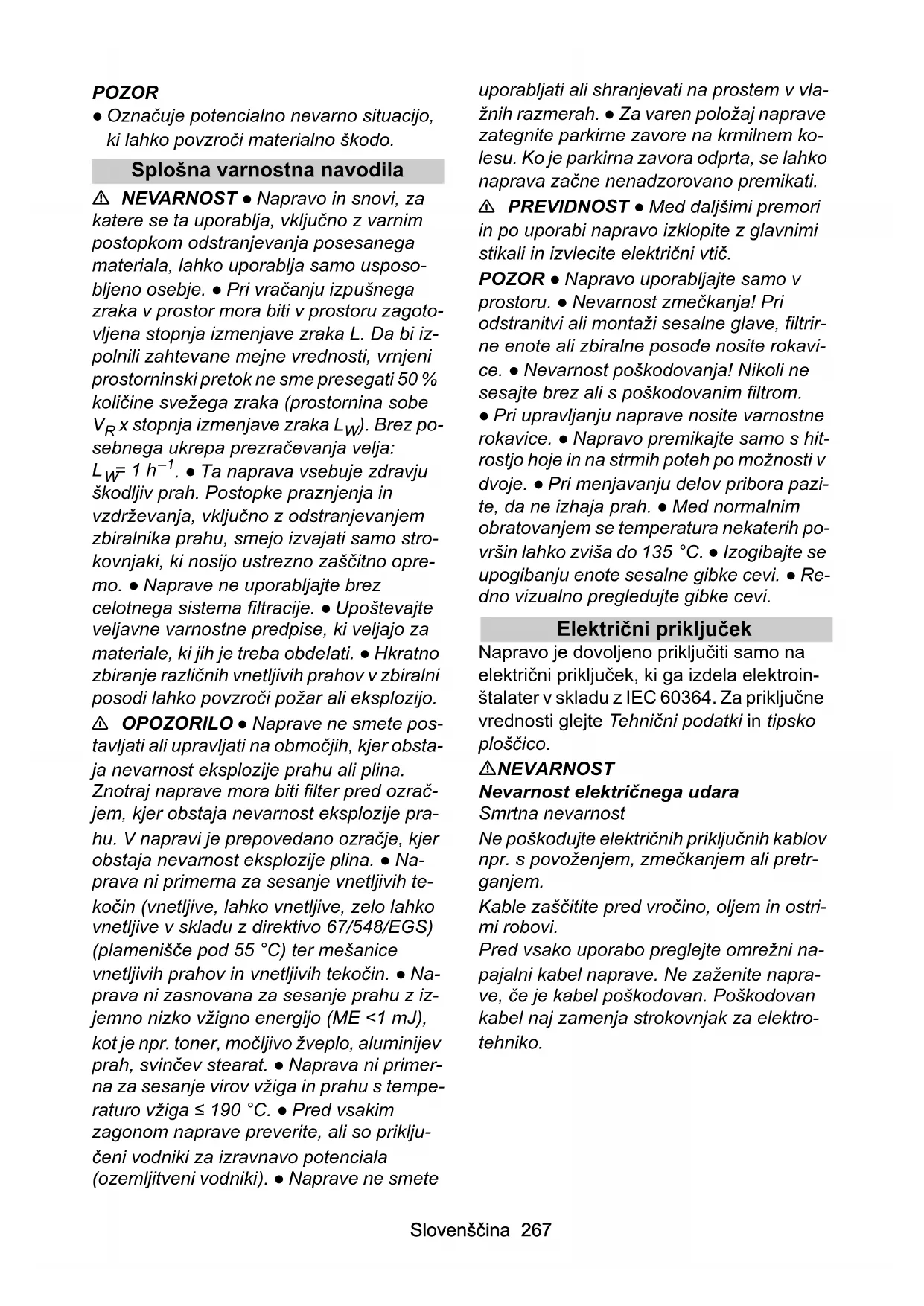 OPOZORILO · Naprave ne smete postavljati ali upravljati na območijh, kjer obstaja nevarnost eksplozije prahu ali plina. Znotraj naprave mora biti filter pred ozrac-jem, kjer obstaja nevarnost eksplozije prahu. V napravi je prepovedano ozracje, kjer obstaja nevarnost eksplozije plina. · Naprava ni primerna za sesanje vnetljivih tekocin (vnetljive, lahko vnetljive, zelo lahko vnetljive v skladu z direktivo 67/548/EGS) (plamenisće pod 55^) ter meşanice vnetljivih prahov in vnetljivih tekocin. · Naprava ni zašovana za sesanje prahu z izjemno nizko vžigno energijo (ME < 1mJ) kot je npr.toner, mocljivo zveplo, aluminijev prah, svincev stearat. · Naprava ni primerna za sesanje virov vžiga in prahu s temperaturo vžiga ≤ 190^. Pred vsakim zagonom naprave preverite, ali so priključeni vodniki za izravnavo potenciala (ozemljitveni vodniki). · Naprave ne smete