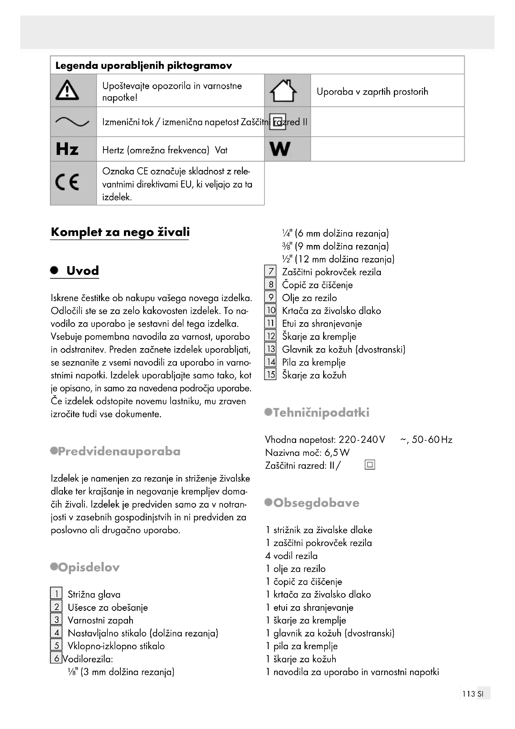 , 50 - 60 Hz Nazivna moč: 6,5 W Zaščitni razred: II / Obseg dobave 1 strižnik za živalske dlake 1 zaščitni pokrovček rezila 4 vodil rezila 1 olje za rezilo 1 čopič za čiščenje 1 krtača za živalsko dlako 1 etui za shranjevanje 1 škarje za kremplje 1 glavnik za kožuh (dvostranski) 1 pila za kremplje 1 škarje za kožuh 1 navodila za uporabo in varnostni napotki114 SI Varnostni napotki