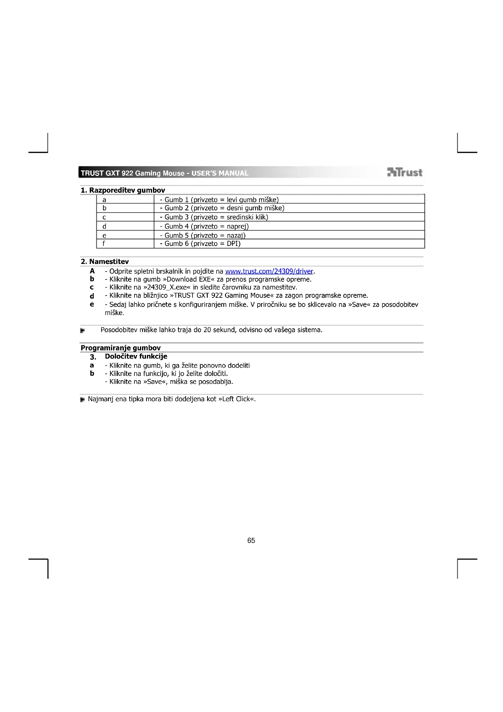 - Odprite spletni brskalnik in pojdite na www.trust.com/24309/driver. - Kliknite na gumb »Download EXE« za prenos programske opreme. - Kliknite na »24309_X.exe« in sledite čarovniku za namestitev. - Kliknite na bližnjico »TRUST GXT 922 Gaming Mouse« za zagon programske opreme. - Sedaj lahko pričnete s konfiguriranjem miške. V priročniku se bo sklicevalo na »Save« za posodobitev miške. Posodobitev miške lahko traja do 20 sekund, odvisno od vašega sistema. Programiranje gumbov