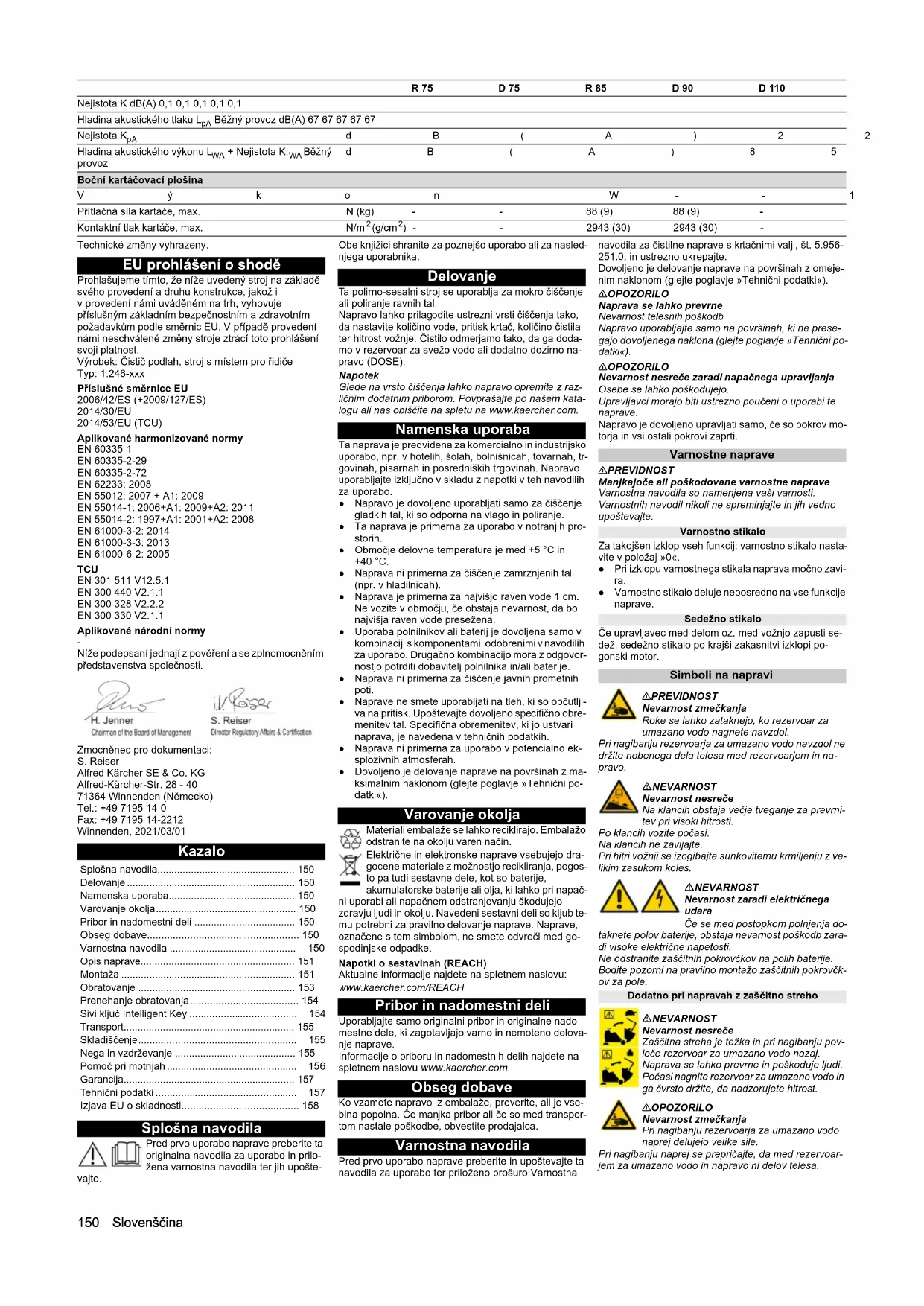 Níže podepsaní jednají z pověření a se zplnomocněním představenstva společnosti. Zmocněnec pro dokumentaci: S. Reiser Alfred Kärcher SE & Co. KG Alfred-Kärcher-Str. 28 - 40 71364 Winnenden (Německo) Tel.: +49 7195 14-0 Fax: +49 7195 14-2212 Winnenden, 2021/03/01 Kazalo Splošna navodila Pred prvo uporabo naprave preberite ta originalna navodila za uporabo in prilo- žena varnostna navodila ter jih upošte- vajte. Obe knjižici shranite za poznejšo uporabo ali za nasled- njega uporabnika. Delovanje Ta polirno-sesalni stroj se uporablja za mokro čiščenje ali poliranje ravnih tal. Napravo lahko prilagodite ustrezni vrsti čiščenja tako, da nastavite količino vode, pritisk krtač, količino čistila ter hitrost vožnje. Čistilo odmerjamo tako, da ga doda- mo v rezervoar za svežo vodo ali dodatno dozirno na- pravo (DOSE). Napotek Glede na vrsto čiščenja lahko napravo opremite z raz- ličnim dodatnim priborom. Povprašajte po našem kata- logu ali nas obiščite na spletu na www.kaercher.com. Namenska uporaba Ta naprava je predvidena za komercialno in industrijsko uporabo, npr. v hotelih, šolah, bolnišnicah, tovarnah, tr- govinah, pisarnah in posredniških trgovinah. Napravo uporabljajte izključno v skladu z napotki v teh navodilih za uporabo. ● Napravo je dovoljeno uporabljati samo za čiščenje gladkih tal, ki so odporna na vlago in poliranje. ● Ta naprava je primerna za uporabo v notranjih pro- storih. ● Območje delovne temperature je med +5 °C in +40 °C. ● Naprava ni primerna za čiščenje zamrznjenih tal (npr. v hladilnicah). ● Naprava je primerna za najvišjo raven vode 1 cm. Ne vozite v območju, če obstaja nevarnost, da bo najvišja raven vode presežena. ● Uporaba polnilnikov ali baterij je dovoljena samo v kombinaciji s komponentami, odobrenimi v navodilih za uporabo. Drugačno kombinacijo mora z odgovor- nostjo potrditi dobavitelj polnilnika in/ali baterije. ● Naprava ni primerna za čiščenje javnih prometnih poti. ● Naprave ne smete uporabljati na tleh, ki so občutlji- va na pritisk. Upoštevajte dovoljeno specifično obre- menitev tal. Specifična obremenitev, ki jo ustvari naprava, je navedena v tehničnih podatkih. ● Naprava ni primerna za uporabo v potencialno ek- splozivnih atmosferah. ● Dovoljeno je delovanje naprave na površinah z ma- ksimalnim naklonom (glejte poglavje »Tehnični po- datki«). Varovanje okolja Materiali embalaže se lahko reciklirajo. Embalažo odstranite na okolju varen način. Električne in elektronske naprave vsebujejo dra- gocene materiale z možnostjo recikliranja, pogos- to pa tudi sestavne dele, kot so baterije, akumulatorske baterije ali olja, ki lahko pri napač- ni uporabi ali napačnem odstranjevanju škodujejo zdravju ljudi in okolju. Navedeni sestavni deli so kljub te- mu potrebni za pravilno delovanje naprave. Naprave, označene s tem simbolom, ne smete odvreči med go- spodinjske odpadke. Napotki o sestavinah (REACH) Aktualne informacije najdete na spletnem naslovu: www.kaercher.com/REACH Pribor in nadomestni deli Uporabljajte samo originalni pribor in originalne nado- mestne dele, ki zagotavljajo varno in nemoteno delova- nje naprave. Informacije o priboru in nadomestnih delih najdete na spletnem naslovu www.kaercher.com. Obseg dobave Ko vzamete napravo iz embalaže, preverite, ali je vse- bina popolna. Če manjka pribor ali če so med transpor- tom nastale poškodbe, obvestite prodajalca. Varnostna navodila Pred prvo uporabo naprave preberite in upoštevajte ta navodila za uporabo ter priloženo brošuro Varnostna navodila za čistilne naprave s krtačnimi valji, št. 5.956- 251.0, in ustrezno ukrepajte. Dovoljeno je delovanje naprave na površinah z omeje- nim naklonom (glejte poglavje »Tehnični podatki«). 몇 OPOZORILO Naprava se lahko prevrne Nevarnost telesnih poškodb Napravo uporabljajte samo na površinah, ki ne prese- gajo dovoljenega naklona (glejte poglavje »Tehnični po- datki«). 몇 OPOZORILO Nevarnost nesreče zaradi napačnega upravljanja Osebe se lahko poškodujejo. Upravljavci morajo biti ustrezno poučeni o uporabi te naprave. Napravo je dovoljeno upravljati samo, če so pokrov mo- torja in vsi ostali pokrovi zaprti. Varnostne naprave 몇 PREVIDNOST Manjkajoče ali poškodovane varnostne naprave Varnostna navodila so namenjena vaši varnosti. Varnostnih navodil nikoli ne spreminjajte in jih vedno upoštevajte. Varnostno stikalo Za takojšen izklop vseh funkcij: varnostno stikalo nasta- vite v položaj »0«. ● Pri izklopu varnostnega stikala naprava močno zavi- ra. ● Varnostno stikalo deluje neposredno na vse funkcije naprave. Sedežno stikalo Če upravljavec med delom oz. med vožnjo zapusti se- dež, sedežno stikalo po krajši zakasnitvi izklopi po- gonski motor. Simboli na napravi 몇PREVIDNOST Nevarnost zmečkanja Roke se lahko zataknejo, ko rezervoar za umazano vodo nagnete navzdol. Pri nagibanju rezervoarja za umazano vodo navzdol ne držite nobenega dela telesa med rezervoarjem in na- pravo. NEVARNOST Nevarnost nesreče Na klancih obstaja večje tveganje za prevrni- tev pri visoki hitrosti. Po klancih vozite počasi. Na klancih ne zavijajte. Pri hitri vožnji se izogibajte sunkovitemu krmiljenju z ve- likim zasukom koles. NEVARNOST Nevarnost zaradi električnega udara Če se med postopkom polnjenja do- taknete polov baterije, obstaja nevarnost poškodb zara- di visoke električne napetosti. Ne odstranite zaščitnih pokrovčkov na polih baterije. Bodite pozorni na pravilno montažo zaščitnih pokrovčk- ov za pole. Dodatno pri napravah z zaščitno streho NEVARNOST Nevarnost nesreče Zaščitna streha je težka in pri nagibanju pov- leče rezervoar za umazano vodo nazaj. Naprava se lahko prevrne in poškoduje ljudi. Počasi nagnite rezervoar za umazano vodo in ga čvrsto držite, da nadzorujete hitrost. 몇OPOZORILO Nevarnost zmečkanja Pri nagibanju rezervoarja za umazano vodo naprej delujejo velike sile. Pri nagibanju naprej se prepričajte, 