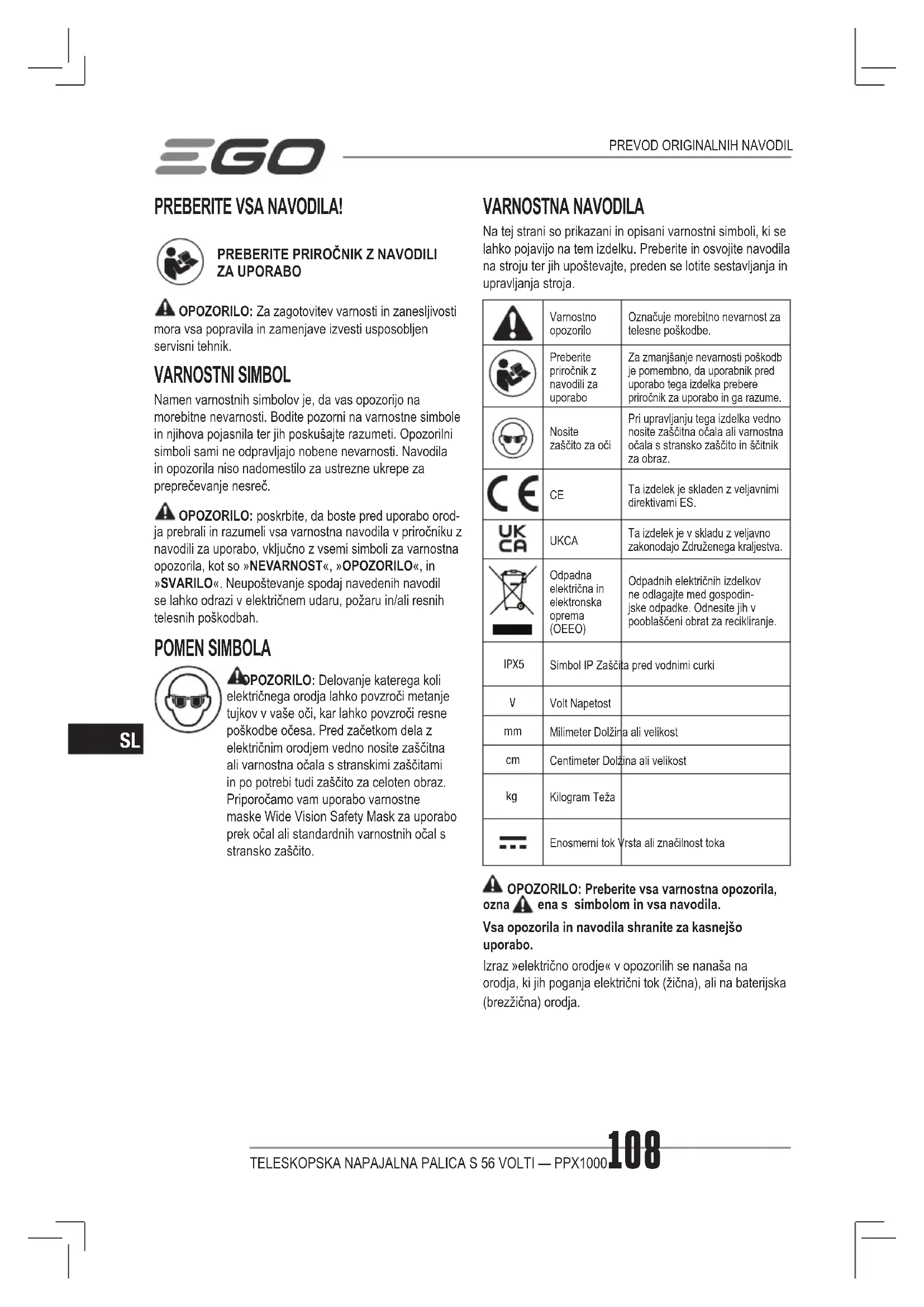 ZA UPORABO OPOZORILO: Za zagotovitev varnosti in zanesljivosti mora vsa popravila in zamenjave izvesti usposobljen servisni tehnik. VARNOSTNI SIMBOL Namen varnostnih simbolov je, da vas opozorijo na morebitne nevarnosti. Bodite pozorni na varnostne simbole in njihova pojasnila ter jih poskušajte razumeti. Opozorilni simboli sami ne odpravljajo nobene nevarnosti. Navodila in opozorila niso nadomestilo za ustrezne ukrepe za preprečevanje nesreč. OPOZORILO: poskrbite, da boste pred uporabo orod- ja prebrali in razumeli vsa varnostna navodila v priročniku z navodili za uporabo, vključno z vsemi simboli za varnostna opozorila, kot so »NEVARNOST«, »OPOZORILO«, in »SVARILO«. Neupoštevanje spodaj navedenih navodil se lahko odrazi v električnem udaru, požaru in/ali resnih telesnih poškodbah. POMEN SIMBOLA OPOZORILO: Delovanje katerega koli električnega orodja lahko povzroči metanje tujkov v vaše oči, kar lahko povzroči resne poškodbe očesa. Pred začetkom dela z električnim orodjem vedno nosite zaščitna ali varnostna očala s stranskimi zaščitami in po potrebi tudi zaščito za celoten obraz. Priporočamo vam uporabo varnostne maske Wide Vision Safety Mask za uporabo prek očal ali standardnih varnostnih očal s stransko zaščito. VARNOSTNA NAVODILA Na tej strani so prikazani in opisani varnostni simboli, ki se lahko pojavijo na tem izdelku. Preberite in osvojite navodila na stroju ter jih upoštevajte, preden se lotite sestavljanja in upravljanja stroja. Varnostno opozoriloOznačuje morebitno nevarnost za telesne poškodbe.Preberite priročnik z navodili za uporaboZa zmanjšanje nevarnosti poškodb je pomembno, da uporabnik pred uporabo tega izdelka prebere priročnik za uporabo in ga razume.Nosite zaščito za očiPri upravljanju tega izdelka vedno nosite zaščitna očala ali varnostna očala s stransko zaščito in ščitnik za obraz. Ta izdelek je skladen z veljavnimi direktivami ES. UKCA Ta izdelek je v skladu z veljavno zakonodajo Združenega kraljestva.Odpadna električna in elektronska oprema (OEEO)Odpadnih električnih izdelkov ne odlagajte med gospodin-jske odpadke. Odnesite jih v pooblaščeni obrat za recikliranje. IPX5 Simbol IP Zaščita pred vodnimi curki Volt Napetost Milimeter Dolžina ali velikost Centimeter Dolžina ali velikost Kilogram TežaEnosmerni tok Vrsta ali značilnost toka OPOZORILO: Preberite vsa varnostna opozorila, ozna ena s simbolom in vsa navodila. Vsa opozorila in navodila shranite za kasnejšo uporabo. Izraz »električno orodje« v opozorilih se nanaša na orodja, ki jih poganja električni tok (žična), ali na baterijska (brezžična) orodja. PREVOD ORIGINALNIH NAVODILTELESKOPSKA NAPAJALNA PALICA S 56 VOLTI — PPX1000 109