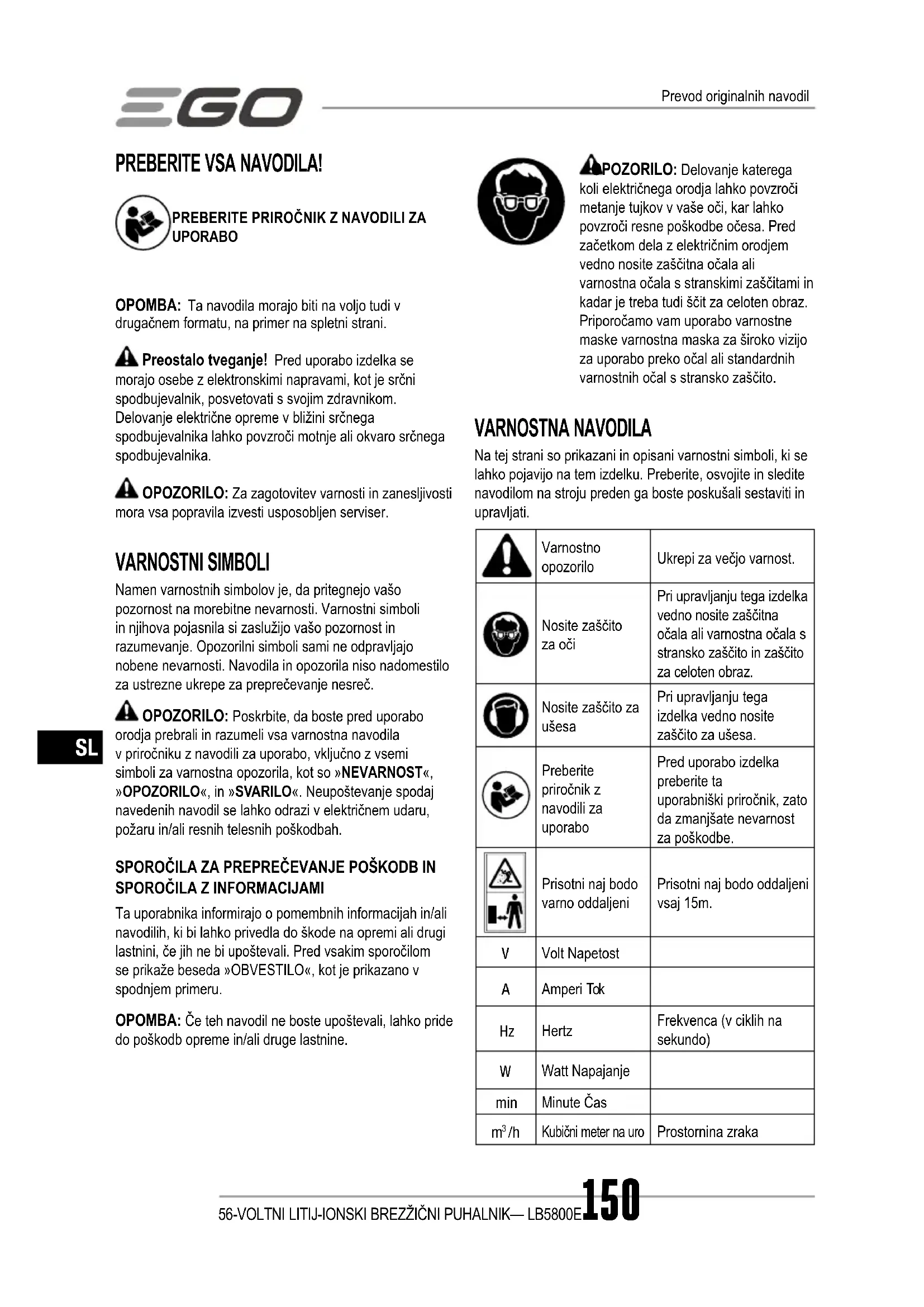 VSA NAVODILA! USPOSABLJANJE ◾ Naprave naj nikoli ne upravljajo otroci, osebe z zmanjšanimi zičnimi, senzornimi ali mentalnimi sposobnostmi ali osebe s premalo izkušnjami in znanja oziroma osebe, ki niso seznanjene s temi navodili. ◾ Upravljavec oziroma uporabnik je odgovoren za nesreče in tveganja za druge ljudi in lastnino.56-VOLTNI LITIJ-IONSKI BREZŽIČNI PUHALNIK — LB5800E