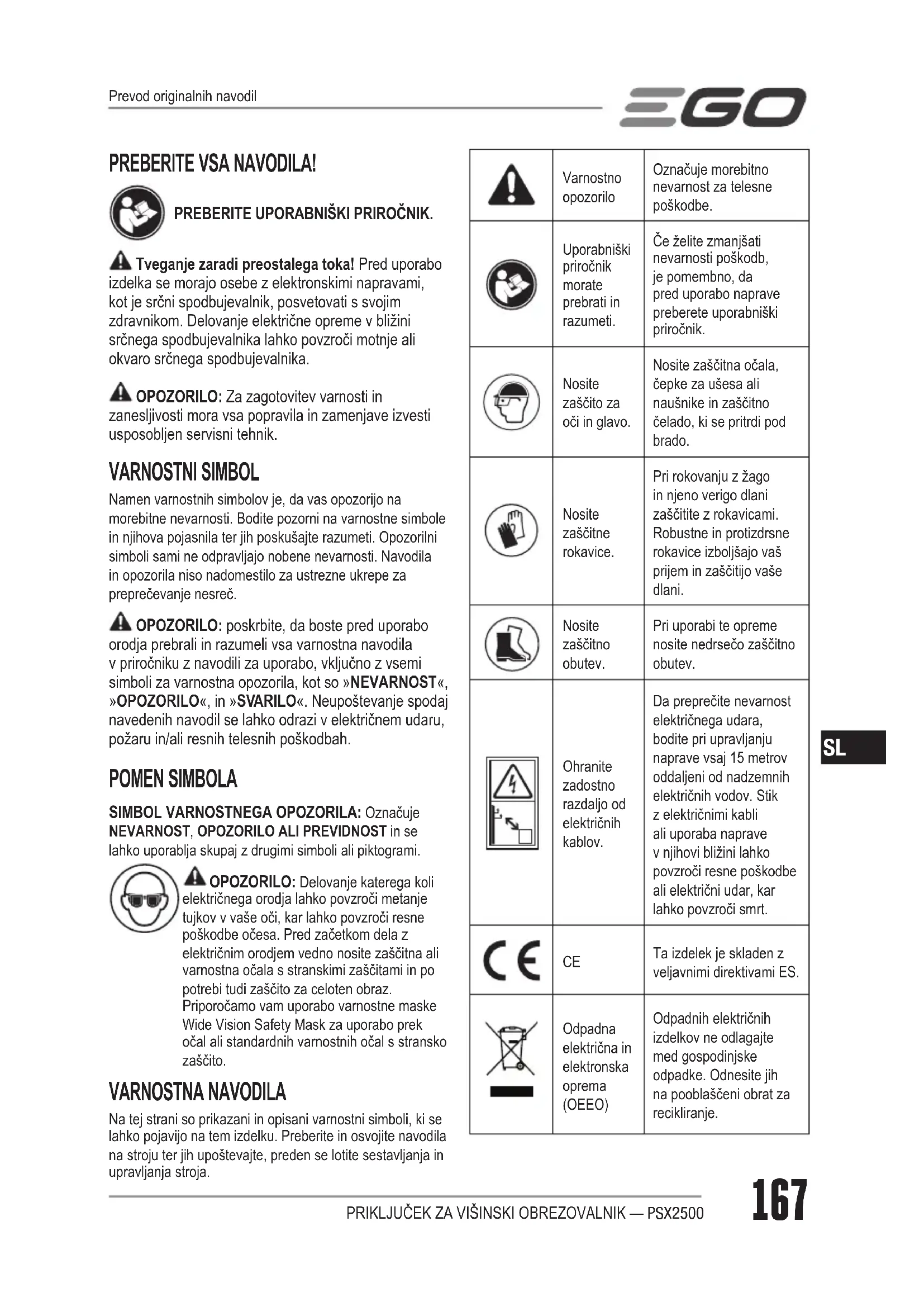 PREBERITE VSA NAVODILA! PREBERITE UPORABNIŠKI PRIROČNIK. Tveganje zaradi preostalega toka! Pred uporabo izdelka se morajo osebe z elektronskimi napravami, kot je srčni spodbujevalnik, posvetovati s svojim zdravnikom. Delovanje električne opreme v bližini srčnega spodbujevalnika lahko povzroči motnje ali okvaro srčnega spodbujevalnika. OPOZORILO: Za zagotovitev varnosti in zanesljivosti mora vsa popravila in zamenjave izvesti usposobljen servisni tehnik. VARNOSTNI SIMBOL Namen varnostnih simbolov je, da vas opozorijo na morebitne nevarnosti. Bodite pozorni na varnostne simbole in njihova pojasnila ter jih poskušajte razumeti. Opozorilni simboli sami ne odpravljajo nobene nevarnosti. Navodila in opozorila niso nadomestilo za ustrezne ukrepe za preprečevanje nesreč. OPOZORILO: poskrbite, da boste pred uporabo orodja prebrali in razumeli vsa varnostna navodila v priročniku z navodili za uporabo, vključno z vsemi simboli za varnostna opozorila, kot so »NEVARNOST«, »OPOZORILO«, in »SVARILO«. Neupoštevanje spodaj navedenih navodil se lahko odrazi v električnem udaru, požaru in/ali resnih telesnih poškodbah. POMEN SIMBOLA SIMBOL VARNOSTNEGA OPOZORILA: Označuje NEVARNOST, OPOZORILO ALI PREVIDNOST in se lahko uporablja skupaj z drugimi simboli ali piktogrami. OPOZORILO: Delovanje katerega koli električnega orodja lahko povzroči metanje tujkov v vaše oči, kar lahko povzroči resne poškodbe očesa. Pred začetkom dela z električnim orodjem vedno nosite zaščitna ali varnostna očala s stranskimi zaščitami in po potrebi tudi zaščito za celoten obraz. Priporočamo vam uporabo varnostne maske Wide Vision Safety Mask za uporabo prek očal ali standardnih varnostnih očal s stransko zaščito. VARNOSTNA NAVODILA Na tej strani so prikazani in opisani varnostni simboli, ki se lahko pojavijo na tem izdelku. Preberite in osvojite navodila na stroju ter jih upoštevajte, preden se lotite sestavljanja in upravljanja stroja. Varnostno opozorilo Označuje morebitno nevarnost za telesne poškodbe. Uporabniški priročnik morate prebrati in razumeti. Če želite zmanjšati nevarnosti poškodb, je pomembno, da pred uporabo naprave preberete uporabniški priročnik. Nosite zaščito za oči in glavo. Nosite zaščitna očala, čepke za ušesa ali naušnike in zaščitno čelado, ki se pritrdi pod brado. Nosite zaščitne rokavice. Pri rokovanju z žago in njeno verigo dlani zaščitite z rokavicami. Robustne in protizdrsne rokavice izboljšajo vaš prijem in zaščitijo vaše dlani. Nosite zaščitno obutev. Pri uporabi te opreme nosite nedrsečo zaščitno obutev. Ohranite zadostno razdaljo od električnih kablov. Da preprečite nevarnost električnega udara, bodite pri upravljanju naprave vsaj 15 metrov oddaljeni od nadzemnih električnih vodov. Stik z električnimi kabli ali uporaba naprave v njihovi bližini lahko povzroči resne poškodbe ali električni udar, kar lahko povzroči smrt.