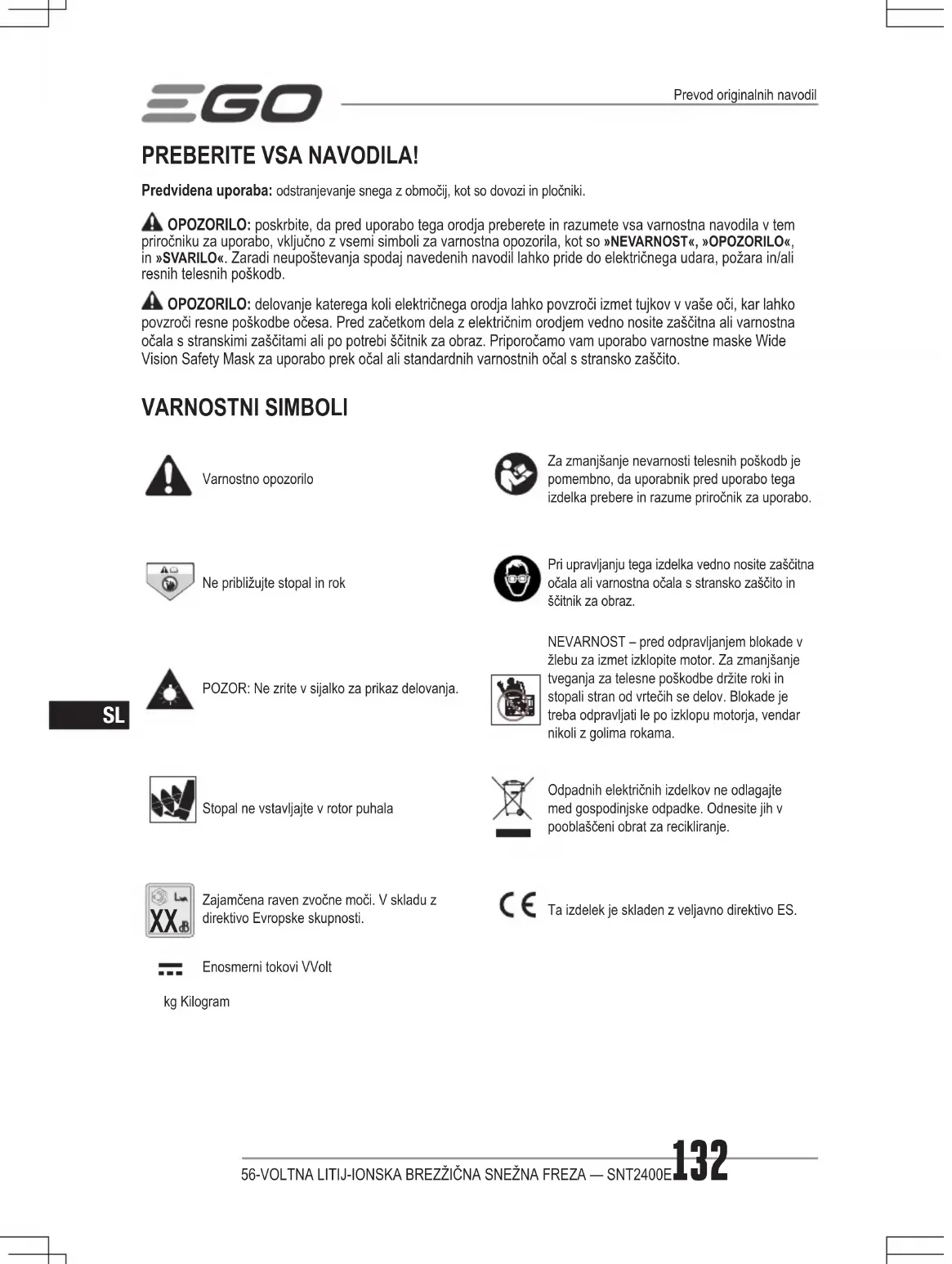 PREBERITE VSA NAVODILA! Predvidena uporaba: odstranjevanje snega z območij, kot so dovozi in pločniki. OPOZORILO: poskrbite, da pred uporabo tega orodja preberete in razumete vsa varnostna navodila v tem priročniku za uporabo, vključno z vsemi simboli za varnostna opozorila, kot so »NEVARNOST«, »OPOZORILO«, in »SVARILO«. Zaradi neupoštevanja spodaj navedenih navodil lahko pride do električnega udara, požara in/ali resnih telesnih poškodb. OPOZORILO: delovanje katerega koli električnega orodja lahko povzroči izmet tujkov v vaše oči, kar lahko povzroči resne poškodbe očesa. Pred začetkom dela z električnim orodjem vedno nosite zaščitna ali varnostna očala s stranskimi zaščitami ali po potrebi ščitnik za obraz. Priporočamo vam uporabo varnostne maske Wide Vision Safety Mask za uporabo prek očal ali standardnih varnostnih očal s stransko zaščito. VARNOSTNI SIMBOLI Varnostno opozoriloZa zmanjšanje nevarnosti telesnih poškodb je pomembno, da uporabnik pred uporabo tega izdelka prebere in razume priročnik za uporabo.Ne približujte stopal in rokPri upravljanju tega izdelka vedno nosite zaščitna očala ali varnostna očala s stransko zaščito in ščitnik za obraz.POZOR: Ne zrite v sijalko za prikaz delovanja.NEVARNOST – pred odpravljanjem blokade v žlebu za izmet izklopite motor. Za zmanjšanje tveganja za telesne poškodbe držite roki in stopali stran od vrtečih se delov. Blokade je treba odpravljati le po izklopu motorja, vendar nikoli z golima rokama.Stopal ne vstavljajte v rotor puhalaOdpadnih električnih izdelkov ne odlagajte med gospodinjske odpadke. Odnesite jih v pooblaščeni obrat za recikliranje.