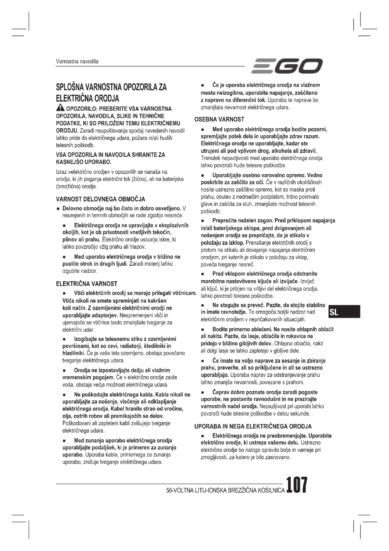 KOSILNICO NEVARNOST: Ta stroj je bil izdelan za upravljanje v skladu s pravili za varno upravljanje v tem priročniku. S to vrsto naprav lahko brezbrižnost ali napaka s strani upravljavca vodita v resno poškodbo. Ta stroj lahko povzroči poškodbe dlani in stopal ter metanje predmetov. Če teh navodil ne boste spoštovali, lahko pride do hudih poškodb ali celo smrti. OPOZORILO: Pri uporabi brezžičnih kosilnic morate vedno upoštevati osnovne previdnostne ukrepe, saj le tako lahko zmanjšate nevarnost požara, električnega udara, opeklin in telesnih poškodb. POMEMBNO PRED UPORABO NATANČNO PREBERITE. SHRANITE ZA PRIHODNJO UPORABO.VARNOSTNA PRAVILA ZA BREZŽIČNE KOSILNICE:SVARILO – NE DOTIKAJTE SE VRTEČEGA REZILA!56-VOLTNA LITIJ-IONSKA BREZŽIČNA KOSILNICA 109