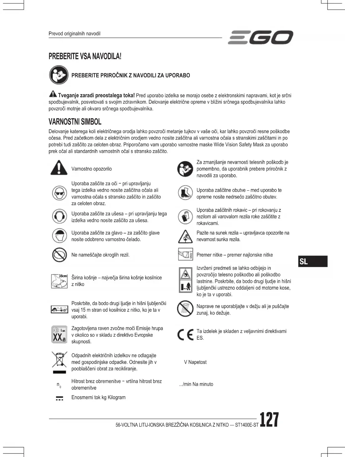 PREBERITE VSA NAVODILA! PREBERITE PRIROČNIK Z NAVODILI ZA UPORABO Tveganje zaradi preostalega toka! Pred uporabo izdelka se morajo osebe z elektronskimi napravami, kot je srčni spodbujevalnik, posvetovati s svojim zdravnikom. Delovanje električne opreme v bližini srčnega spodbujevalnika lahko povzroči motnje ali okvaro srčnega spodbujevalnika. VARNOSTNI SIMBOL Delovanje katerega koli električnega orodja lahko povzroči metanje tujkov v vaše oči, kar lahko povzroči resne poškodbe očesa. Pred začetkom dela z električnim orodjem vedno nosite zaščitna ali varnostna očala s stranskimi zaščitami in po potrebi tudi zaščito za celoten obraz. Priporočamo vam uporabo varnostne maske Wide Vision Safety Mask za uporabo prek očal ali standardnih varnostnih očal s stransko zaščito. Varnostno opozorilo Za zmanjšanje nevarnosti telesnih poškodb je pomembno, da uporabnik prebere priročnik z navodili za uporabo. Uporaba zaščite za oči − pri upravljanju tega izdelka vedno nosite zaščitna očala ali varnostna očala s stransko zaščito in zaščito za celoten obraz. Uporaba zaščitne obutve – med uporabo te opreme nosite nedrsečo zaščitno obutev. Uporaba zaščite za ušesa – pri upravljanju tega izdelka vedno nosite zaščito za ušesa. Uporaba zaščitnih rokavic – pri rokovanju z rezilom ali varovalom rezila roke zaščitite z rokavicami. Uporaba zaščite za glavo – za zaščito glave nosite odobreno varnostno čelado. Pazite na sunek rezila – upravljavca opozorite na nevarnost sunka rezila. Ne nameščajte okroglih rezil. 2.4mm Premer nitke – premer najlonske nitke 38cm 35cm Širina košnje – največja širina košnje kosilnice z nitko Izvrženi predmeti se lahko odbijejo in povzročijo telesno poškodbo ali poškodbo lastnine. Poskrbite, da bodo drugi ljudje in hišni ljubljenčki ustrezno oddaljeni od motorne kose, ko je ta v uporabi. 15m Poskrbite, da bodo drugi ljudje in hišni ljubljenčki vsaj 15 m stran od kosilnice z nitko, ko je ta v uporabi. Naprave ne uporabljajte v dežju ali je puščajte zunaj, ko dežuje.