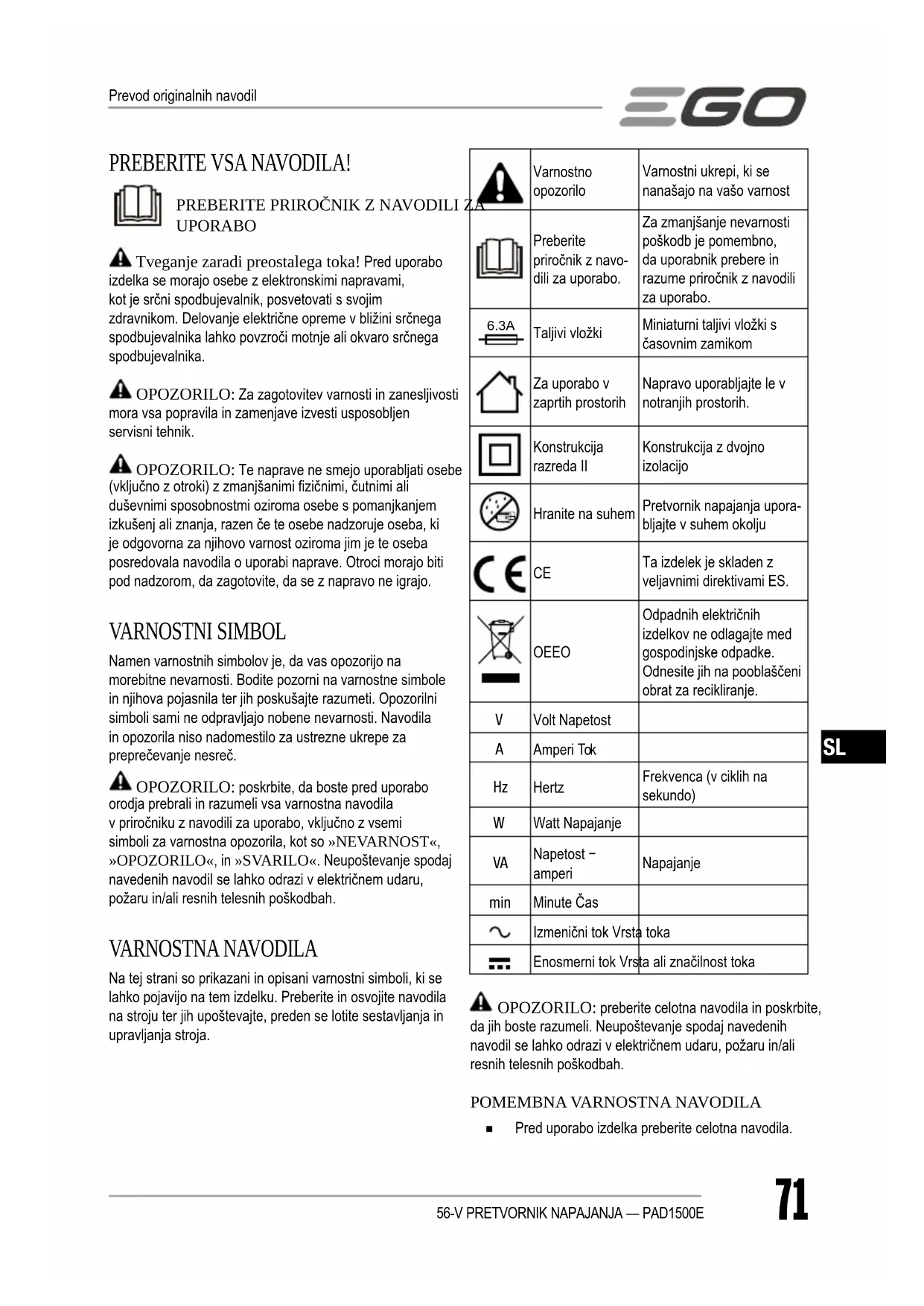 ◾ Pred uporabo izdelka preberite celotna navodila. Prevod originalnih navodil56-V PRETVORNIK NAPAJANJA — PAD1500E72