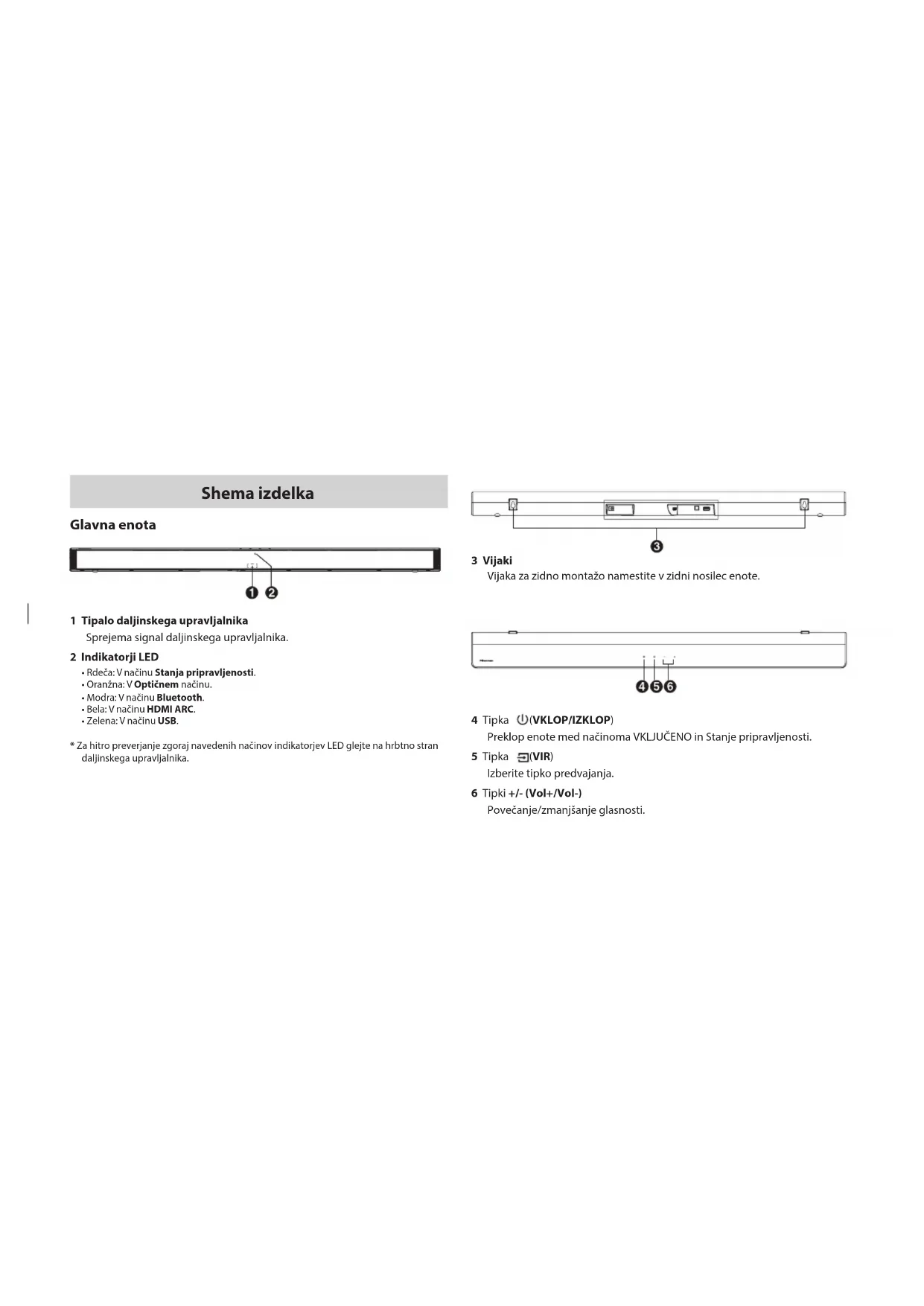Shema izdelka Glavna enota 1 Tipalo daljinskega upravljalnika Sprejema signal daljinskega upravljalnika. 2 Indikatorji LED