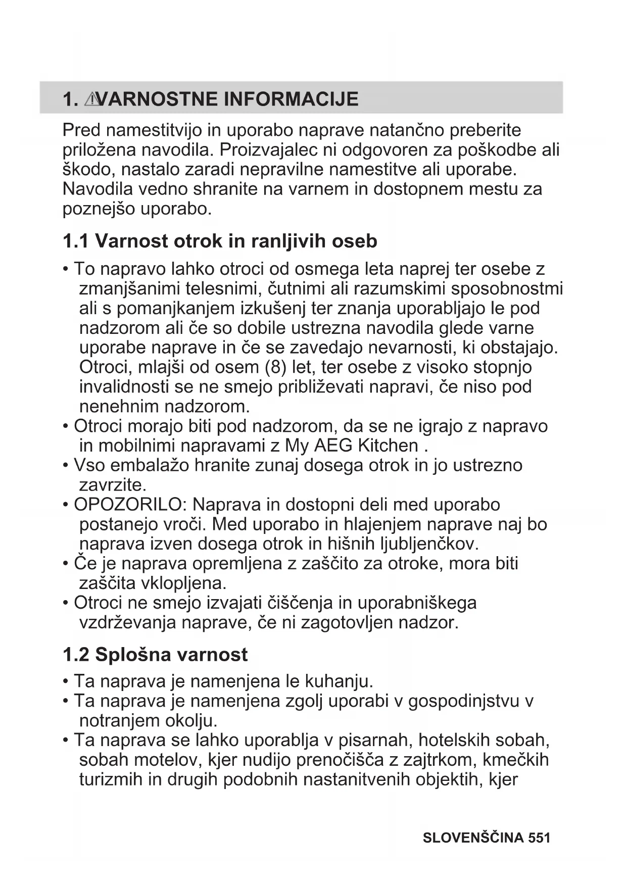- To napravo lahko otroci od osmega leta naprej ter osebe z zmanjšanimi telesnimi, čutnimi ali razumskimi sposobnostmi ali s pomanjkanjem izkušenj ter znanja uporabljajo le pod nadzorom ali če so dobile ustrezna navodila glede varne uporabe naprave in če se zavedajo nevarnosti, ki obstajajo. Otroci, mlajši od osem (8) let, ter osebe z visoko stopnjo invalidnosti se ne smejo približevati napravi, če niso pod nenehnim nadzorom.