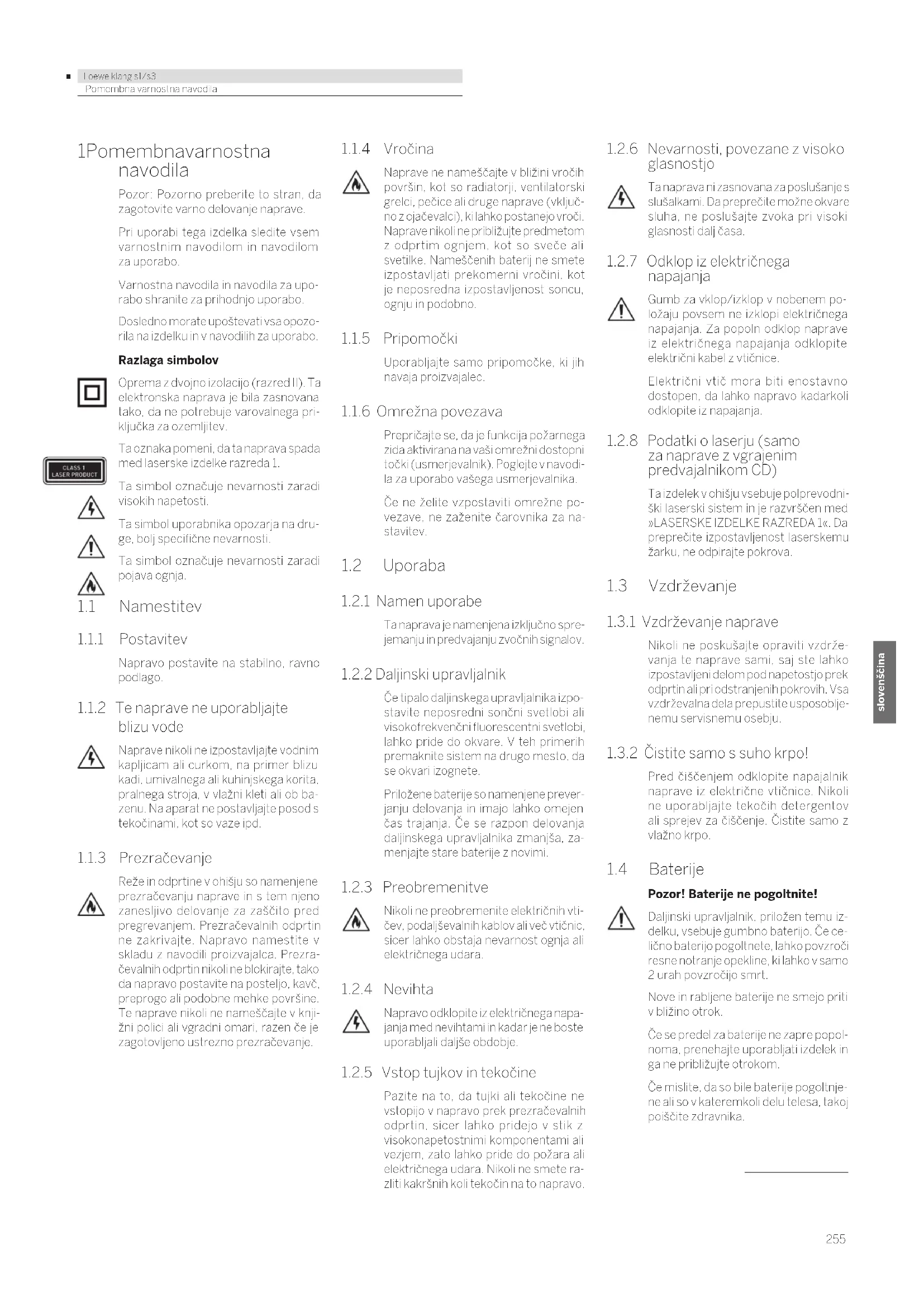 Loewe klang s1/s3 deutsch slovenščina Pomembna varnostna navodila 1 Pomembna varnostna navodila Pozor: Pozorno preberite to stran, da zagotovite varno delovanje naprave. Pri uporabi tega izdelka sledite vsem varnostnim navodilom in navodilom za uporabo. Varnostna navodila in navodila za upo- rabo shranite za prihodnjo uporabo. Dosledno morate upoštevati vsa opozo- rila na izdelku in v navodilih za uporabo. Razlaga simbolov Oprema z dvojno izolacijo (razred II). Ta elektronska naprava je bila zasnovana tako, da ne potrebuje varovalnega pri- ključka za ozemljitev. Ta oznaka pomeni, da ta naprava spada med laserske izdelke razreda 1. Ta simbol označuje nevarnosti zaradi visokih napetosti. Ta simbol uporabnika opozarja na dru- ge, bolj specifične nevarnosti. Ta simbol označuje nevarnosti zaradi pojava ognja.