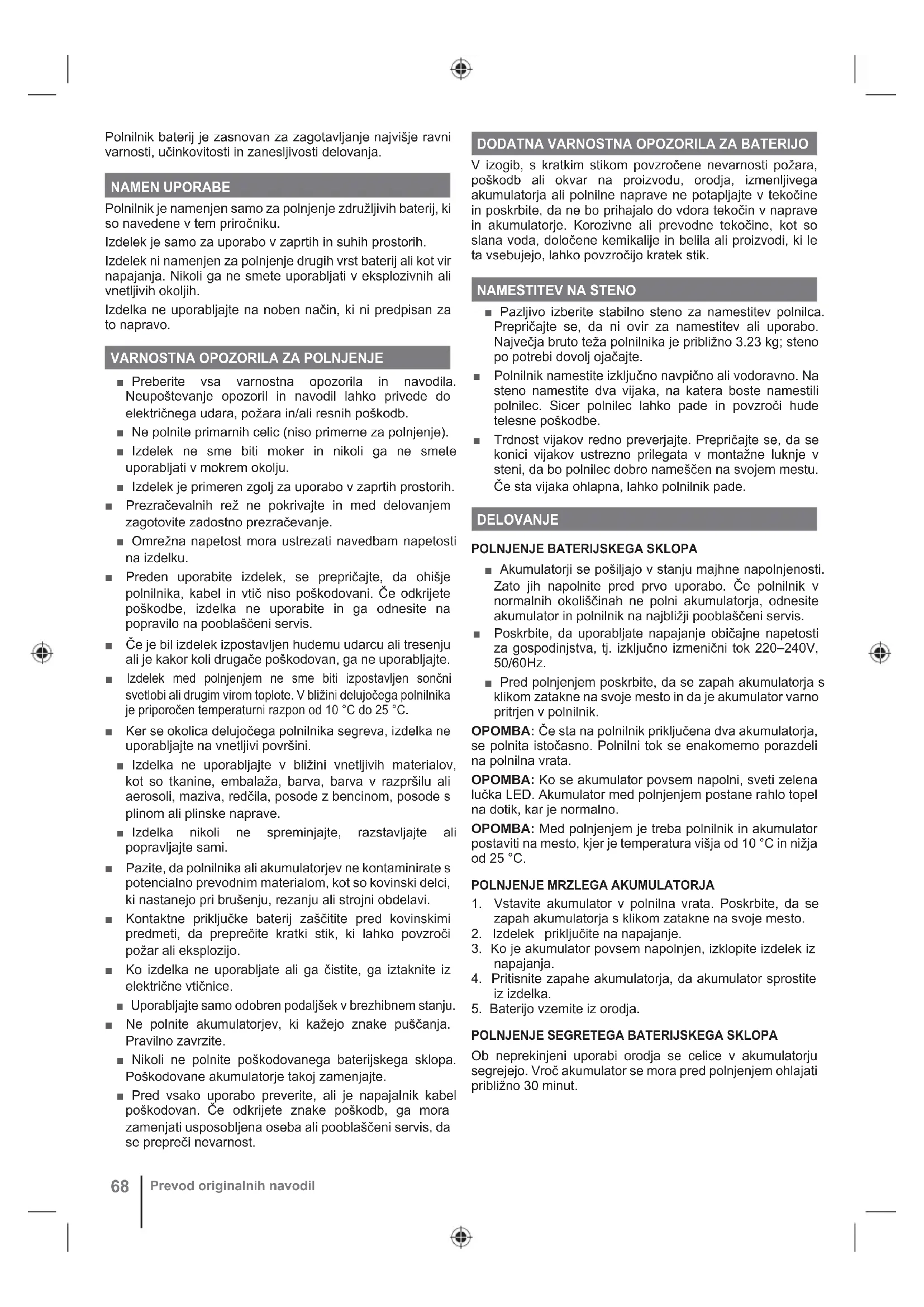 Prevod originalnih navodilVZDRŽEVANJE ■ Ko izdelka ne uporabljate oziroma ko ga čistite, ga iztaknite iz napajanja in odstranite akumulator. ■ Pri čiščenju plastičnih delov se izogibajte topilom. Večina vrst plastike je občutljivih na razne vrste komercialnih topil. Umazanijo in prah odstranite s čisto krpo ali mehko krtačko. ■ Nikoli ne dopustite, da bi zavorna tekočina, bencin, naftni izdelki in pronicajoča olja prišla v stik s plastičnimi deli. Ti izdelki vsebujejo kemikalije, ki lahko plastiko poškodujejo, oslabijo ali uničijo. ■ V notranjosti izdelka so prisotne nevarne napetosti, zato ga ne razstavljajte.