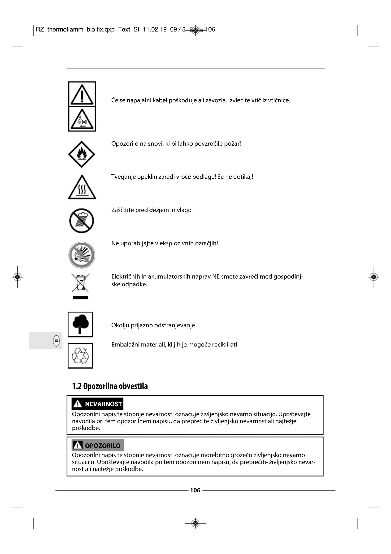 Lahko je povzročena materialna škoda, če se napravo ne uporablja pravilno. Zato morate prebrati naslednja varnostna navodila: Zaščitite napravo pred sončno svetlobo in zmrzal. OPOZORILO GNEVARNOST POZOR RZ_thermoflamm_bio fix.qxp_Text_SI 11.02.19 09:48 Seite 110111