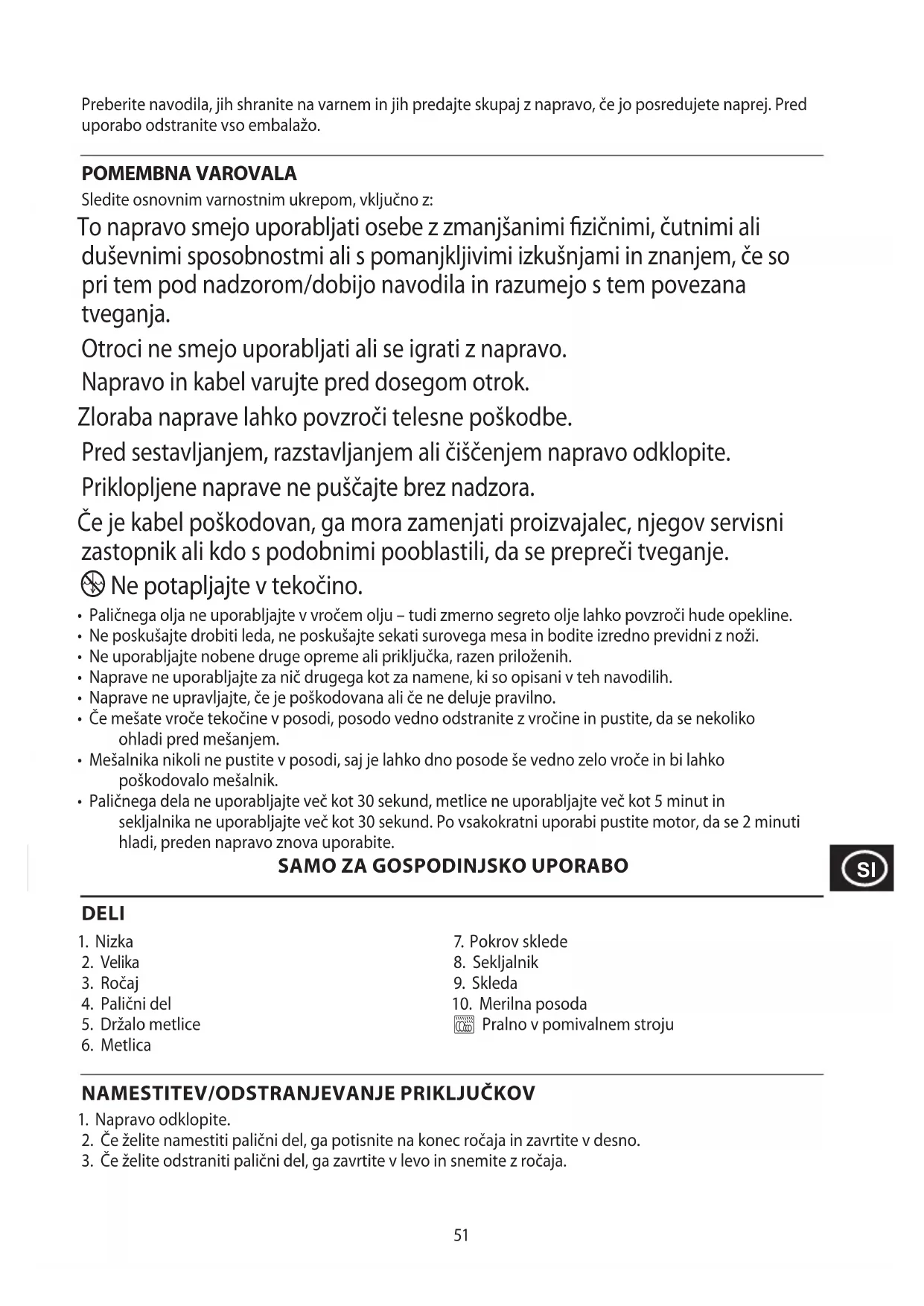 - Ne uporabljajte nobene druge opreme ali priključka, razen priloženih.