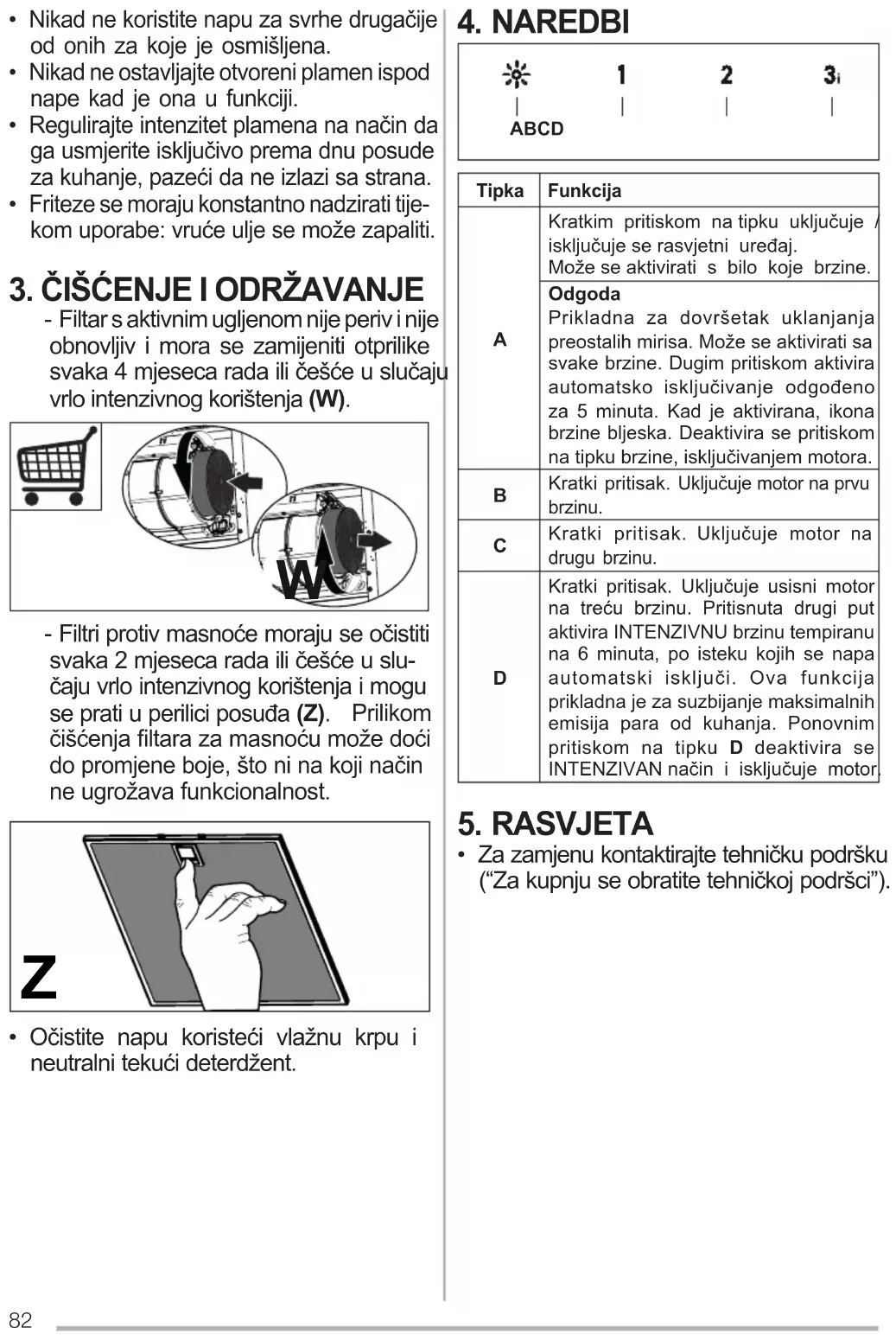 - Friteze je treba med uporabo skrbno nadzirati: pregreto olje lahko zagori. 3.ČIŠČENJEIN VZDRŽEVANJE - Filtra na aktivno oglje ni mogoče oprati in ni obnovljiv; treba ga je zamenjati po približno vsakih 4 mesecih delovanja, pri intenzivnejši uporabi nape pa tudi pogosteje (W).