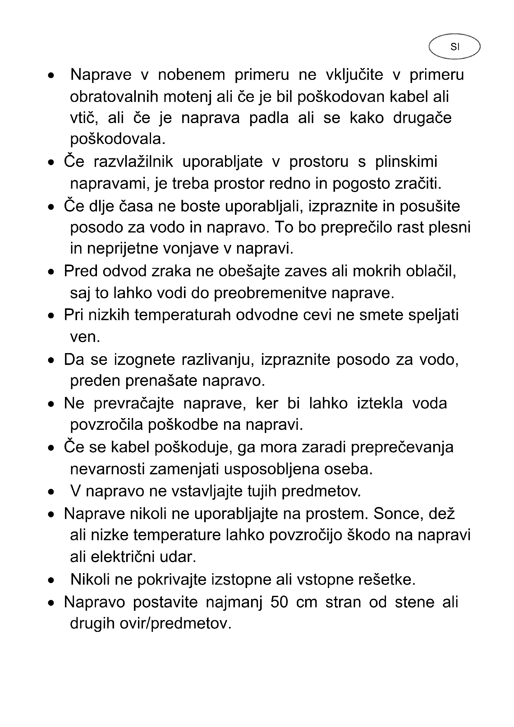 - Če razvlažilnik uporabljate v prostoru s plinskimi napravami, je treba prostor redno in pogosto zračiti.