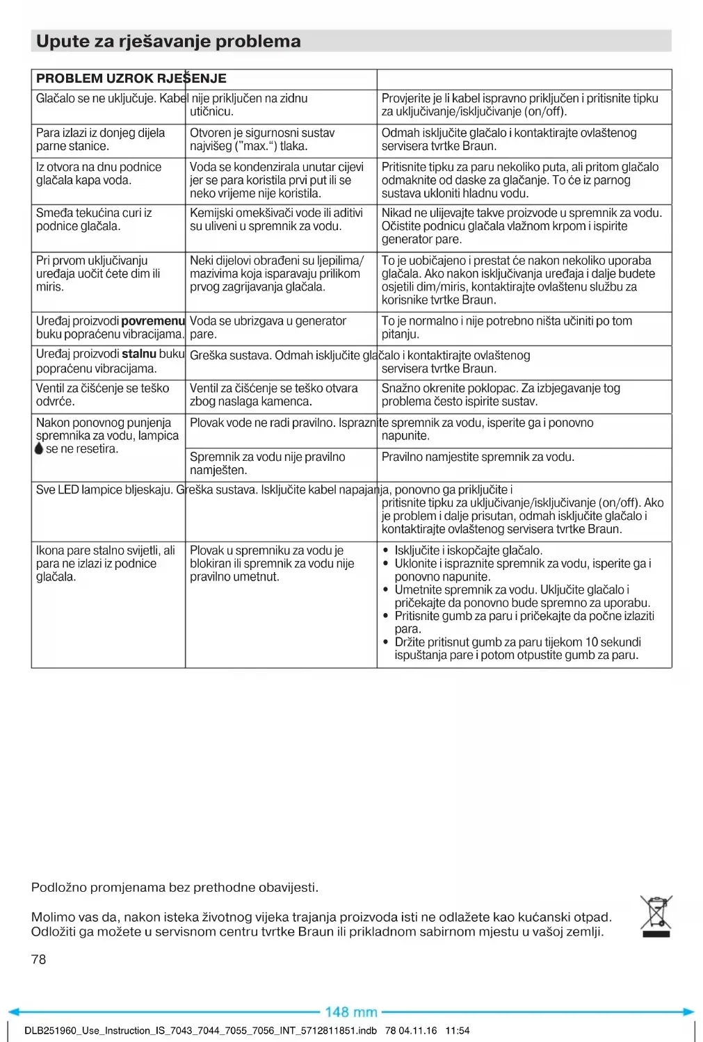 Naprava se ne vklopi. Naprava ni priključena v električno vtičnico. Prepričajte se, da je naprava pravilno priključena in pritisnite gumb za vklop/izklop. Iz predela pod osnovno enoto izhaja para. Tlačni varnostni sistem »max« se je odprl. Napravo takoj izklopite in se obrnite na pooblaščeni servis Braun. Iz odprtinic na dnu likalne plošče kaplja voda. V ceveh je voda kondenzirala, ker se para prvič uporablja ali ker je niste uporabljali dalj časa. Gumb za paro nekajkrat potisnite proč od likalne mize. S tem boste iz parnega krogotoka odstranili hladno vodo. Iz likalne plošče kaplja rjava tekočina. V posodo za vodo ste vlili kemične mehčalce vode ali aditive. V posodo za vodo nikoli ne vlivajte katerih koli sredstev. Likalno ploščo očistite z vlažno krpo in splaknite grelnik. Ko napravo prvič vklopite, zaznate dim ali vonj. Nekateri deli so bili obdelani s tesnili/mazivi, ki hlapijo, ko se likalnik prvič segreje. To je normalno in bo prenehalo, ko boste likalnik uporabljali nekaj minut. Če je dim/vonj prisoten tudi po izklopu naprave, se obrnite na pooblaščeni servis Braun. Naprava občasno oddaja šume, povezane z vibracijami. Voda se črpa v grelnik. To je normalno in vam ni treba ukrepati. Naprava stalno oddaja šume, povezane z vibracijami. Sistemska napaka. Napravo izključite iz električnega omrežja in se obrnite na pooblaščeni servis Braun. Čistilni ventil se težko odvija. Odpiranje čistilnega ventila je oteženo zaradi vodnega kamna. Pokrovček odvijte na silo. Sistem pogosto splakujte, da se izognete težavi. Ko dolijete vodo v posodo za vodo, se lučka