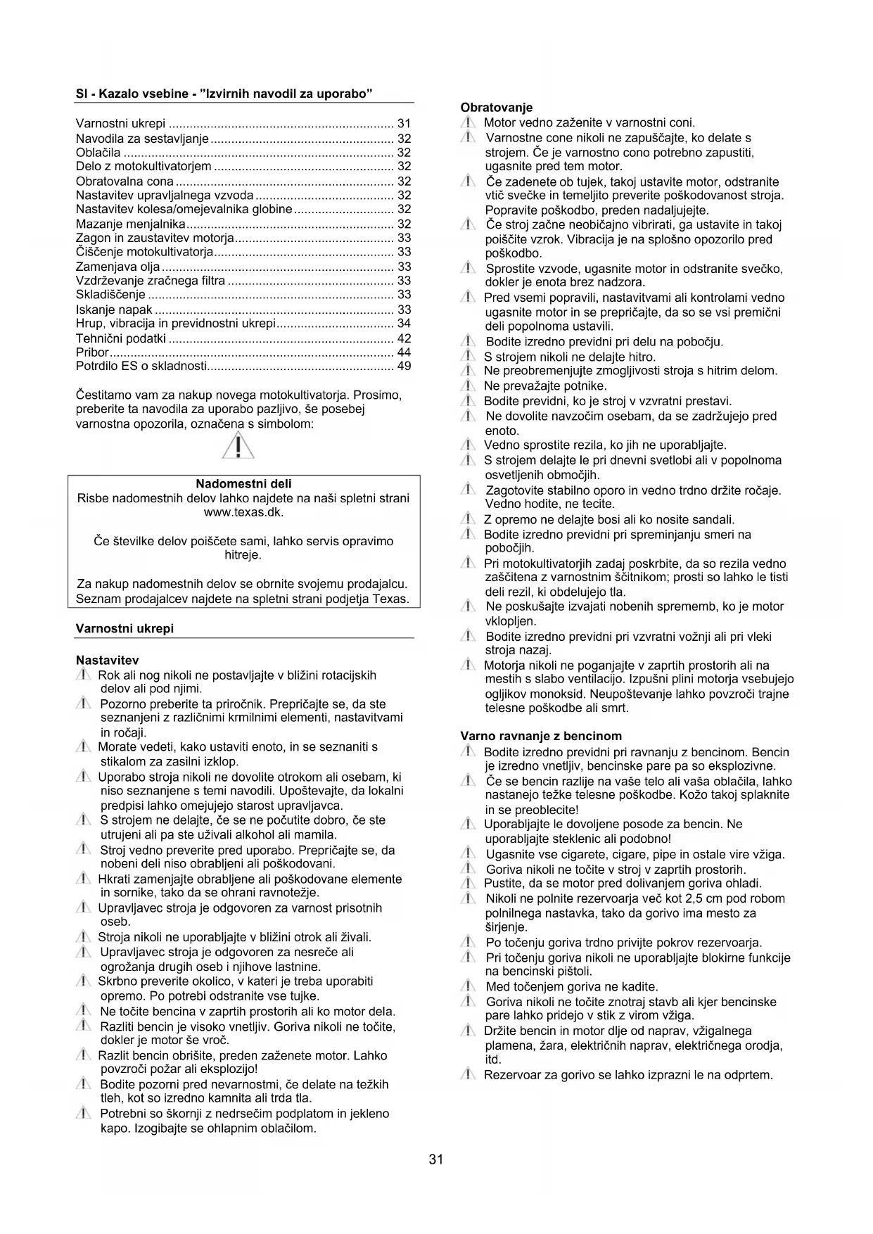 Nadomestni deli Risbe nadomestnih delov lahko najdete na naši spletni strani www.texas.dk. Če številke delov poiščete sami, lahko servis opravimo hitreje. Za nakup nadomestnih delov se obrnite svojemu prodajalcu. Seznam prodajalcev najdete na spletni strani podjetja Texas. Varnostni ukrepi Nastavitev Rok ali nog nikoli ne postavljajte v bližini rotacijskih delov ali pod njimi. Pozorno preberite ta priročnik. Prepričajte se, da ste seznanjeni z različnimi krmilnimi elementi, nastavitvami in ročaji. Morate vedeti, kako ustaviti enoto, in se seznaniti s stikalom za zasilni izklop. Uporabo stroja nikoli ne dovolite otrokom ali osebam, ki niso seznanjene s temi navodili. Upoštevajte, da lokalni predpisi lahko omejujejo starost upravljavca. S strojem ne delajte, če se ne počutite dobro, če ste utrujeni ali pa ste uživali alkohol ali mamila. Stroj vedno preverite pred uporabo. Prepričajte se, da nobeni deli niso obrabljeni ali poškodovani. Hkrati zamenjajte obrabljene ali poškodovane elemente in sornike, tako da se ohrani ravnotežje. Upravljavec stroja je odgovoren za varnost prisotnih oseb. Stroja nikoli ne uporabljajte v bližini otrok ali živali. Upravljavec stroja je odgovoren za nesreče ali ogrožanja drugih oseb i njihove lastnine. Skrbno preverite okolico, v kateri je treba uporabiti opremo. Po potrebi odstranite vse tujke. Ne točite bencina v zaprtih prostorih ali ko motor dela. Razliti bencin je visoko vnetljiv. Goriva nikoli ne točite, dokler je motor še vroč. Razlit bencin obrišite, preden zaženete motor. Lahko povzroči požar ali eksplozijo! Bodite pozorni pred nevarnostmi, če delate na težkih tleh, kot so izredno kamnita ali trda tla. Potrebni so škornji z nedrsečim podplatom in jekleno kapo. Izogibajte se ohlapnim oblačilom. Obratovanje Motor vedno zaženite v varnostni coni. Varnostne cone nikoli ne zapuščajte, ko delate s strojem. Če je varnostno cono potrebno zapustiti, ugasnite pred tem motor. Če zadenete ob tujek, takoj ustavite motor, odstranite vtič svečke in temeljito preverite poškodovanost stroja. Popravite poškodbo, preden nadaljujejte. Če stroj začne neobičajno vibrirati, ga ustavite in takoj poiščite vzrok. Vibracija je na splošno opozorilo pred poškodbo. Sprostite vzvode, ugasnite motor in odstranite svečko, dokler je enota brez nadzora. Pred vsemi popravili, nastavitvami ali kontrolami vedno ugasnite motor in se prepričajte, da so se vsi premični deli popolnoma ustavili. Bodite izredno previdni pri delu na pobočju. S strojem nikoli ne delajte hitro. Ne preobremenjujte zmogljivosti stroja s hitrim delom. Ne prevažajte potnike. Bodite previdni, ko je stroj v vzvratni prestavi. Ne dovolite navzočim osebam, da se zadržujejo pred enoto. Vedno sprostite rezila, ko jih ne uporabljajte. S strojem delajte le pri dnevni svetlobi ali v popolnoma osvetljenih območjih. Zagotovite stabilno oporo in vedno trdno držite ročaje. Vedno hodite, ne tecite. Z opremo ne delajte bosi ali ko nosite sandali. Bodite izredno previdni pri spreminjanju smeri na pobočjih. Pri motokultivatorjih zadaj poskrbite, da so rezila vedno zaščitena z varnostnim ščitnikom; prosti so lahko le tisti deli rezil, ki obdelujejo tla. Ne poskušajte izvajati nobenih sprememb, ko je motor vklopljen. Bodite izredno previdni pri vzvratni vožnji ali pri vleki stroja nazaj. Motorja nikoli ne poganjajte v zaprtih prostorih ali na mestih s slabo ventilacijo. Izpušni plini motorja vsebujejo ogljikov monoksid. Neupoštevanje lahko povzroči trajne telesne poškodbe ali smrt. Varno ravnanje z bencinom Bodite izredno previdni pri ravnanju z bencinom. Bencin je izredno vnetljiv, bencinske pare pa so eksplozivne. Če se bencin razlije na vaše telo ali vaša oblačila, lahko nastanejo težke telesne poškodbe. Kožo takoj splaknite in se preoblecite! Uporabljajte le dovoljene posode za bencin. Ne uporabljajte steklenic ali podobno! Ugasnite vse cigarete, cigare, pipe in ostale vire vžiga. Goriva nikoli ne točite v stroj v zaprtih prostorih. Pustite, da se motor pred dolivanjem goriva ohladi. Nikoli ne polnite rezervoarja več kot 2,5 cm pod robom polnilnega nastavka, tako da gorivo ima mesto za širjenje. Po točenju goriva trdno privijte pokrov rezervoarja. Pri točenju goriva nikoli ne uporabljajte blokirne funkcije na bencinski pištoli. Med točenjem goriva ne kadite. Goriva nikoli ne točite znotraj stavb ali kjer bencinske pare lahko pridejo v stik z virom vžiga. Držite bencin in motor dlje od naprav, vžigalnega plamena, žara, električnih naprav, električnega orodja, itd. Rezervoar za gorivo se lahko izprazni le na odprtem.32