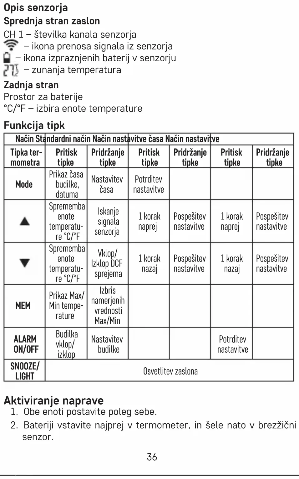 držite. Izbira enote temperature °C/°F Z večkratnim pritiskom na tipki / nastavite prikaz enote tem- perature °C ali °F.39 Režim prikaza zaslona Z večkratnim pritiskom na tipko MODE postopoma prikažete: trenutni čas – čas budilke – datum. Nastavitev budilke Z dolgim pritiskom tipke ALARM ON/OFF in tipkama / nastavite čas bujenja. Med vrednostmi se premikate s pritiskom na tipko ALARM ON/OFF. Po nastavitvi ure in minut pritisnite tipko ALARM ON/OFF. Ikona zvončka pomeni, da je budilka aktivna. Za izklop budilke pritisnite ponovno na tipko ALARM ON/OFF, ikona zvončka izgine. Funkcija dremež (snooze) in osvetlitev zaslona S tipko SNOOZE/LIGHT med zvonjenjem budilke zvonjenje premaknete za 5 minut. Na zaslonu se prikaže ikona „Zz“. Za prekinitev funkcije SNOOZE pritisnite na katerokoli tipko, razen SNOOZE/LIGHT. Če funkcije snooze ne želite uporabiti, pritisnite med zvonjenjem katerokoli tipko razen SNOOZE/LIGHT, budilka se proži naslednji dan. Zvonjenje budilke bo aktivno 2 minuti, če ne pritisnete nobene tipke, in sproži se naslednji dan. S pritiskom tipke SNOOZE/LIGHT v standardnem načinu aktivirate osvetlitev zaslona za 10 sekund. Pomnilnik izmerjenih vrednosti Z večkratnim pritiskom tipke MEM prikažete maksimalne in minimalne izmerjene vrednosti zunanje in notranje temperature. Za izbris pomnilnika pritisnite v načinu prikaza maksimalnih/minimal- nih vrednosti za dolgo tipko MEM. Skrb in vzdrževanje Izdelek je konstruiran tako, da ob primerni uporabi zanesljivo deluje vrsto let. Tukaj je nekaj nasvetov za pravilno uporabo: