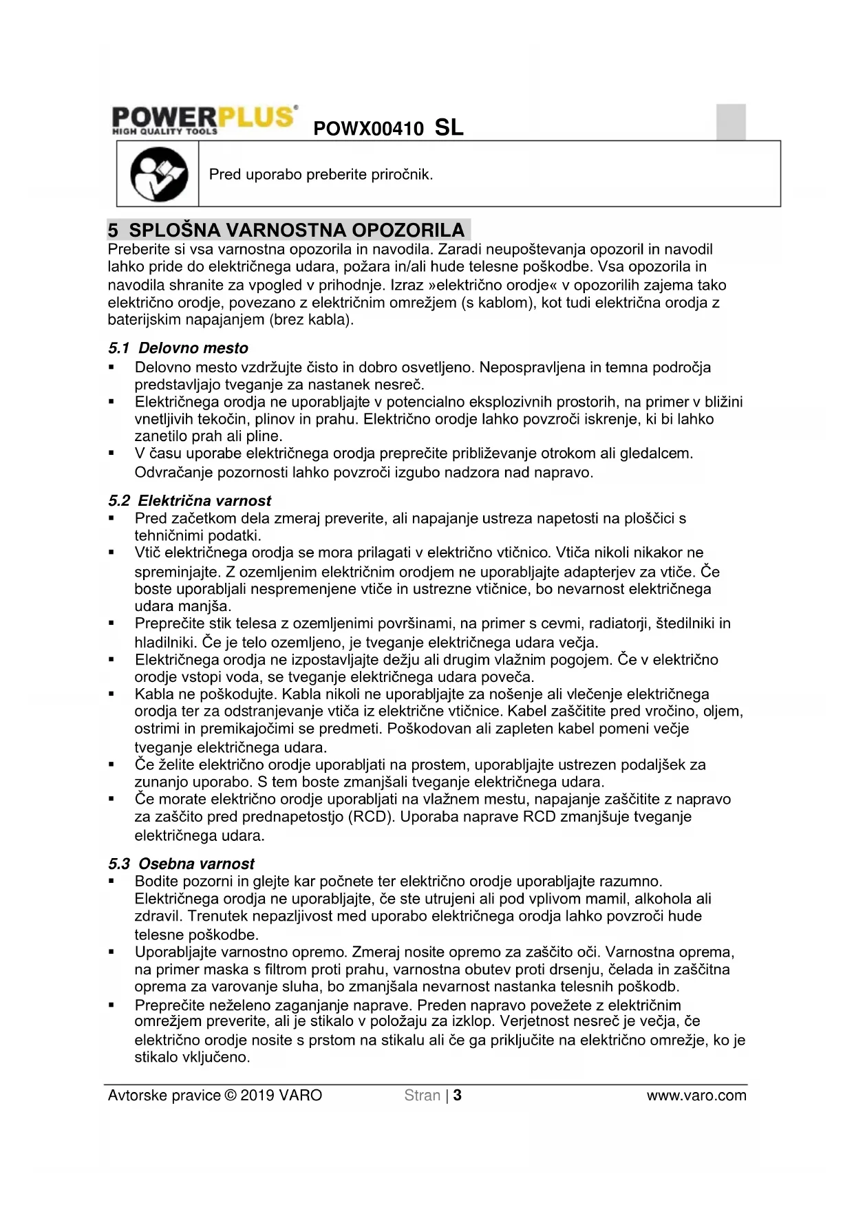 - Preprečite neželeno zaganjanje naprave. Preden napravo povežete z električnim omrežjem preverite, ali je stikalo v položaju za izklop. Verjetnost nesreč je večja, če električno orodje nosite s prstom na stikalu ali če ga priključite na električno omrežje, ko je stikalo vključeno.POWX00410 SL Avtorske pravice © 2019 VARO Stran | 4 www.varo.com