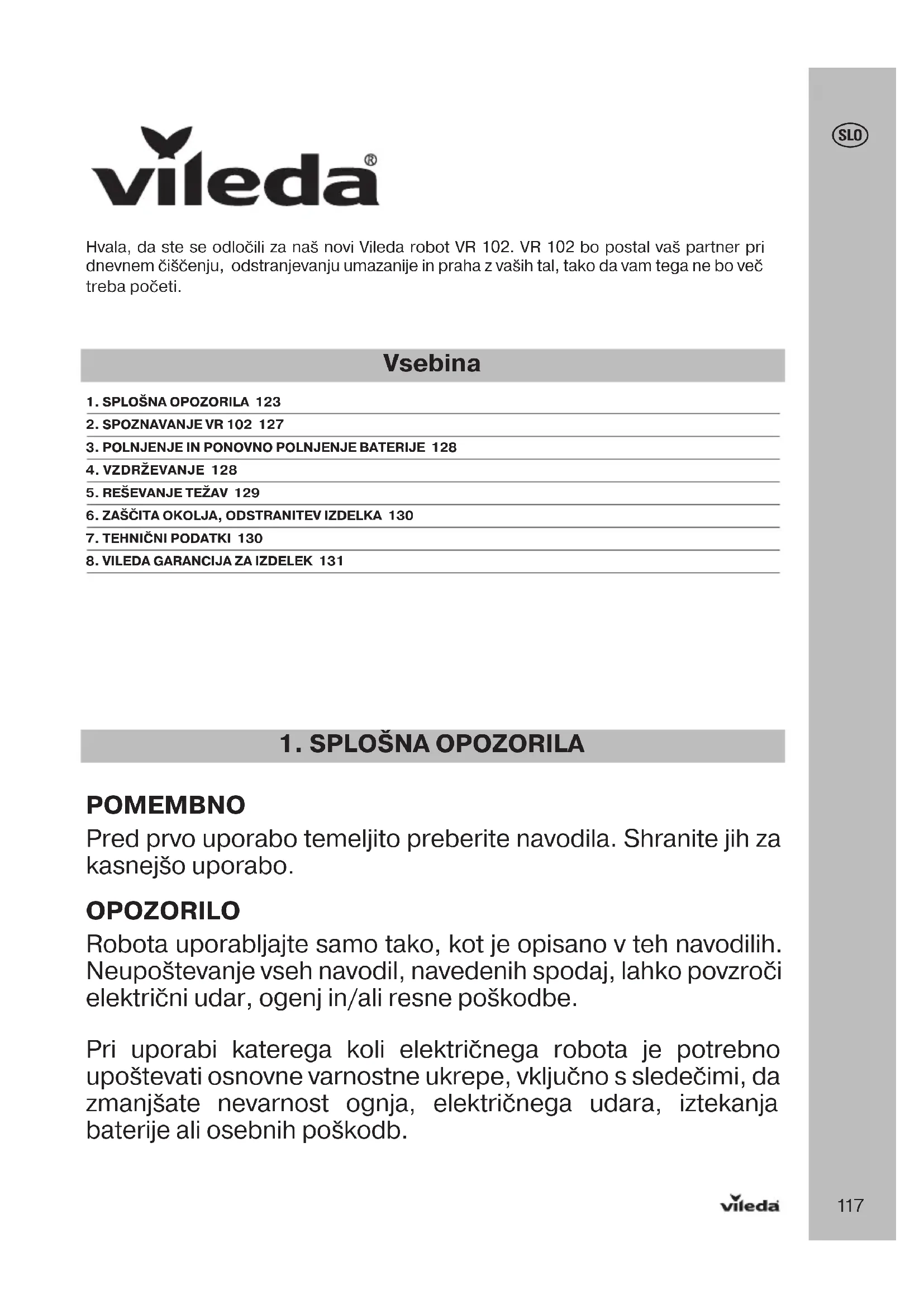 POMEMBNO Pred prvo uporabo temeljito preberite navodila. Shranite jih za kasnejšo uporabo. OPOZORILO Robota uporabljajte samo tako, kot je opisano v teh navodilih. Neupoštevanje vseh navodil, navedenih spodaj, lahko povzroči električni udar, ogenj in/ali resne poškodbe. Pri uporabi katerega koli električnega robota je potrebno upoštevati osnovne varnostne ukrepe, vključno s sledečimi, da zmanjšate nevarnost ognja, električnega udara, iztekanja baterije ali osebnih poškodb. Hvala, da ste se odločili za naš novi Vileda robot VR 102. VR 102 bo postal vaš partner pri dnevnem čiščenju, odstranjevanju umazanije in praha z vaših tal, tako da vam tega ne bo več treba početi. Vsebina 1. SPLOŠNA OPOZORILA 1232. SPOZNAVANJE VR 102 1273. POLNJENJE IN PONOVNO POLNJENJE BATERIJE 1284. VZDRŽEVANJE 1285. REŠEVANJE TEŽAV 1296. ZAŠČITA OKOLJA, ODSTRANITEV IZDELKA 1307. TEHNIČNI PODATKI 1308. VILEDA GARANCIJA ZA IZDELEK 13111 8